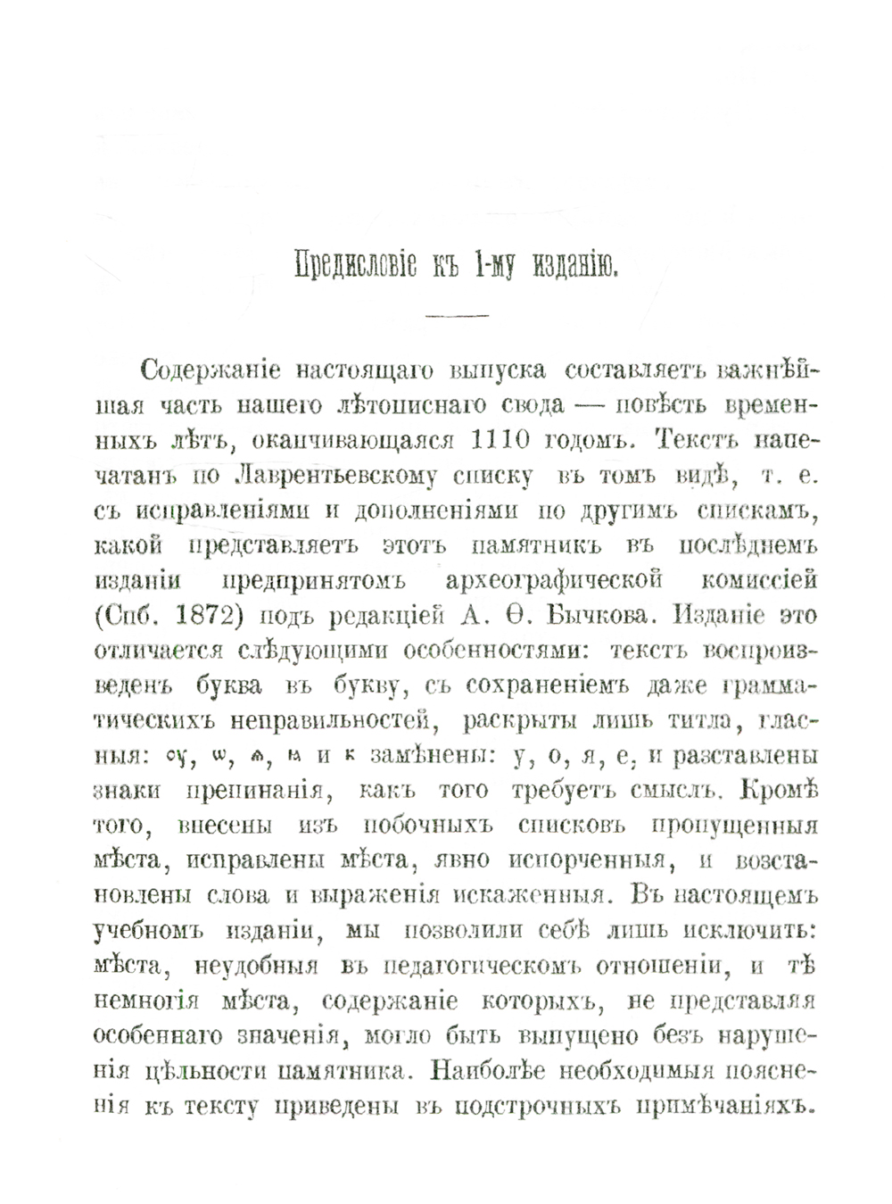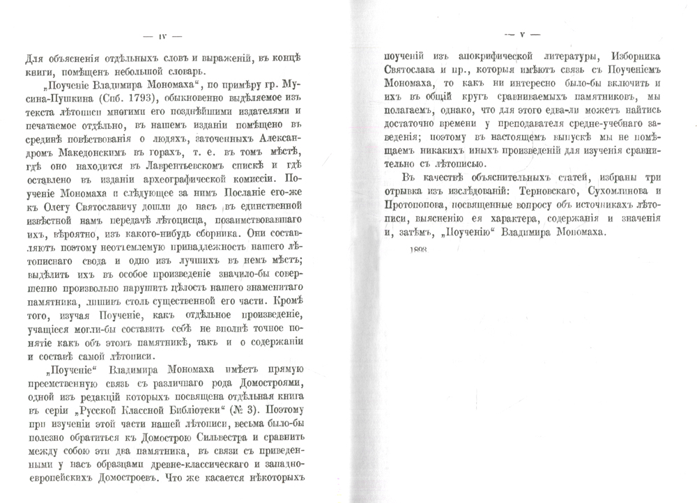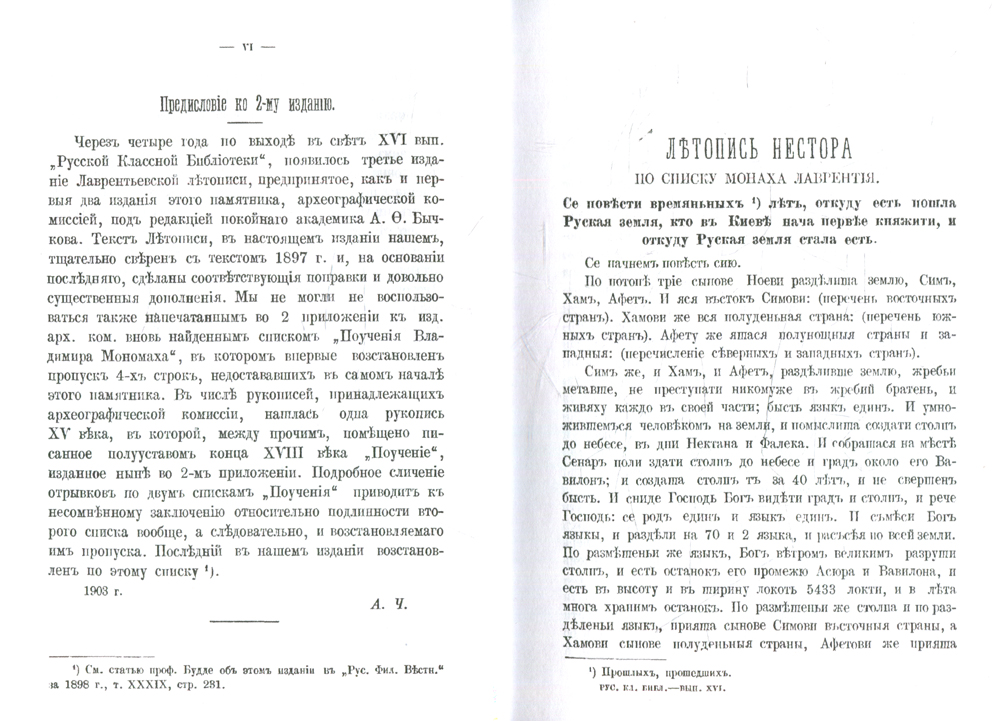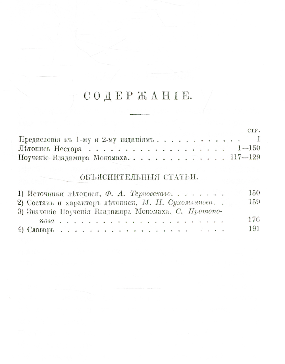 В труде русского писателя и педагога Александра Николаевича Чудинова помещены текст летописи Нестора по Лаврентьевскому списку, «Поучение Владимира Мономаха», три пояснительные статьи, а также словарь. В данном издании, в отличие от академического, нет большого числа отсылок к прочим вариантам источников, однако текст воспроизведен в прежнем виде, не считая замены славянских букв на соответствующие буквы русского алфавита и изменения пунктуации для передачи должного смысла. Наибольший интерес представляет «Повесть временных лет», написанная Нестором Летописцем в Киеве в 1110-х годах и составившая основу большинства более поздних русских летописей. В ней рассказывается история Руси, начиная с библейских времен и заканчивая 1117 годом. Воспроизведено в оригинальной авторской орфографии издания 1903 года (СПб. : Тип. Глазунова, 1903. - 219 с.).