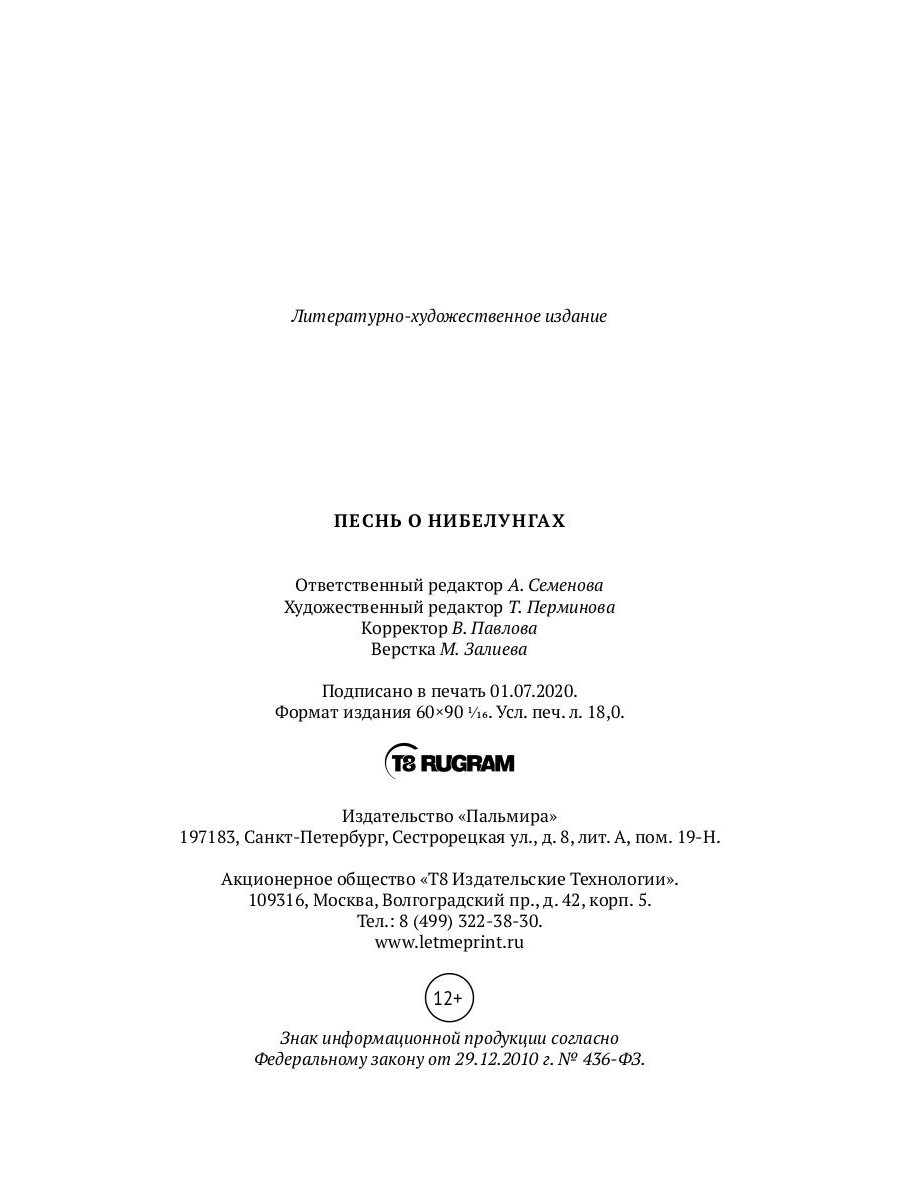 Прозаический пересказ средневековой германской эпической поэмы «Песнь о нибелунгах», написанной неизвестным автором в конце XII - начале XIII века.| Издательство | Т8 RUGRAM |
