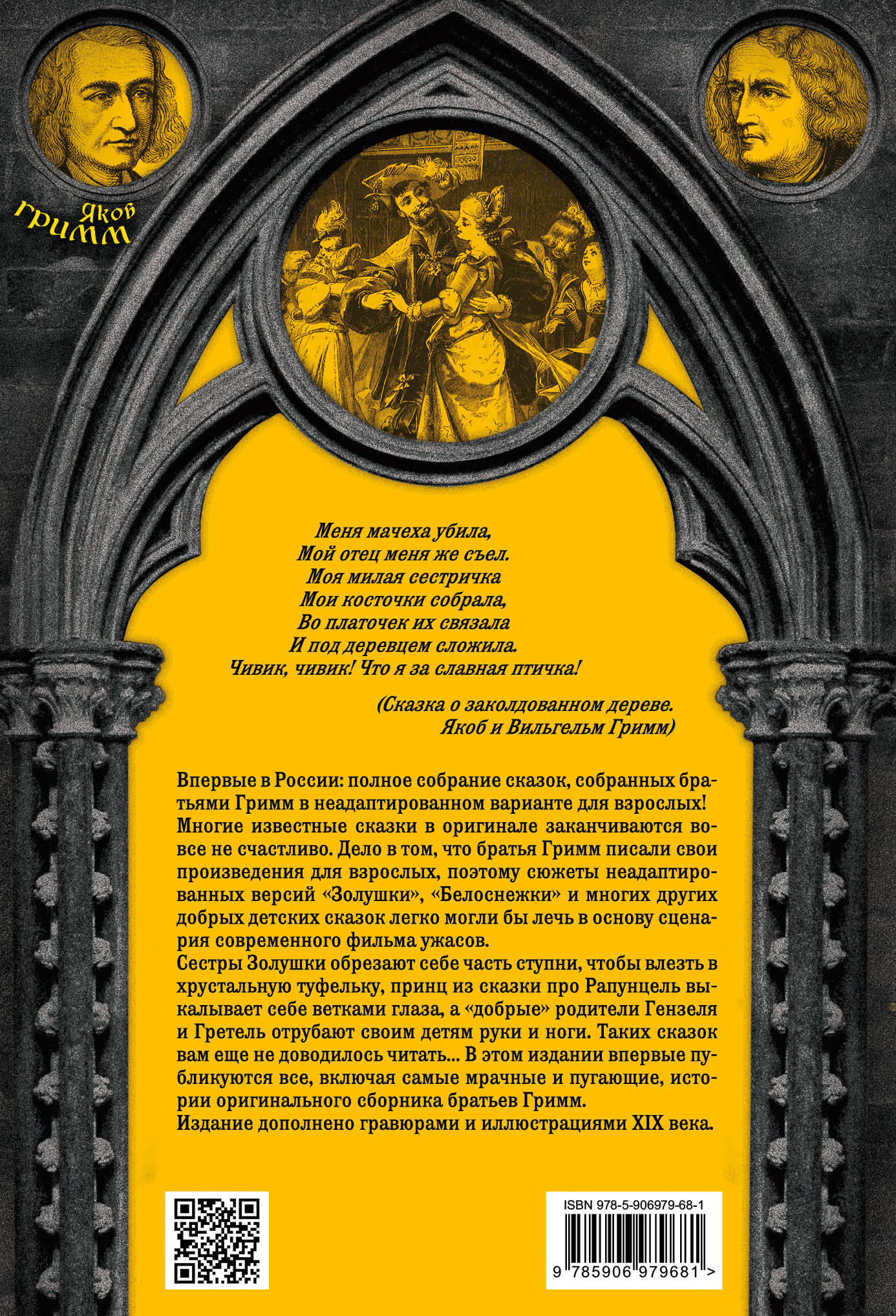 Меня мачеха убила, Мой отец меня же съел. Моя милая сестричка Мои косточки собрала, Во платочек их связала И под деревцем сложила. Чивик, чивик! Что я за славная птичка! («Сказка о заколдованном дереве». Якоб и Вильгельм Гримм) Впервые в России: полное собрание сказок, собранных Братьями Гримм, в неадаптированном варианте для взрослых! Многие известные сказки в оригинале заканчиваются вовсе не счастливо. Дело в том, что Братья Гримм писали свои произведения для взрослых, поэтому сюжеты неадаптированных версий «Золушки», «Белоснежки» и многих других добрых детских сказок легко могли бы лечь в основу сценария современного фильма ужасов. Сестры Золушки обрезают себе часть ступни, чтобы влезть в хрустальную туфельку, принц из сказки про Рапунцель выкалывает себе ветками глаза, а «добрые» родители Гензеля и Гретель отрубают своим детям руки и ноги. Таких сказок вам еще не доводилось читать… В этом издании впервые публикуются все, включая самые мрачные и пугающие истории оригинального сборника Братьев Гримм. Издание дополнено гравюрами и иллюстрациями XIX века.