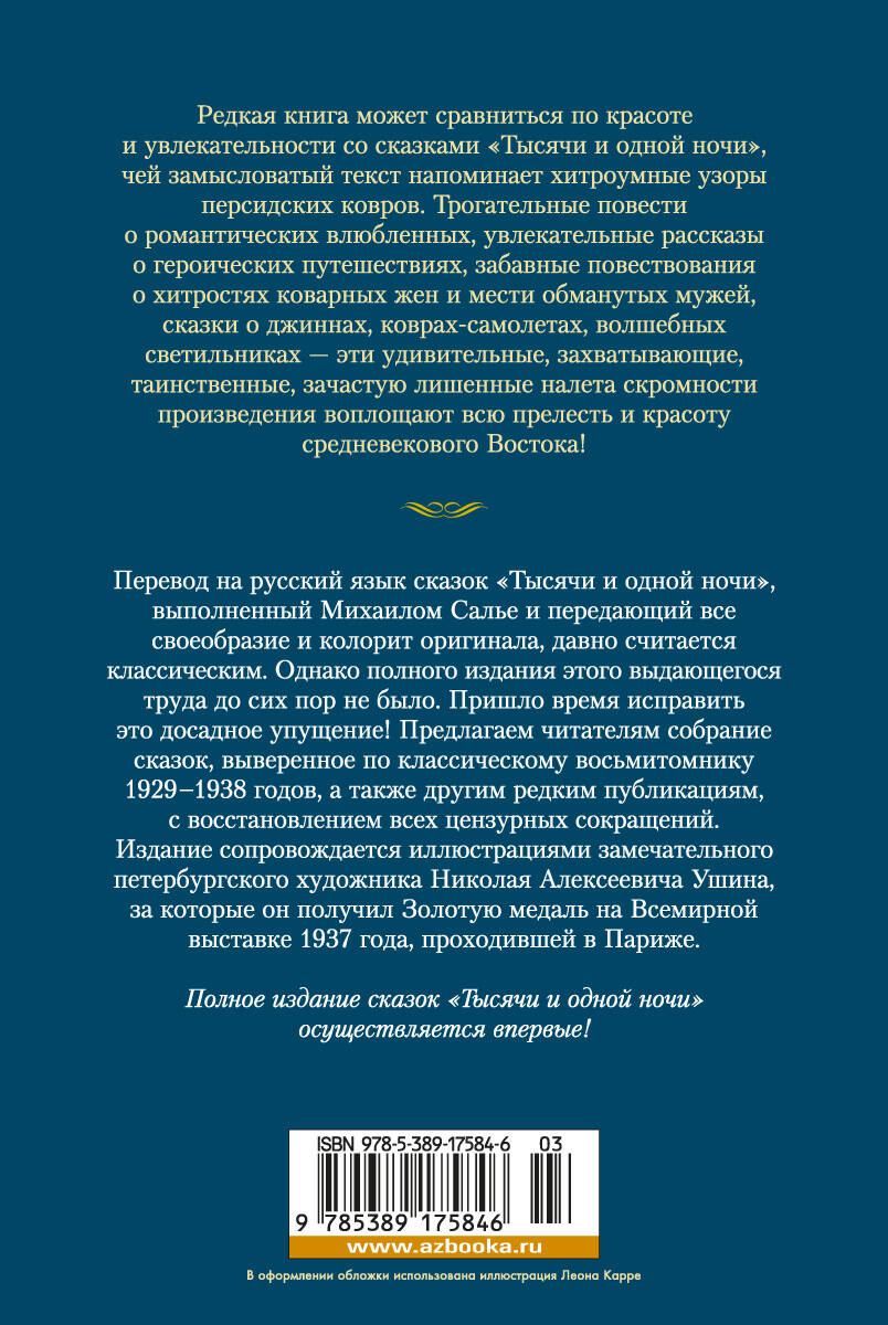 Редкая книга может сравниться по красоте и увлекательности со сказками "Тысячи и одной ночи", чей замысловатый текст напоминает хитроумные узоры персидских ковров. Трогательные повести о романтических влюбленных, увлекательные рассказы о героических путешествиях, забавные повествования о хитростях коварных жен и мести обманутых мужей, сказки о джиннах, коврах-самолетах, волшебных светильниках - эти удивительные, захватывающие, таинственные зачастую лишенные налета скромности произведения воплощают всю прелесть и красоту средневекового Востока! Перевод на русский язык сказок "Тысячи и одной ночи", выполненный Михаилом Салье и передающий всё своеобразие и колорит оригинала, давно считается классическим. Однако полного издания этого выдающегося труда до сих пор не было. Пришло время исправить это досадное упущение! Предлагаем читателям собрание сказок, выверенное по классическому восьмитомнику 1929-1939 годов, а также другим редким публикациям, с восстановлением всех цензурных сокращений. Издание сопровождается иллюстрациями замечательного петербургского художника Николая Алексеевича Ушина, за которые он получил Золотую медаль на Всемирной выставке 1937 года, проходившей в Париже. Во вторую книгу вошли сказки, рассказанные Шахразадой в 271-719 ночи.| Издательство | Азбука-Аттикус Издат.группа ООО |