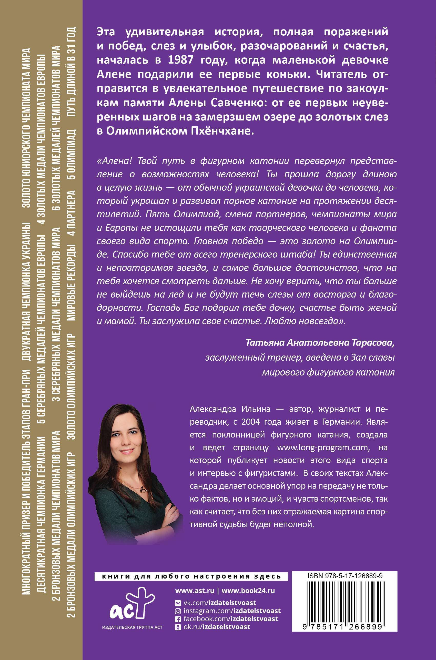 Эта удивительная история, полная поражений и побед, слез и улыбок, разочарований и счастья, началась в 1987 году, когда маленькой девочке Алене подарили ее первые коньки. Читатель отправится в увлекательное путешествие по закоулкам памяти Алены Савченко: от ее первых неуверенных шагов на замерзшем озере до золотых слез в Олимпийском Пхёнчхане.