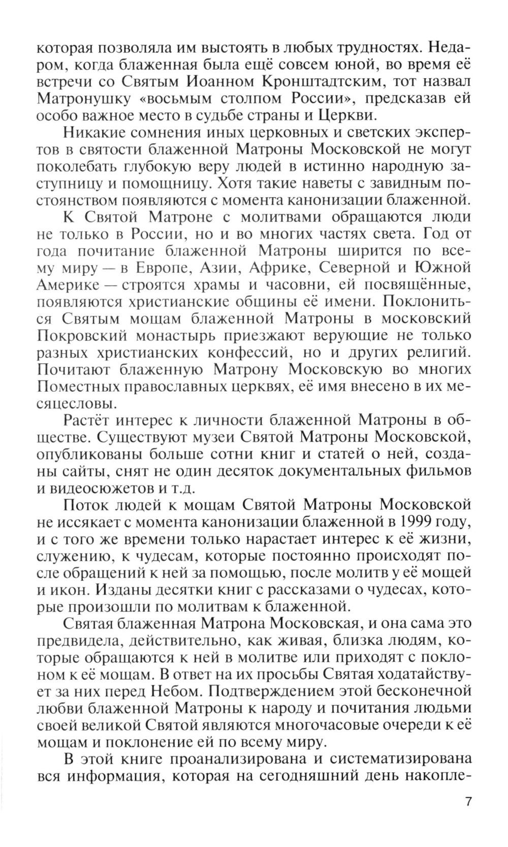 Праведная блаженная Матрона Московская - одна из самых почитаемых святых нашего времени. Ежедневно тысячи людей со всей России и из разных стран мира приезжают в Покровский монастырь в Москву, чтобы помолиться у её мощей. Для людей, почитающих Матрону Московскую, она, безусловно, Святой человек, который ходатайствует за них перед Богом. Их вера в её молитвы, в её материнскую любовь к каждому человеку абсолютна. С другой стороны, существует немало противников канонизации Матроны Московской, которые по разным причинам категорически отказываются считать её Святой. Так сложилось, что большинство книг о Матроне Московской посвящены чудесам, происходившим после обращении людей к ней за помощью. Биография Святой авторами при этом часто подробно не рассматривалась. Ирина Ордынская постаралась собрать все имеющиеся на данный момент сведения о жизни Святой Матроны и написала именно биографию любимой народом Святой. В книге в хронологическом порядке изложены события из жизни блаженной, рассказывается о её родине и родных, о её повседневной жизни, о чудесах и подвигах, о кончине, канонизации и посмертном почитании. Автор надеется, что знакомство с биографией Матроны Московской, с её реальным обликом сделает Святую ещё более близкой и дорогой сердцам людей.| Издательство | Молодая гвардия |
