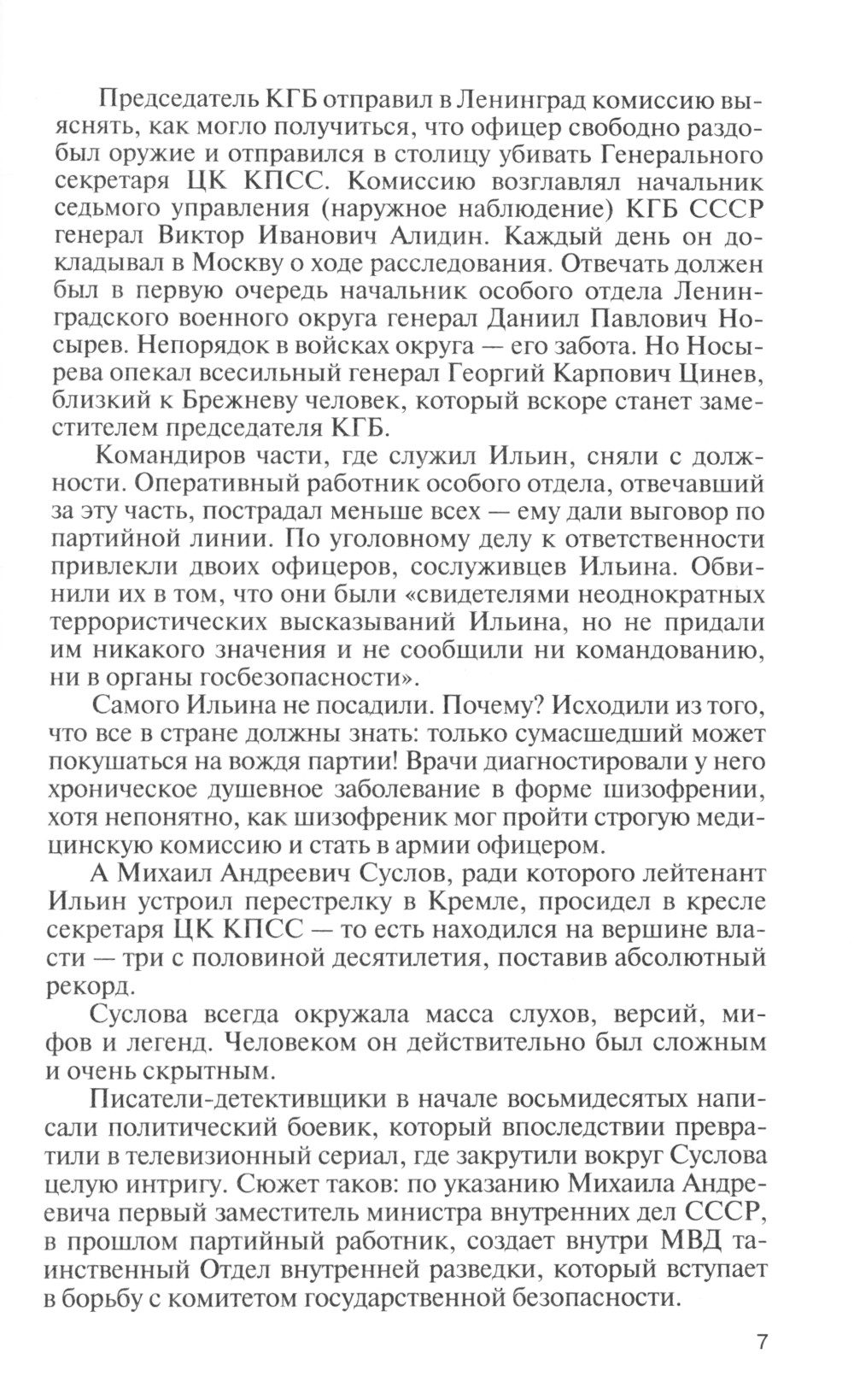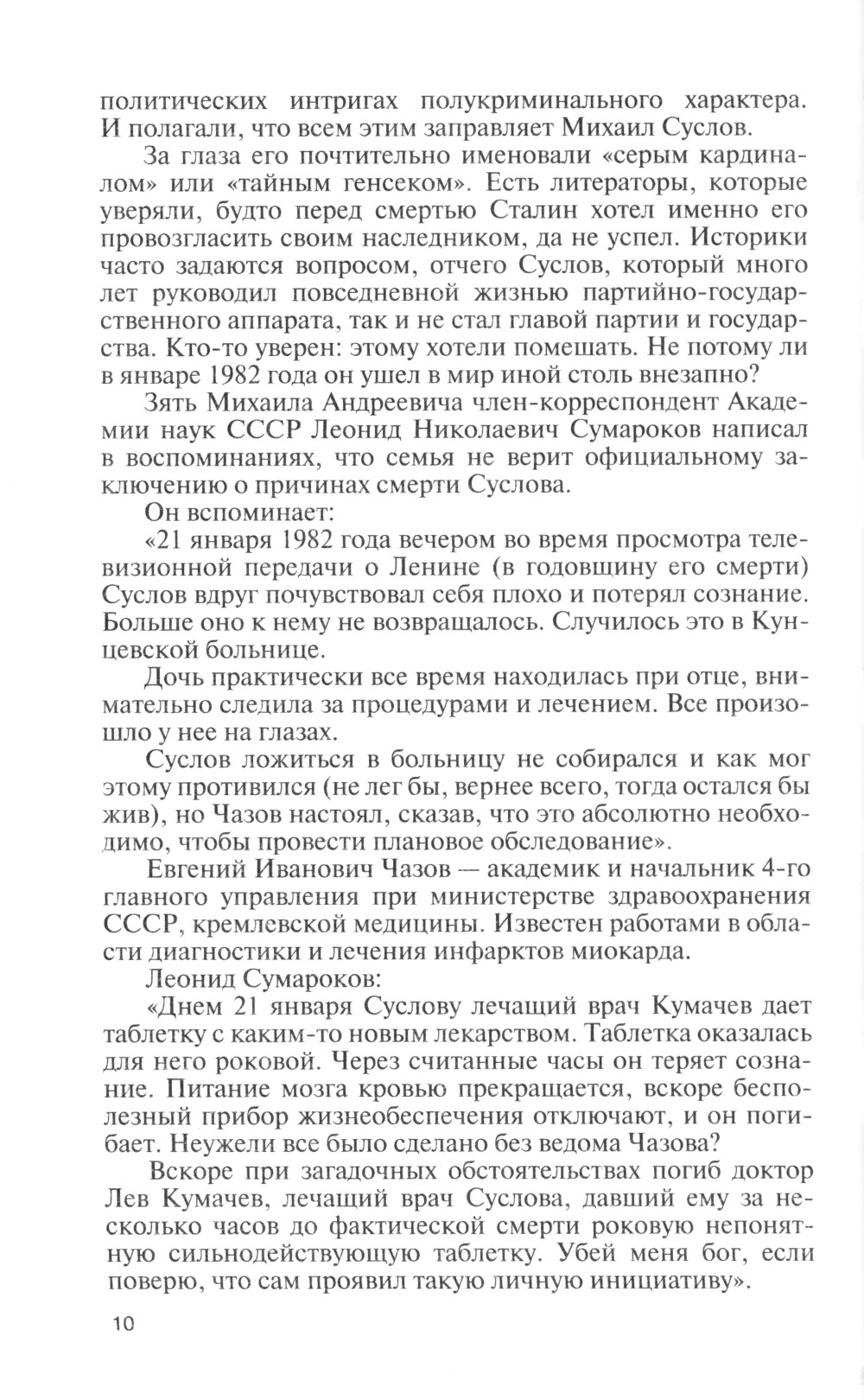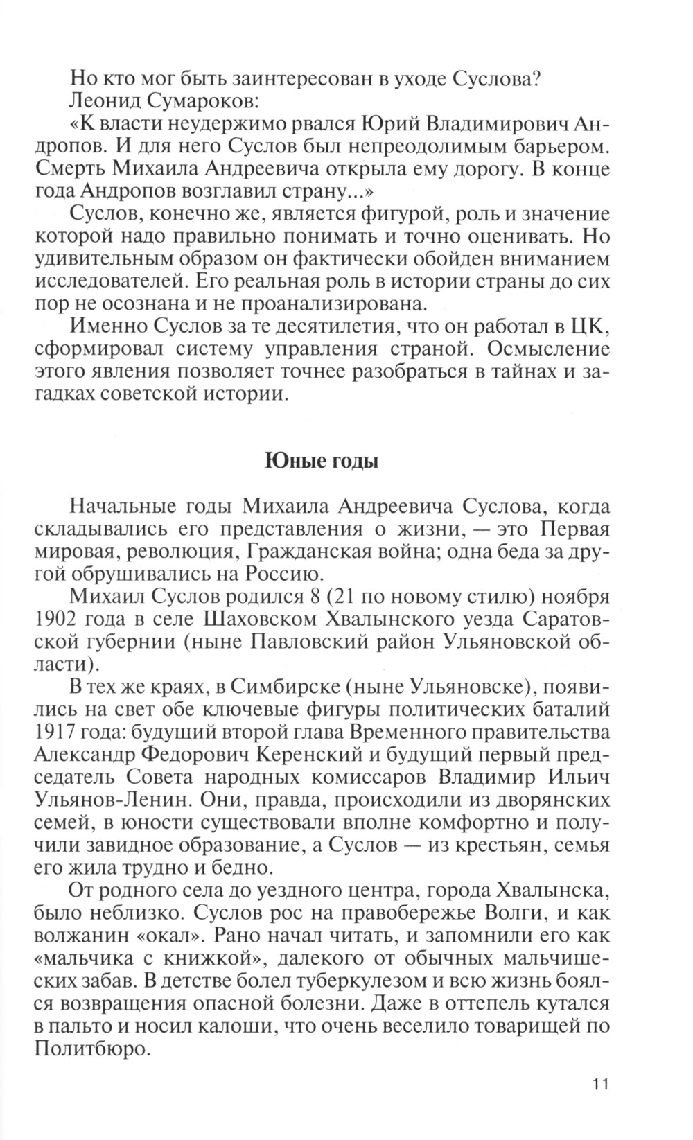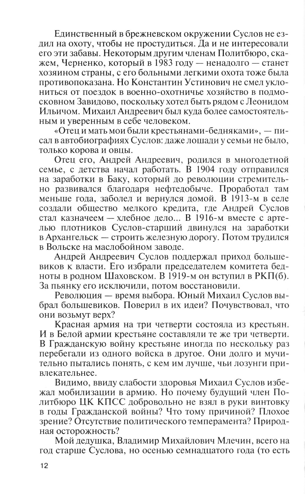 Михаила Андреевича Суслова называли «серым кардиналом» позднего СССР. Войдя в политическую жизнь страны еще в предвоенные годы, он до самой смерти в 1982 году участвовал в принятии ключевых решений, определяющих жизнь советских людей. В глазах всего мира этот непреклонный догматик был символом коммунистической идеологии, которая с его уходом зашаталась, а потом и рухнула. Личная жизнь Суслова, его подлинные мысли и чувства оставались тайной, поэтому его биографию известный писатель и телеведущий Леонид Млечин реконструирует по документам и воспоминаниям современников, рисуя портрет «главного жреца» марксистско-ленинского культа на фоне его эпохи.| Издательство | Молодая гвардия |