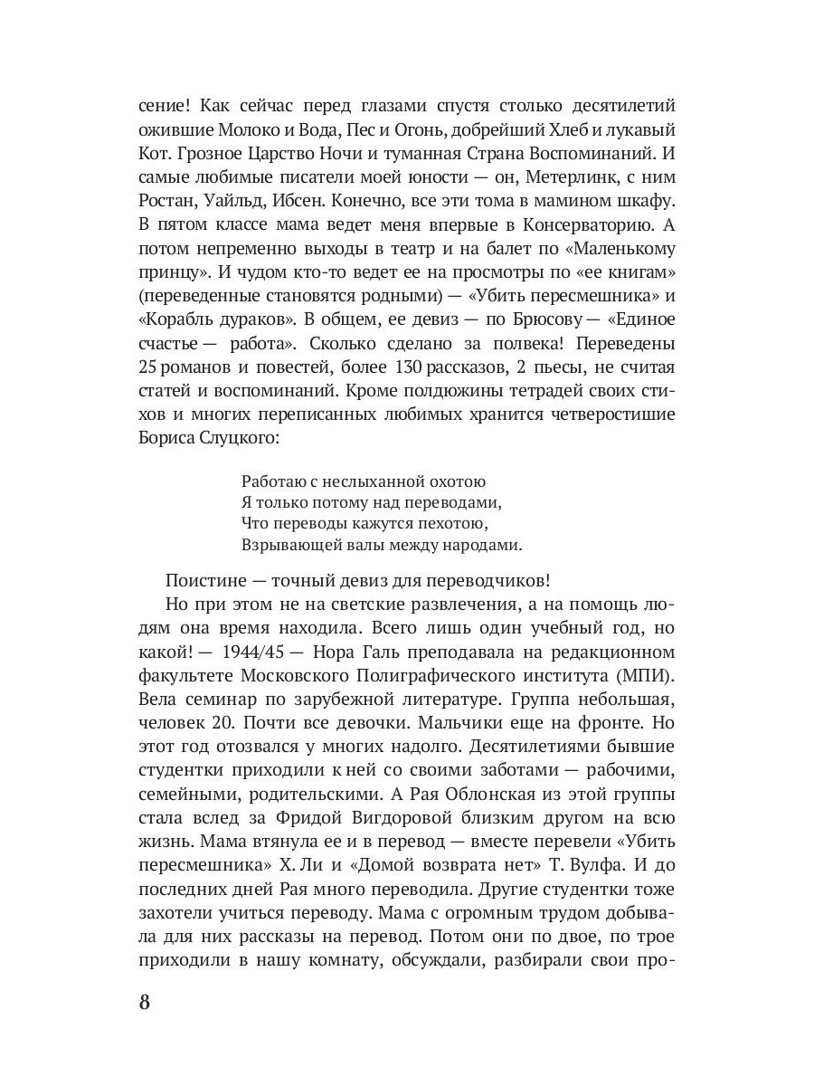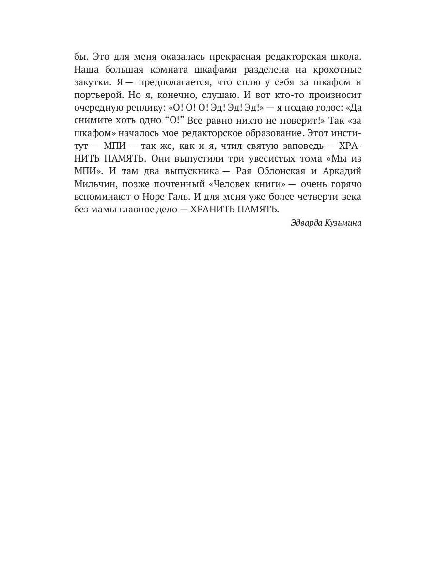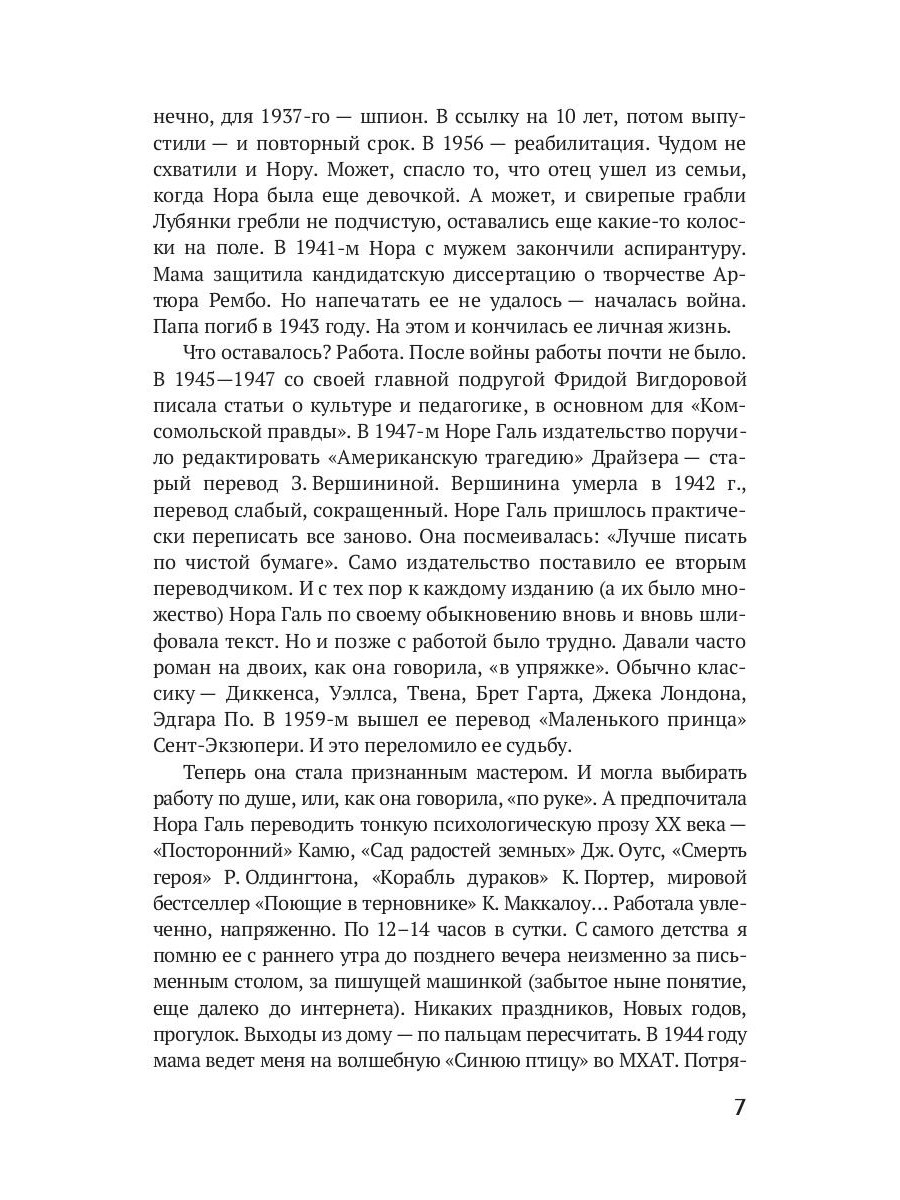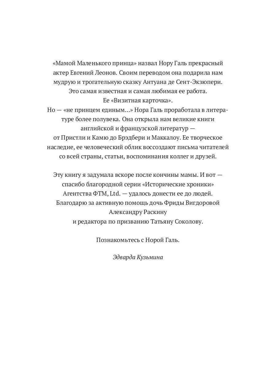 «Мамой Маленького принца» назвал Нору Галь прекрасный актер Евгений Леонов. Перевод мудрой и трогательной сказки Антуана де Сент-Экзюпери стал ее самой известной и любимой работой, настоящей «визитной карточкой». Но, кроме этого, Нора Галь открыла читателям Советского Союза произведения многих франко- и англоязычных авторов: Пристли, Камю, Брэдбери, Маккалоу. Ее переводы по сей день не теряют своей актуальности. В новом издании книги публикуются новинки из архива Норы Галь - письма читателей, статьи, воспоминания коллег и друзей - всё то, что помогает проникнуть в творческое наследие Норы Галь и оценить ее человеческие качества. Эти свидетельства рисуют перед нами живой облик замечательной переводчицы.| Издательство | Т8 RUGRAM |