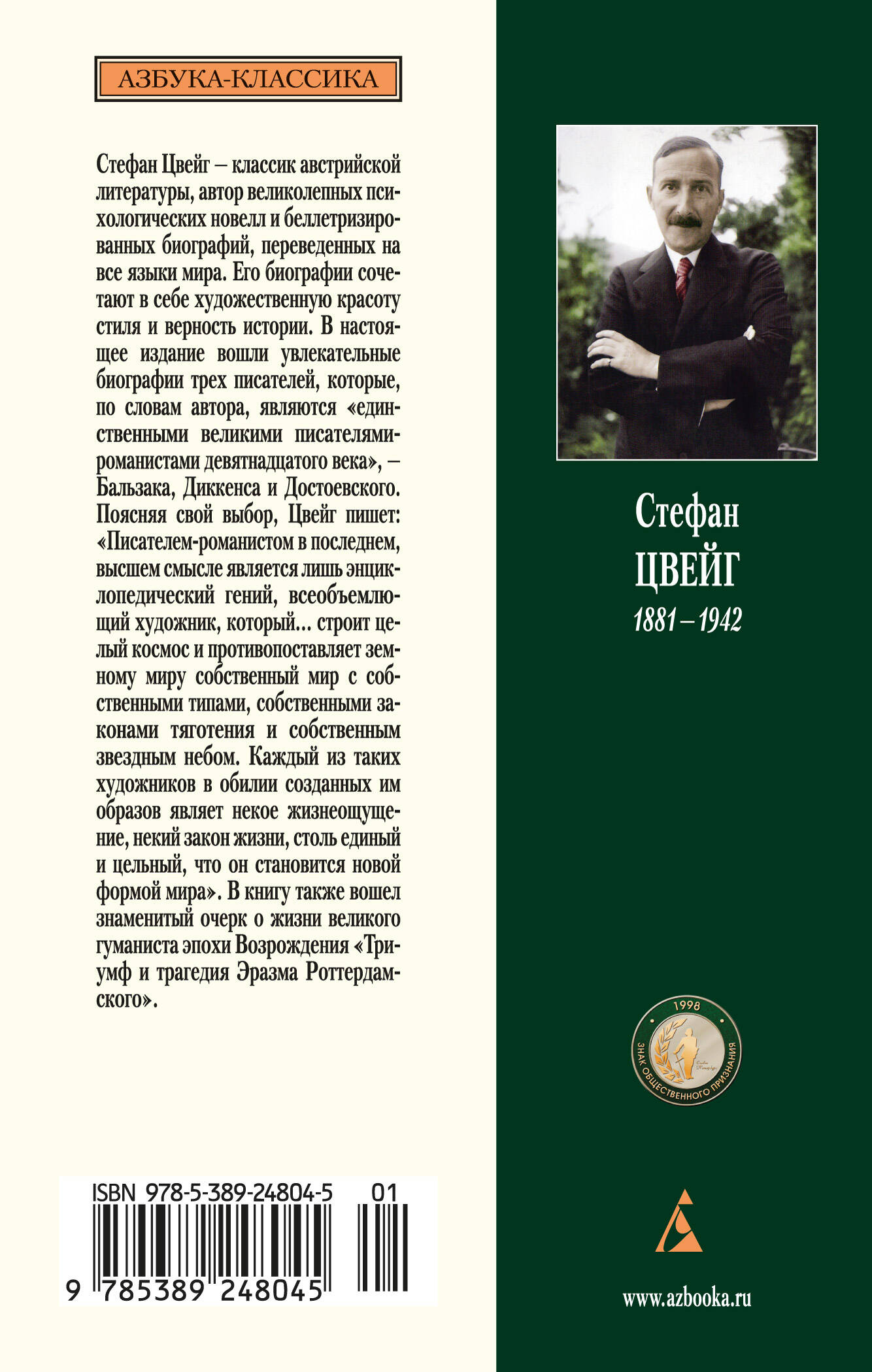 Стефан Цвейг - классик австрийской литературы, автор великолепных психологических новелл и беллетризированных биографий, переведенных на все языки мира. Его биографии сочетают в себе художественную красоту стиля и верность истории. В настоящее издание вошли увлекательные биографии трех писателей, которые, по словам автора, являются "единственными великими писателями-романистами девятнадцатого века", - Бальзака, Диккенса и Достоевского. Поясняя свой выбор, Цвейг пишет: "Писателем-романистом в последнем, высшем смысле является лишь энциклопедический гений, всеобъемлющий художник, который… строит целый космос и противопоставляет земному миру собственный мир с собственными типами, собственными законами тяготения и собственным звездным небом... Каждый из таких художников в обилии созданных им образов являет некое жизнеощущение, некий закон жизни, столь единый и цельный, что он становится новой формой мира". В книгу также вошел знаменитый очерк о жизни великого гуманиста эпохи Возрождения "Триумф и трагедия Эразма Роттердамского".| Издательство | Азбука-Аттикус Издат.группа ООО |