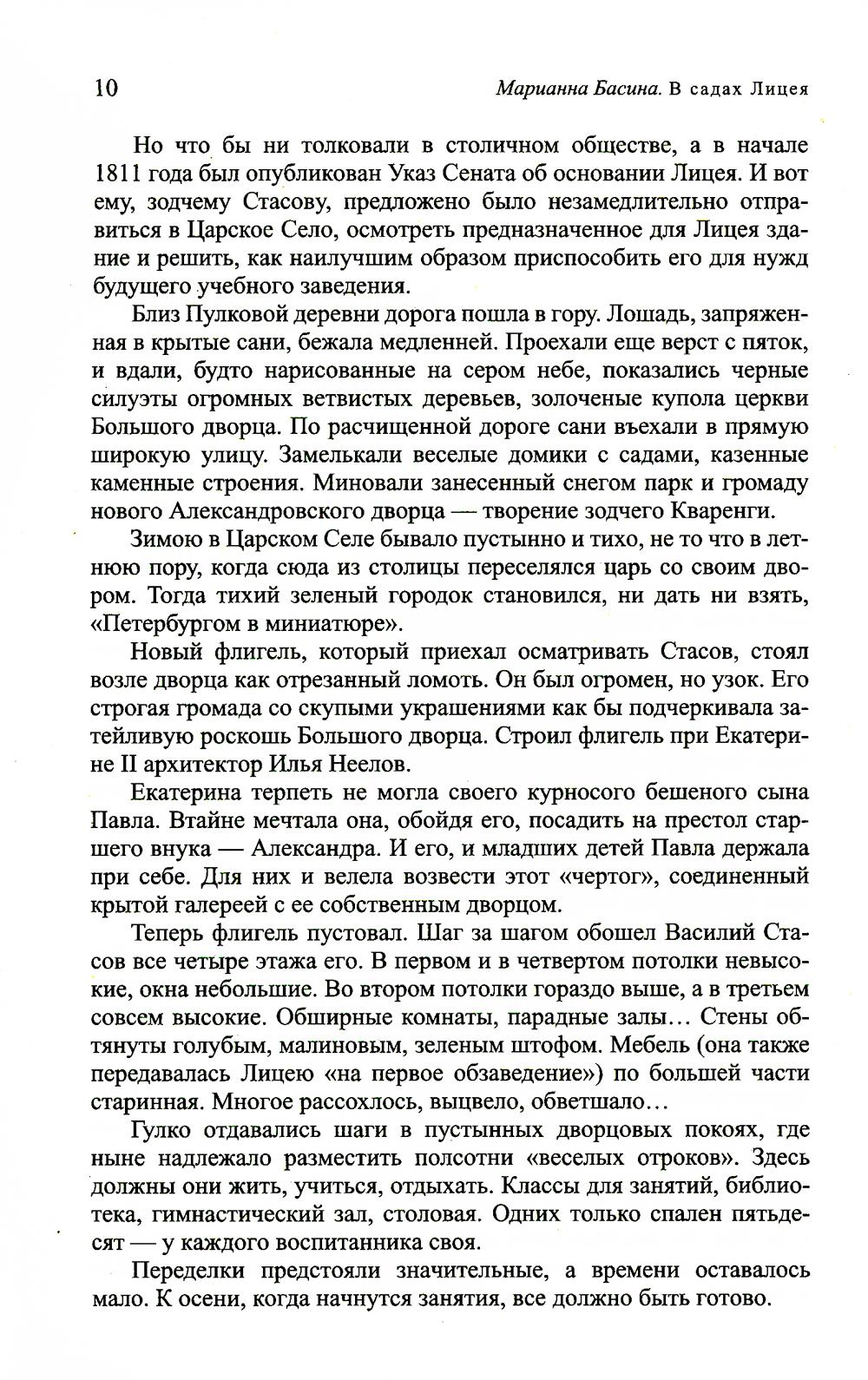 Марианна Яковлевна Басина известна читателям самого разного возраста своими документальными повестями о великих русских писателях - Гоголе, Некрасове, Достоевском, но прежде всего - о Пушкине. Художественно-документальные повести «В садах Лицея» и «На брегах Невы», вошедшие в этот том, посвящены отрочеству, юности и молодости А. С. Пушкина.. В первой из них перед читателем разворачивается удивительная картина жизни замкнутого мира царскосельского Лицея. Это живой мир ярких характеров лицеистов и их наставников, мир патриотических порывов: идет война 1812 года, мечтаний о любви и литературной славе, вольнолюбивых надежд. В этой атмосфере созревает талант великого поэта, его неукротимое юношеское бунтарство. В первые годы после Лицея (повесть «На брегах Невы») он яростно ищет свой путь в поэзии, свое место в общественном процессе. Растущая слава, убийственные антиправительственные эпиграммы, вызывающее публичное поведение приводят к тому, что, чудом избежав Сибири, поэт отправляется в почетную ссылку на Юг России. Академик Д. С. Лихачев писал: «В прозе М. Я. Васиной соединены научная точность с художественностью и увлекательностью изложения, чистотой и ясностью языка. Писательница использовала огромный и разнообразный материал. Я знаю по своим внукам и внукам друзей, какой интерес вызывают эти книги у школьников».| Издательство | Лениздат |