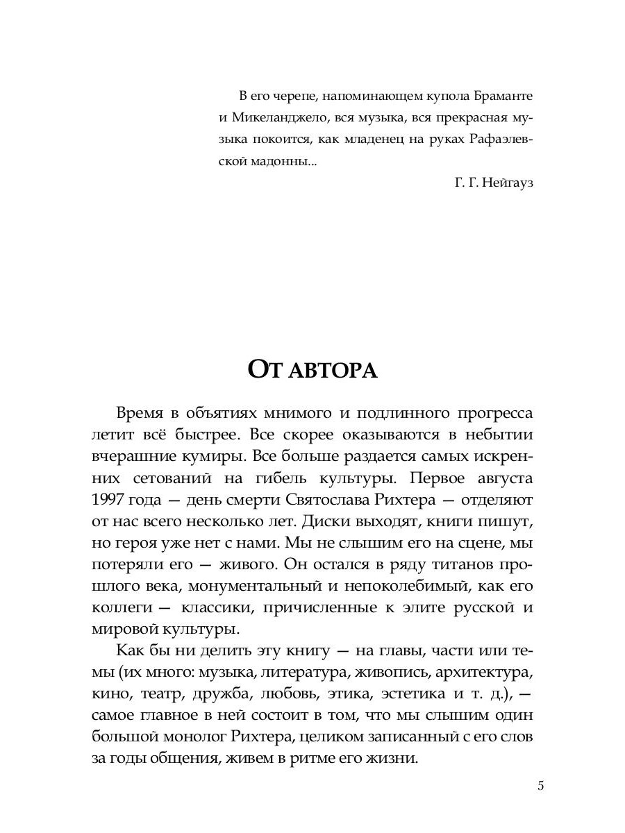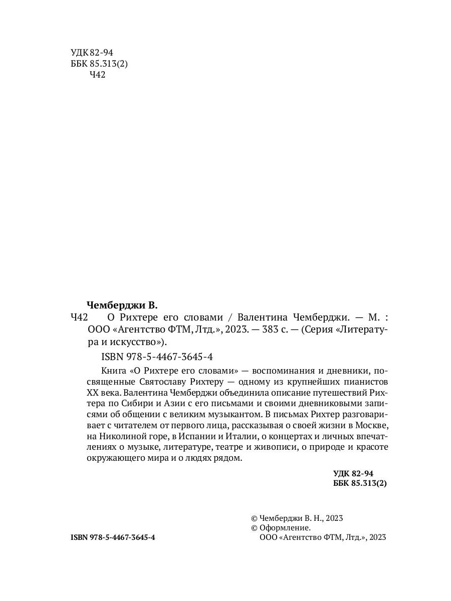 Книга "О Рихтере его словами" - воспоминания и дневники, посвященные Святославу Рихтеру - одному из крупнейших пианистов ХХ века. Валентина Чемберджи объединила описание путешествий Рихтера по Сибири и Азии с его письмами и своими дневниковыми записями об общении с великим музыкантом. В письмах Рихтер разговаривает с читателем от первого лица, рассказывая о своей жизни в Москве, на Николиной горе, в Испании и Италии, о концертах и личных впечатлениях о музыке, литературе, театре и живописи, о природе и красоте окружающего мира и о людях рядом.