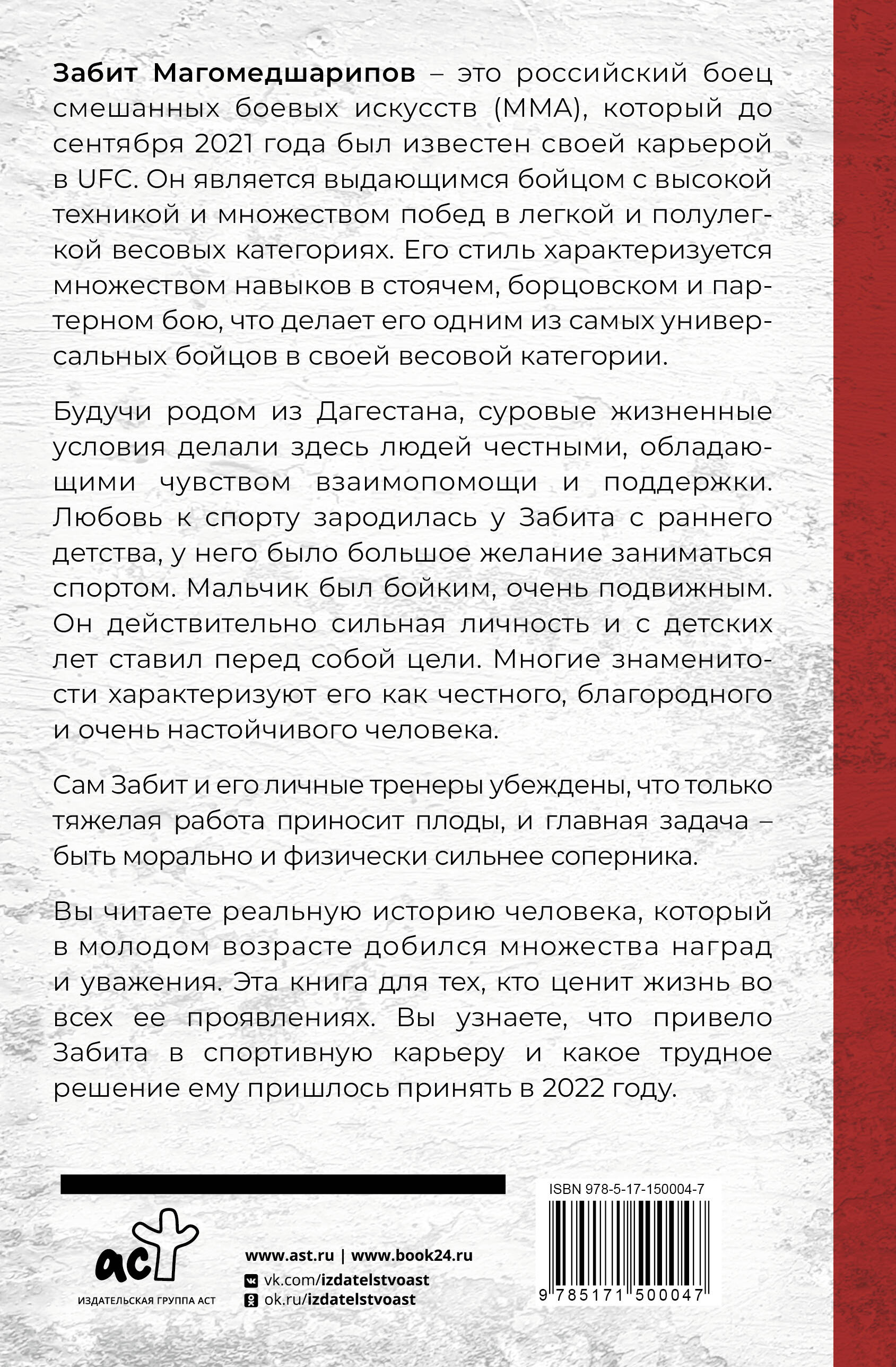 Забит Магомедшарипов - это российский боец смешанных боевых искусств (MMA), который до сентября 2021 года был известен своей карьерой в UFC. Он является выдающимся бойцом с высокой техникой и множеством побед в легкой и полулегкой весовых категориях. Его стиль характеризуется множеством навыков в стоячем, борцовском и партерном бою, что делает его одним из самых универсальных бойцов в своей весовой категории. Будучи родом из Дагестана, суровые жизненные условия делали здесь людей честными, обладающими чувством взаимопомощи и поддержки. Любовь к спорту зародилась у Забита с раннего детства, у него было большое желание заниматься спортом. Мальчик был бойким, очень подвижным. Он действительно сильная личность и с детских лет ставил перед собой цели. Многие знаменитости характеризуют его как честного, благородного и очень настойчивого человека. Сам Забит и его личные тренеры убеждены, что только тяжелая работа приносит плоды, и главная задача - быть морально и физически сильнее соперника. Вы читаете реальную историю человека, который в молодом возрасте добился множества наград и уважения. Эта книга для тех, кто ценит жизнь во всех ее проявлениях. Вы узнаете, что привело Забита в спортивную карьеру и какое трудное решение ему пришлось принять в 2022 году.| Издательство | Издательство "АСТ" |