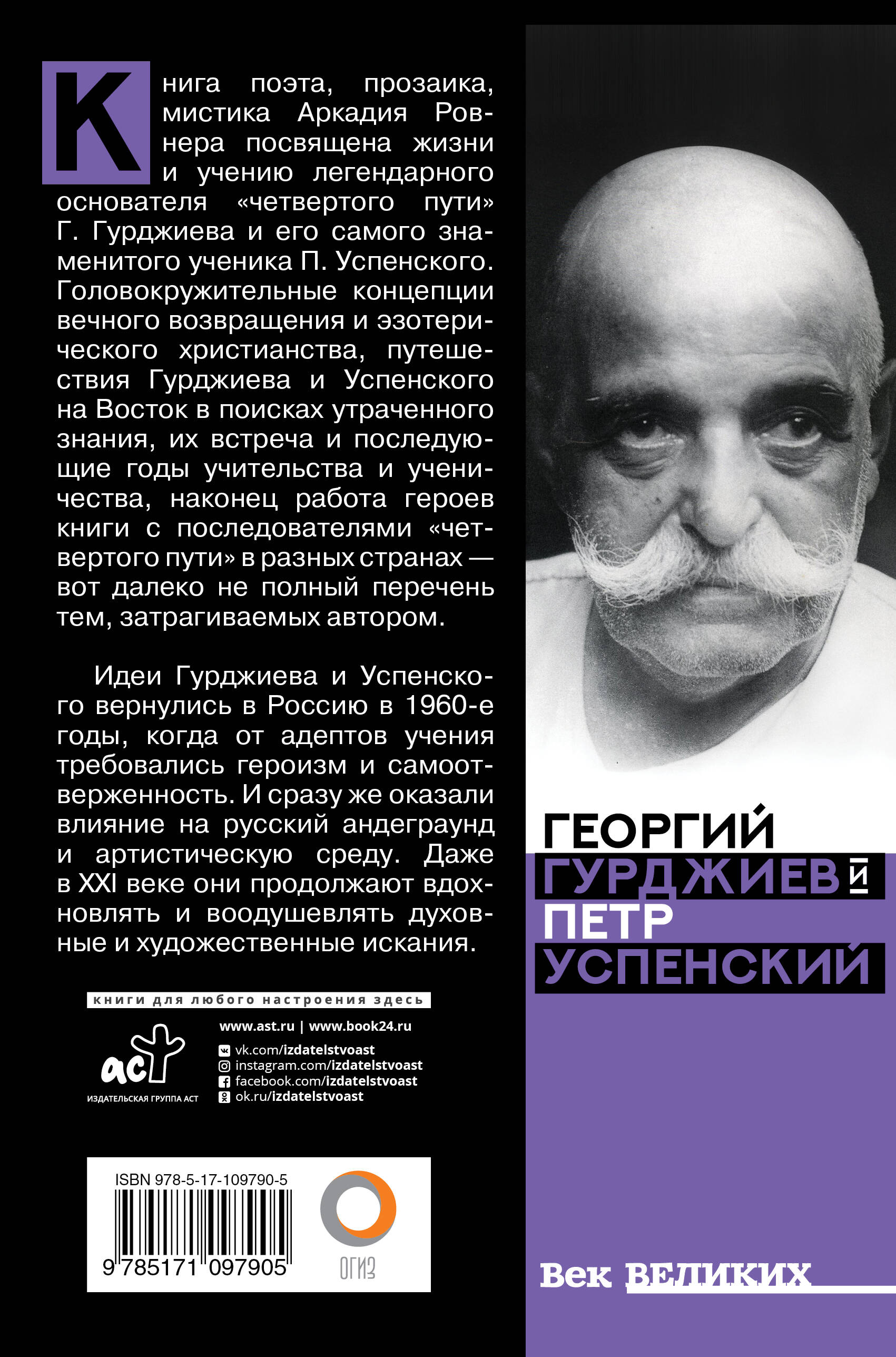 Книга поэта, прозаика, мистика Аркадия Ровнера посвящена жизни и учению легендарного основателя "четвертого пути" Г. Гурджиева и его самого знаменитого ученика П. Успенского. Головокружительные концепции вечного возвращения и эзотерического христианства, путешествия Гурджиева и Успенского на Восток в поисках утраченного знания, их встреча и последующие годы учительства и ученичества, наконец, работа героев книги с последователями "четвертого пути" в разных странах - вот далеко не полный перечень тем, затрагиваемых автором.| Издательство | ИЗДАТЕЛЬСТВО "АСТ" |