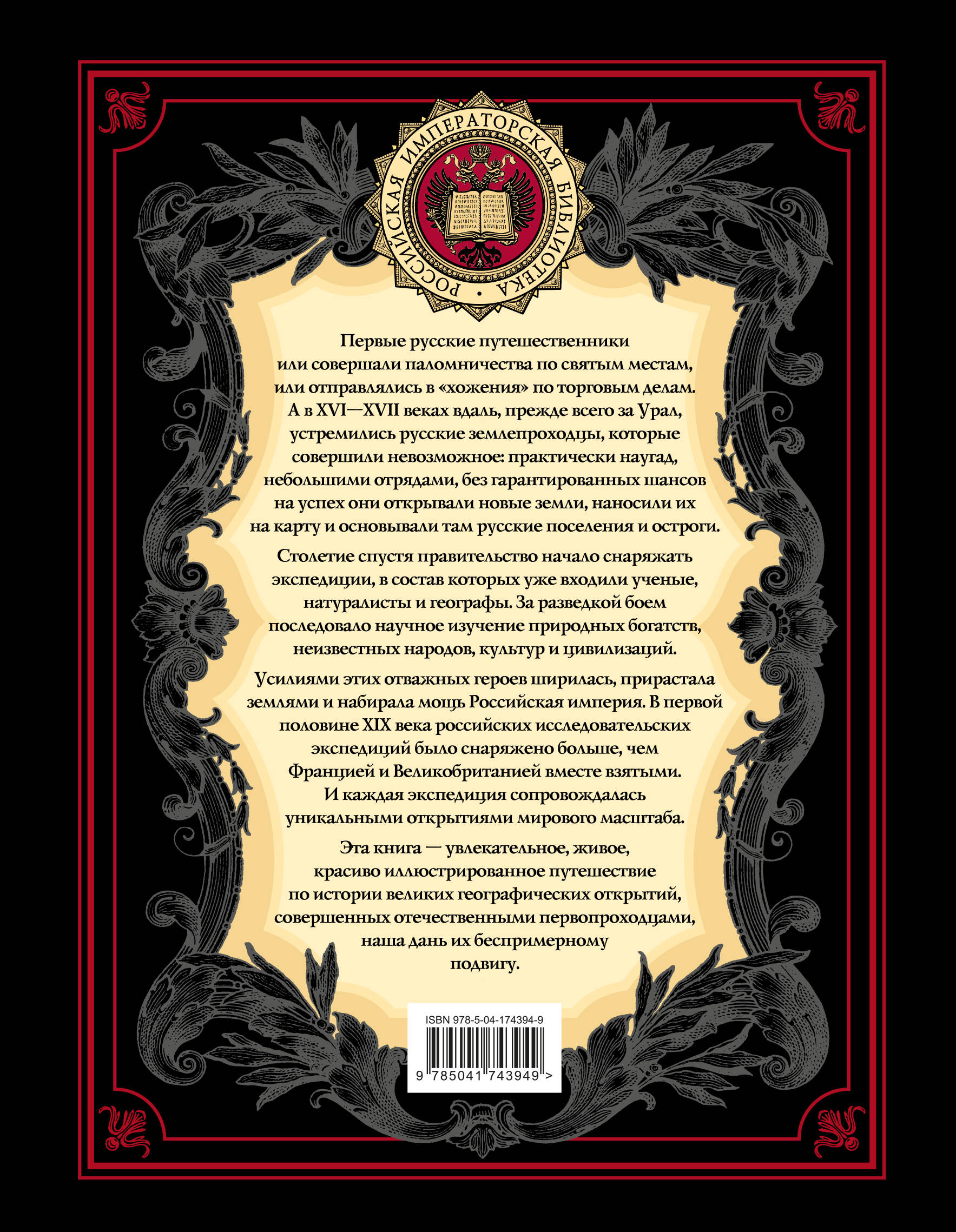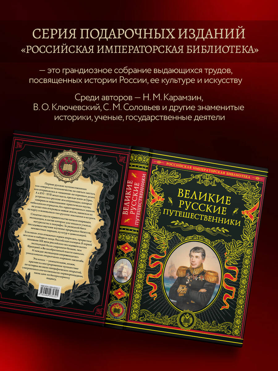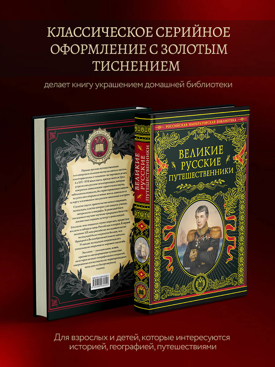 По какой причине люди отправлялись в путешествия? Первые русские путешественники путешествовали по религиозным причинам, посещая святые места или же движимые торговлей. Постепенно к этим интересам начали добавляться цели геополитические: в XVI-XVII веках вдаль за Урал устремились русские землепроходцы, которые небольшими отрядами открывали новые земли, наносили их на карту и основывали там русские поселения и остроги. Столетие спустя правительство начало снаряжать экспедиции, в состав которых уже входили ученые, натуралисты и географы. Последовало планомерное научное изучение и описание животного и растительного мира, природных богатств, незнакомых народов, культур и цивилизаций. Имена знаменитых русских путешественников и первооткрывателей Афанасия Никитина, Федота Котова, Семена Дежнева, Ерофея Хабарова, Владимира Атласова, Витуса Беринга, Гавриила Сарычева, Ивана Крузенштерна, Василия Головнина, Федора Беллинсгаузена, Михаила Лазарева, Николая Миклухо-Маклая и многих других золотыми буквами были вписаны в мировую летопись великих географических открытий. Усилиями этих отважных героев расширялась и набирала мощь Российская империя. В первой половине XIX века российских исследовательских экспедиций было снаряжено больше, чем Францией и Великобританией вместе взятыми. И каждая экспедиция сопровождалась уникальными открытиями мирового масштаба. Книга «Великие русские путешественники» будет интересна всем, кого интересует история России, этнография, география, история географических открытий. Современное издание богато иллюстрировано редкими иллюстративными материалами; снабжено примечаниями и комментариями, а также подробным именным указателем, что будет интересно как профессионалам, так и просто любителям истории. А классическое серийное оформление сделает эту книгу настоящим украшением на вашей книжной полке. Серия «Российская императорская библиотека» - это грандиозное собрание выдающихся образцов отечественной мысли и словесности. Издания, вошедшие в серию, представляют собой лучшее в великом духовном наследии нашей страны. Это труды, созданные знаменитыми историками, учеными, великими государственными деятелями и посвященные тысячелетней истории России, ее культуре и искусству, военной славе, многовековым народным обычаям и деяниям выдающихся представителей нашего Отечества. Прекрасная возможность составить свою домашнюю библиотеку из великих трудов о великой стране. Каждая книга серии богато проиллюстрирована многочисленными цветными и черно-белыми иллюстрациями, которые дают возможность в полном объеме увидеть то, что составляет сокровищницу культурного наследия нашей страны! Каждая книга серии станет великолепным подарком: для тех, кто собирает домашнюю библиотеку классических трудов; для тех, кто интересуется историей России, выдающимися личностями; для школьников и студентов.| Издательство | ООО "Издательство "Эксмо" |