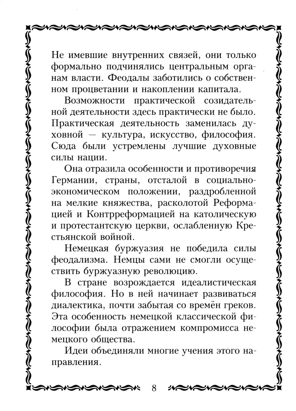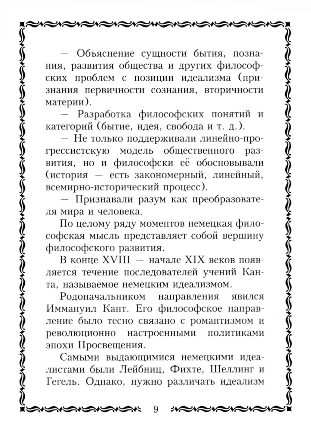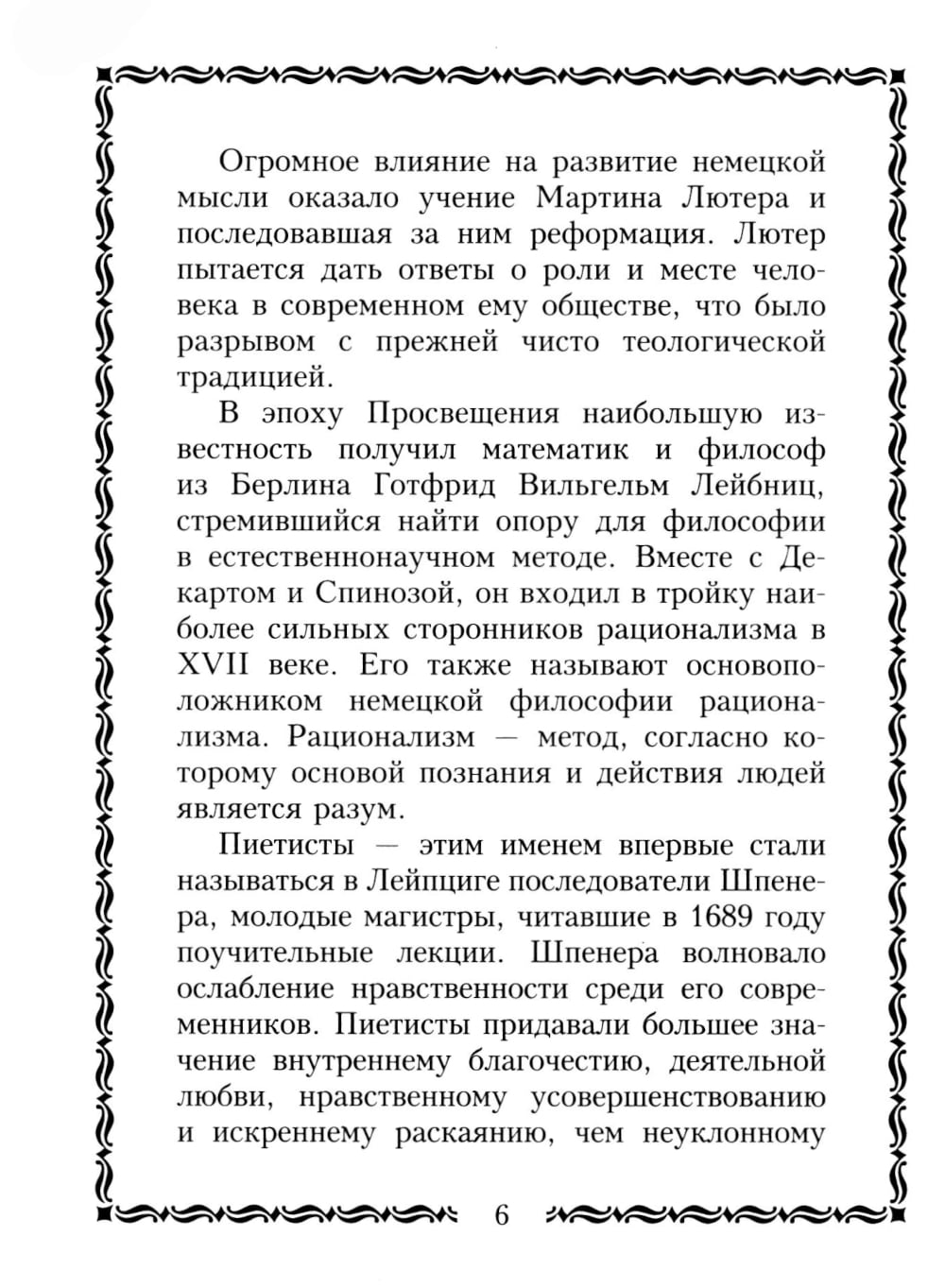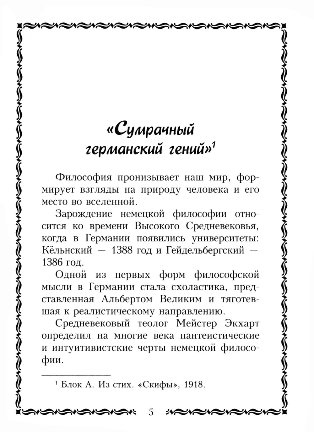 Философия пронизывает наш мир, формирует взгляды человека на природу человека и его место во Вселенной. Изначально философом называли любого образованного человека, и лишь гораздо позже этот термин стали применять к тем мыслителям, которые изучают вопросы мировоззрения. Германия - развитая страна с высоким уровнем образования. Она подарила миру много талантливых людей и, конечно же, философов, идеи которых оказали влияние на мировую культуру. Фридрих Ницше и Георг Гегель, Мартин Лютер и Иоганн Фихте, Иммануил Кант и Артур Шопенгауэр, Новалис и Эдмунд Гуссерль - каждый из них заслужил то, что мы хотя бы немного приобщились к их мудрости.| Издательство | Центрполиграф |