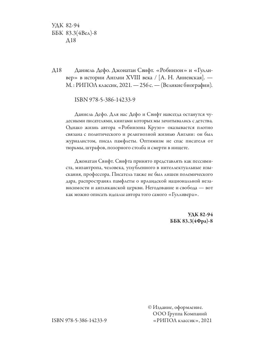 Даниель Дефо. Для нас Дефо и Свифт навсегда останутся чудесными писателями, книгами которых мы зачитывались с детства. Однако жизнь автора «Робинзона Крузо» оказывается плотно связана с политического и религиозной жизнью Англии: он был журналистом, писал памфлеты. Оптимизм не спас писателя от тюрьмы, штрафов, позорного столба и смерти в нищете. Джонатан Свифт. Свифта принято представлять как пессимиста, мизантропа, человека, углубленного в интеллектуальные изыскания, профессора. Писатель также не был лишен полемического дара, распространял памфлеты о ирландской национальной независимости и англиканской церкви. Негодование и свобода - вот как можно описать идеалы автора того самого «Гулливера».| Издательство | Рипол Классик |