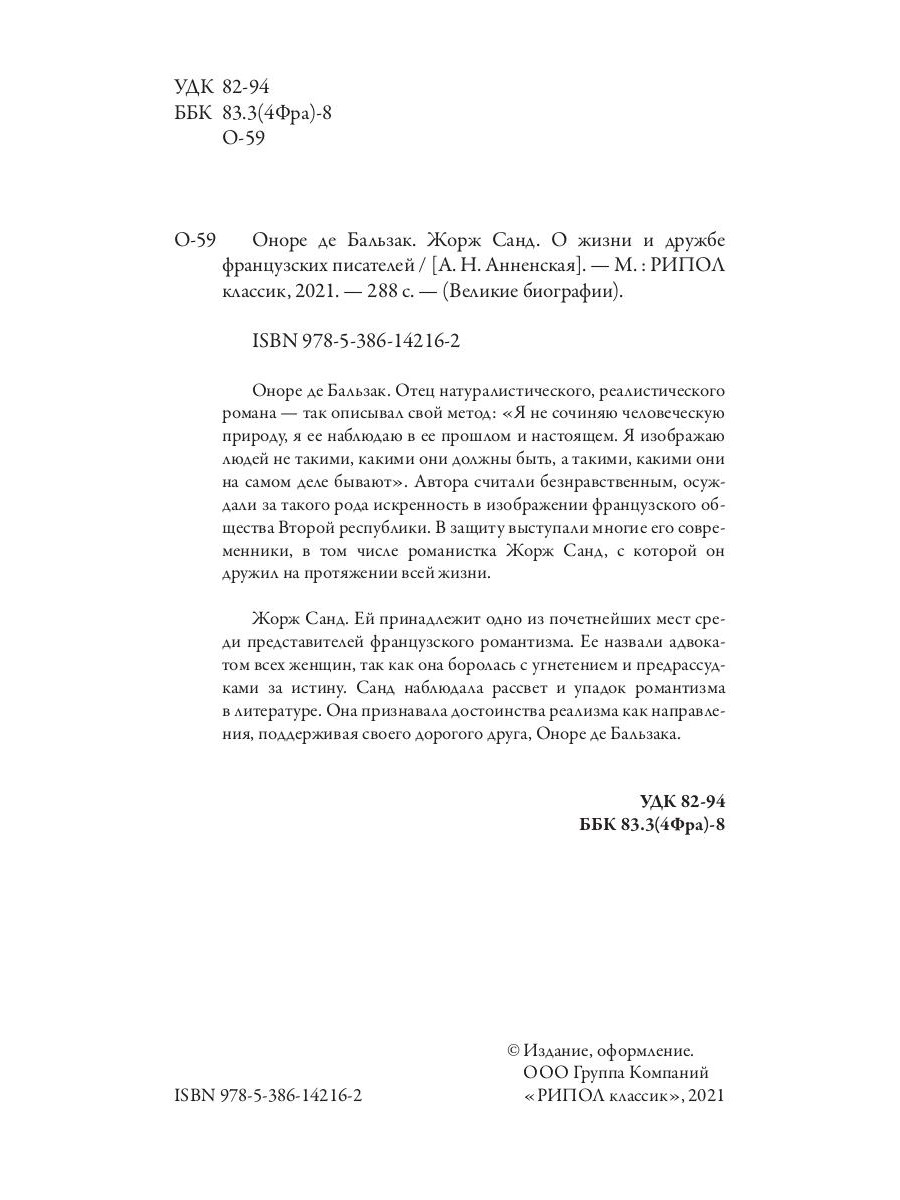 Оноре де Бальзак. Отец натуралистического, реалистического романа - так описывал свой метод: «Я не сочиняю человеческую природу, я ее наблюдаю в ее прошлом и настоящем. Я изображаю людей не такими, какими они должны быть, а такими, какими они на самом деле бывают». Автора считали безнравственным, осуждали за такого рода искренность в изображении французского общества Второй республики. В защиту выступали многие его современники, в том числе романистка Жорж Санд, с которой он дружил на протяжении всей жизни. Жорж Санд. Ей принадлежит одно из почетнейших мест среди представителей французского романтизма. Ее назвали адвокатом всех женщин, так как она боролась с угнетением и предрассудками за истину. Санд наблюдала рассвет и упадок романтизма в литературе. Она признавала достоинства реализма как направления, поддерживая своего дорогого друга, Оноре де Бальзака.| Издательство | Рипол Классик |