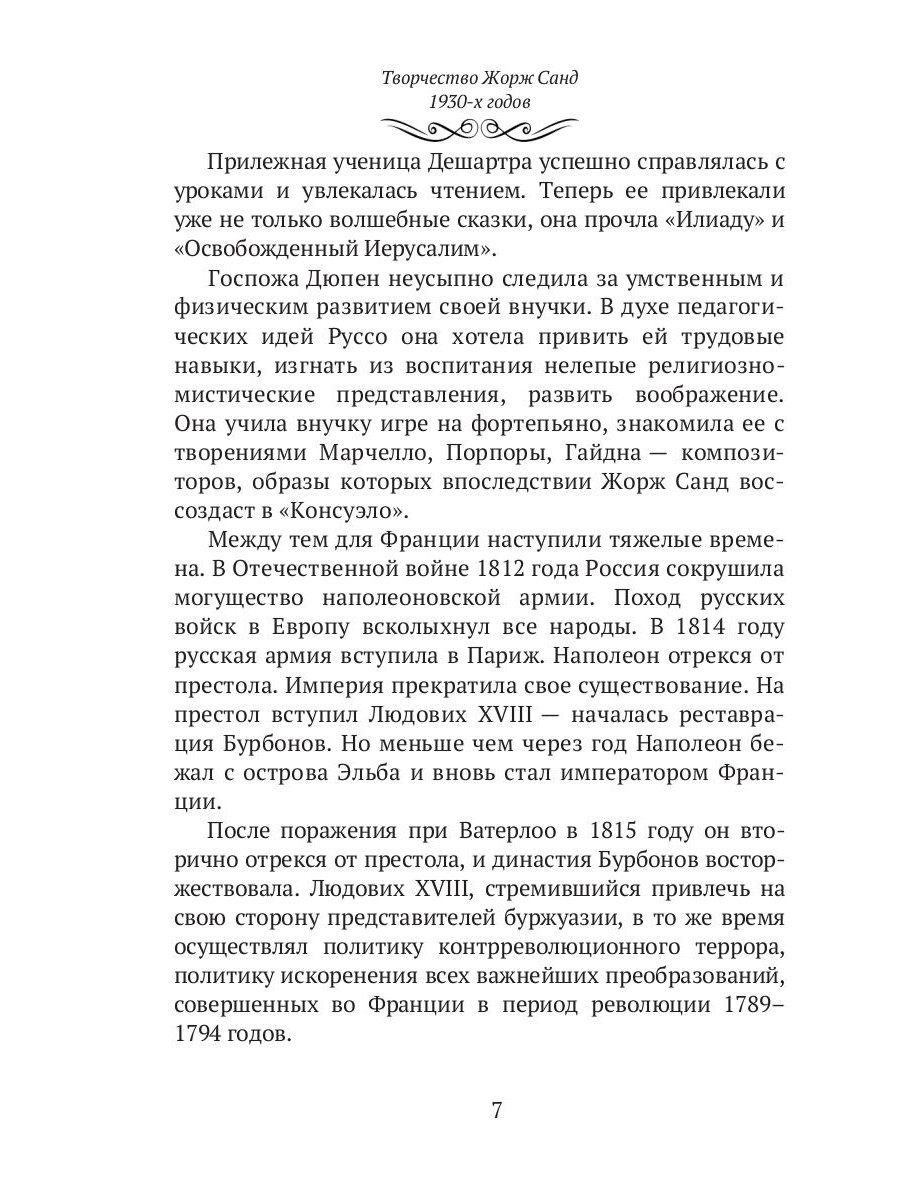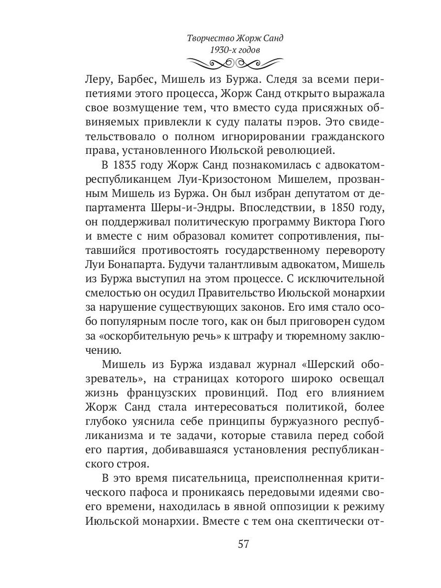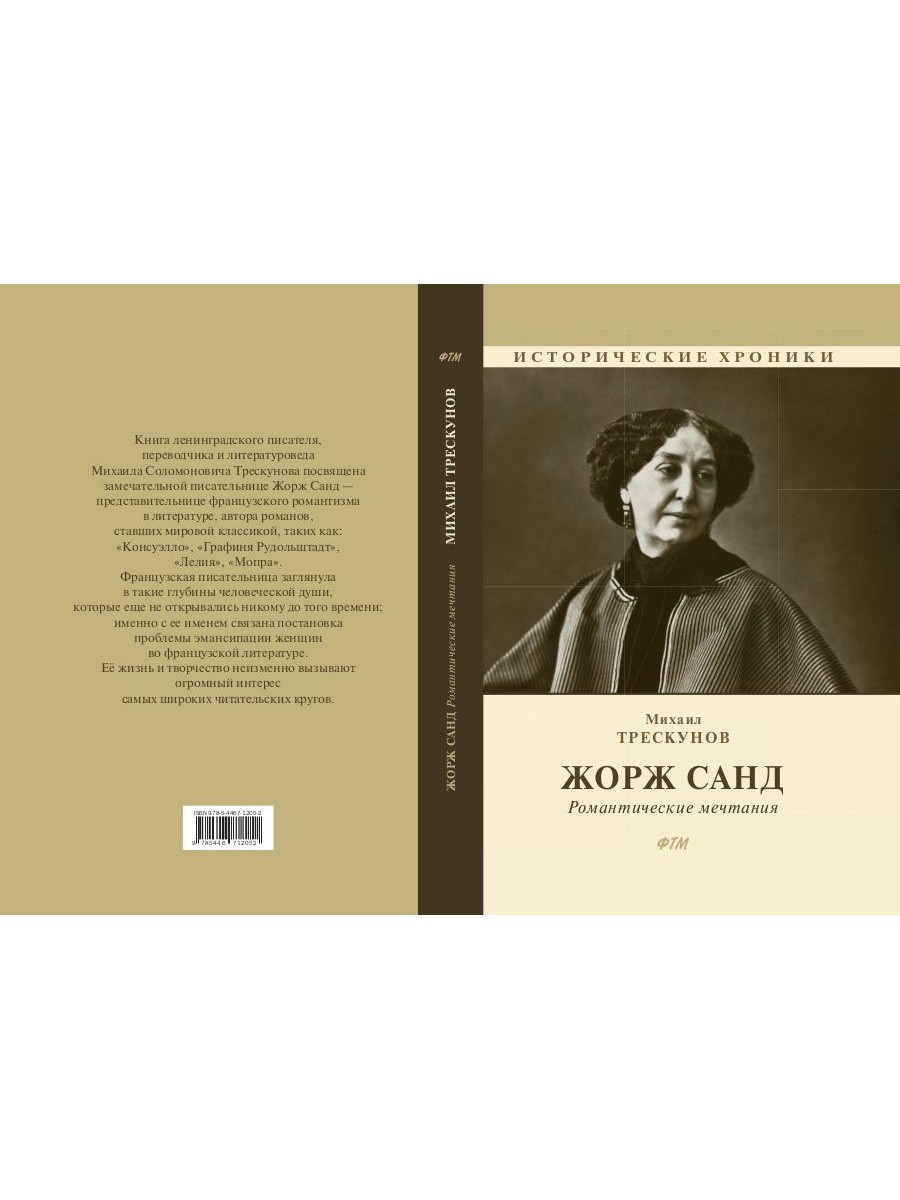 Книга ленинградского писателя, переводчика и литературоведа Михаила Соломоновича Трескунова посвящена замечательной писательнице Жорж Санд - представительнице французского романтизма в литературе, автора романов, ставших мировой классикой, таких как: «Консуэлло», «Графиня Рудольштадт», «Лелия», «Мопра». Французская писательница заглянула в такие глубины человеческой души, которые еще не открывались никому до того времени; именно с ее именем связана постановка проблемы эмансипации женщин во французской литературе Её жизнь и творчество неизменно вызывают огромный интерес самых широких читательских кругов.| Издательство | Т8 RUGRAM |
