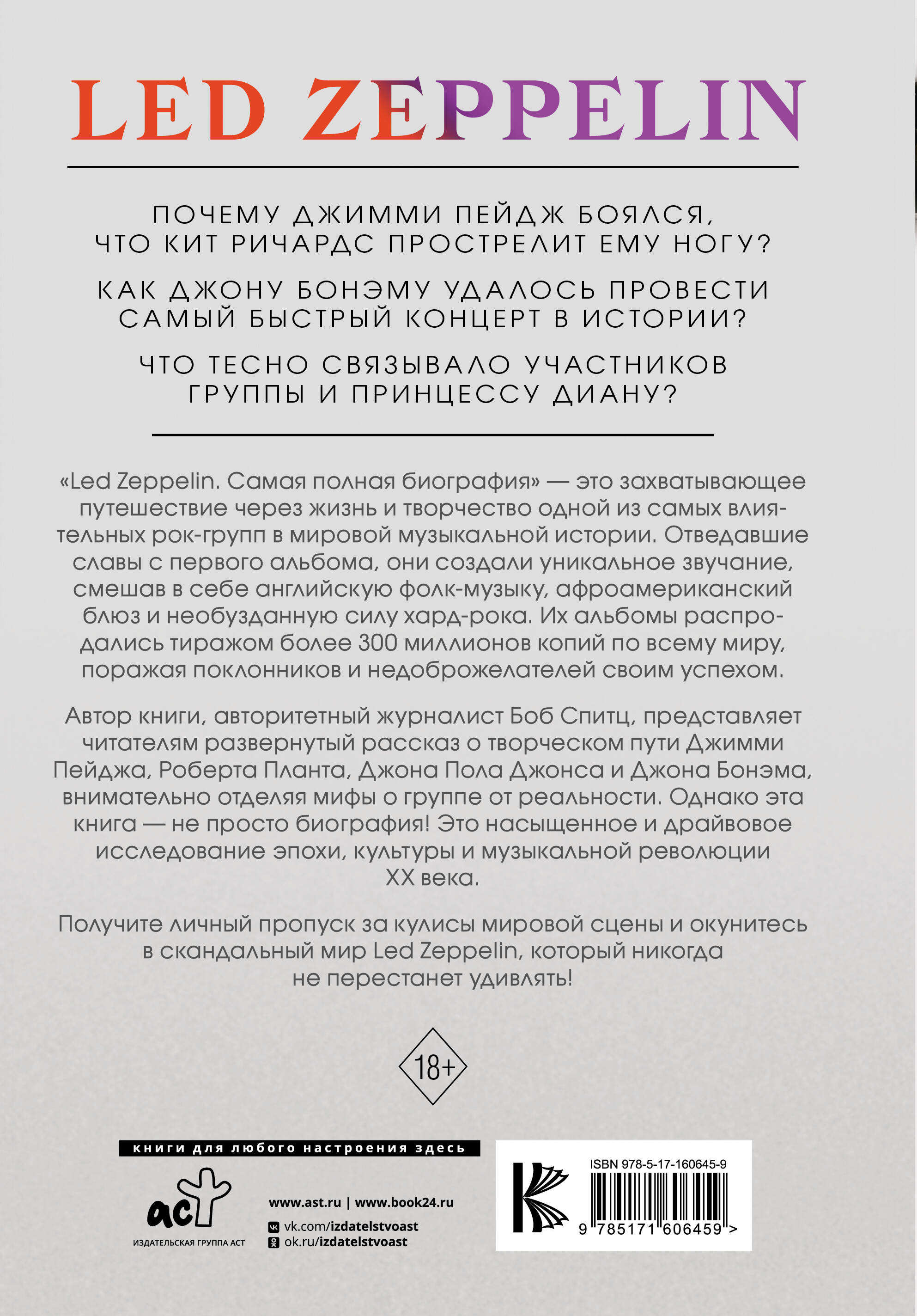 Почему Джимми Пейдж боялся, что Кит Ричардс прострелит ему ногу? Как Джону Бонэму удалось провести самый быстрый концерт в истории? Что тесно связывало участников группы и принцессу Диану? "Led Zeppelin. Самая полная биография" - это захватывающее путешествие через жизнь и творчество одной из самых влиятельных рок-групп в мировой музыкальной истории. Отведавшие славы с первого альбома, они создали уникальное звучание, смешав в себе английскую фолк-музыку, афроамериканский блюз и необузданную силу хард-рока. Их альбомы распродались тиражом более 300 миллионов копий по всему миру, поражая поклонников и недоброжелателей своим успехом. Автор книги, авторитетный журналист Боб Спитц, представляет читателям развернутый рассказ о творческом пути Джимми Пейджа, Роберта Планта, Джона Пола Джонса и Джона Бонэма, внимательно отделяя мифы о группе от реальности. Однако эта книга - не просто биография! Это насыщенное и драйвовое исследование эпохи, культуры и музыкальной революции XX века. Получите личный пропуск за кулисы мировой сцены и окунитесь в скандальный мир Led Zeppelin, который никогда не перестанет удивлять!| Издательство | Издательство "АСТ" |