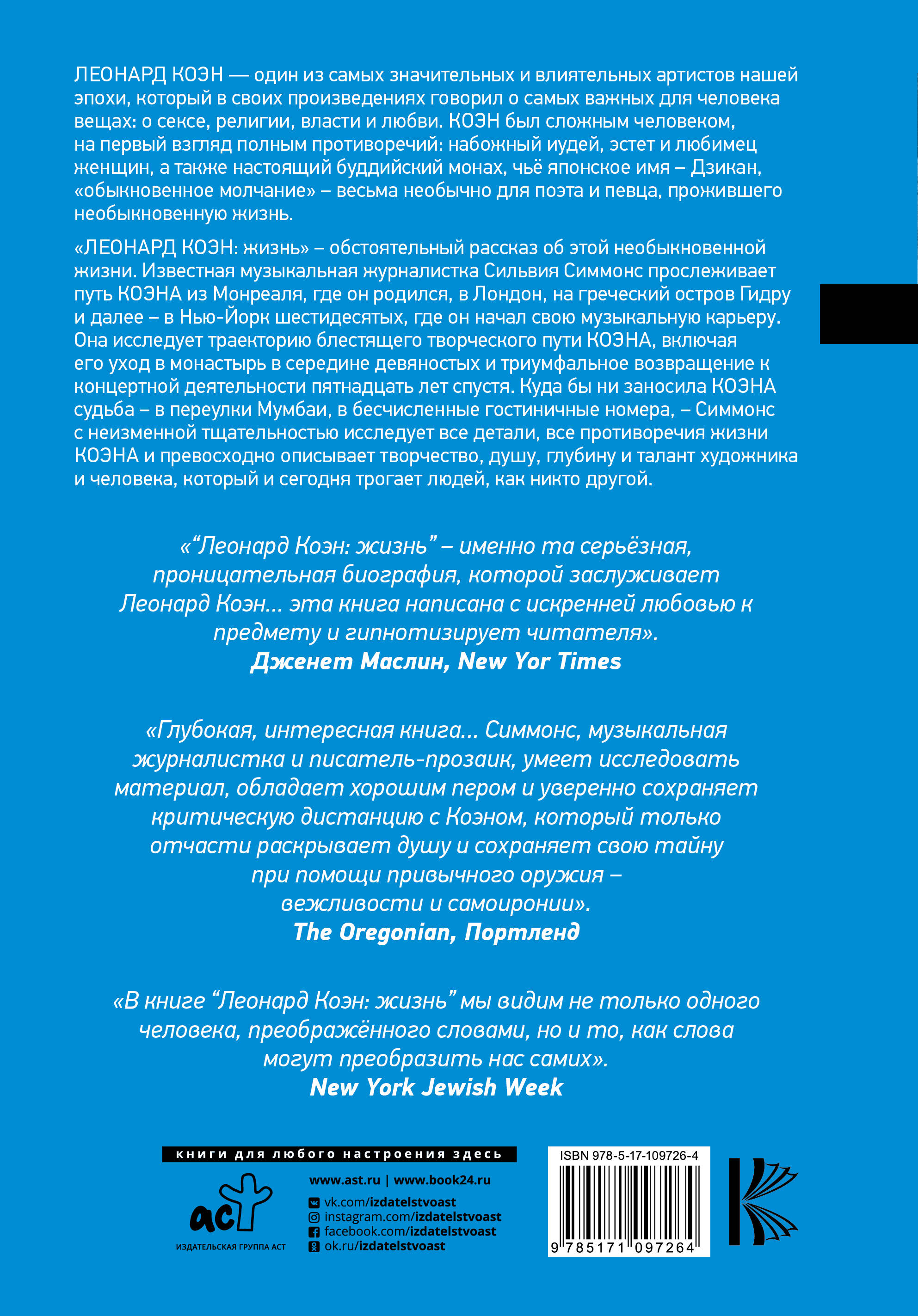 Это книга обстоятельный рассказ о необыкновенной жизни одного из самых значительных и влиятельных артистов нашей эпохи. Автор с неизменной тщательностью исследует все детали, все противоречия жизни Коэна и превосходно описывает творчество, душу, глубину и талант художника и человека, который и сегодня трогает людей, как никто другой. Информативная, прекрасно написанная и заставляющая задуматься книга Симмонс не просто рассказывает о знаменитостях, но откровенно объясняет, как на самом деле устроена музыкальная индустрия, и одновременно создаёт тщательный портрет одного особенно значительного музыканта.| Издательство | ИЗДАТЕЛЬСТВО "АСТ" |