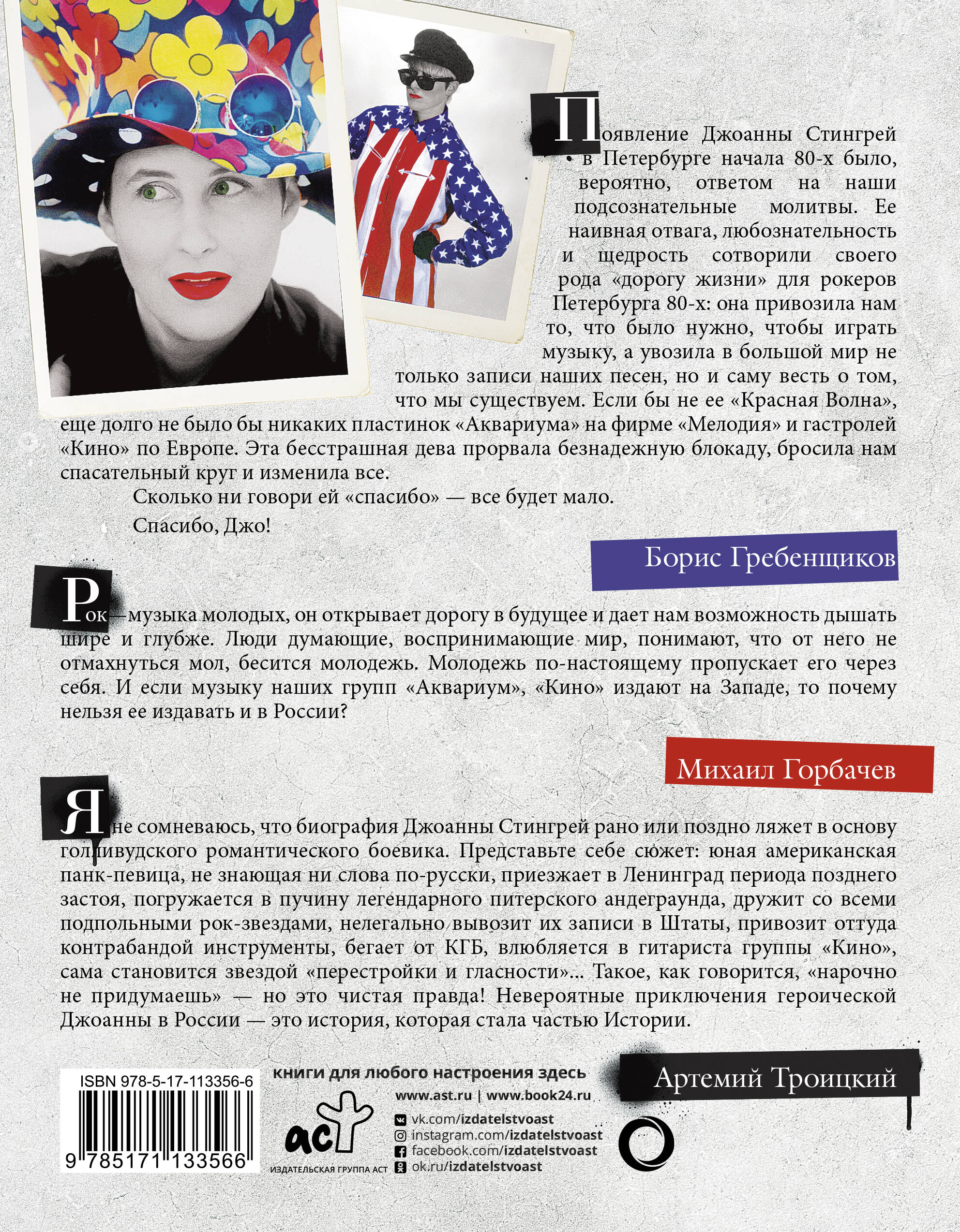 Американская певица и музыкант, роковая леди Джоанна Стингрей приехала в Ленинград в начале 80-х годов XX века, десять с лишним лет ее жизнь неразрывно была связана с СССР, с миром советского андеграунда. Она открыла западу мир русского рока. Как живые, встают со страниц книги Борис Гребенщиков и Виктор Цой, Юрий Каспарян и Сергей Курёхин, Костя Кинчев и Тимур Новиков, Африка и Коля Васин, Дэвид Боуи и Энди Уорхол и многие-многие другие герои сказочной Страны Чудес. Спустя тридцать лет Джоанна решила вернуться к этому периоду своей биографии и рассказать обо всех перипетиях своих приключений, взгляд ее - взгляд изнутри, взгляд не только свидете- ля, но и непосредственного участника многих событий, которым было суждено стать историей. "Эту книгу я писала с огромной любовью. Возможность оживить воспоминания и погрузиться в волшебный мир первых лет моей ленинградской жизни - чудесный дар, который переполнил мне сердце и согрел душу. Никто из нас не мог тогда знать, что мы - часть уникального периода художественной жизни, интерес к которому будет жить и спустя десятилетия".| Издательство | ИЗДАТЕЛЬСТВО "АСТ" |