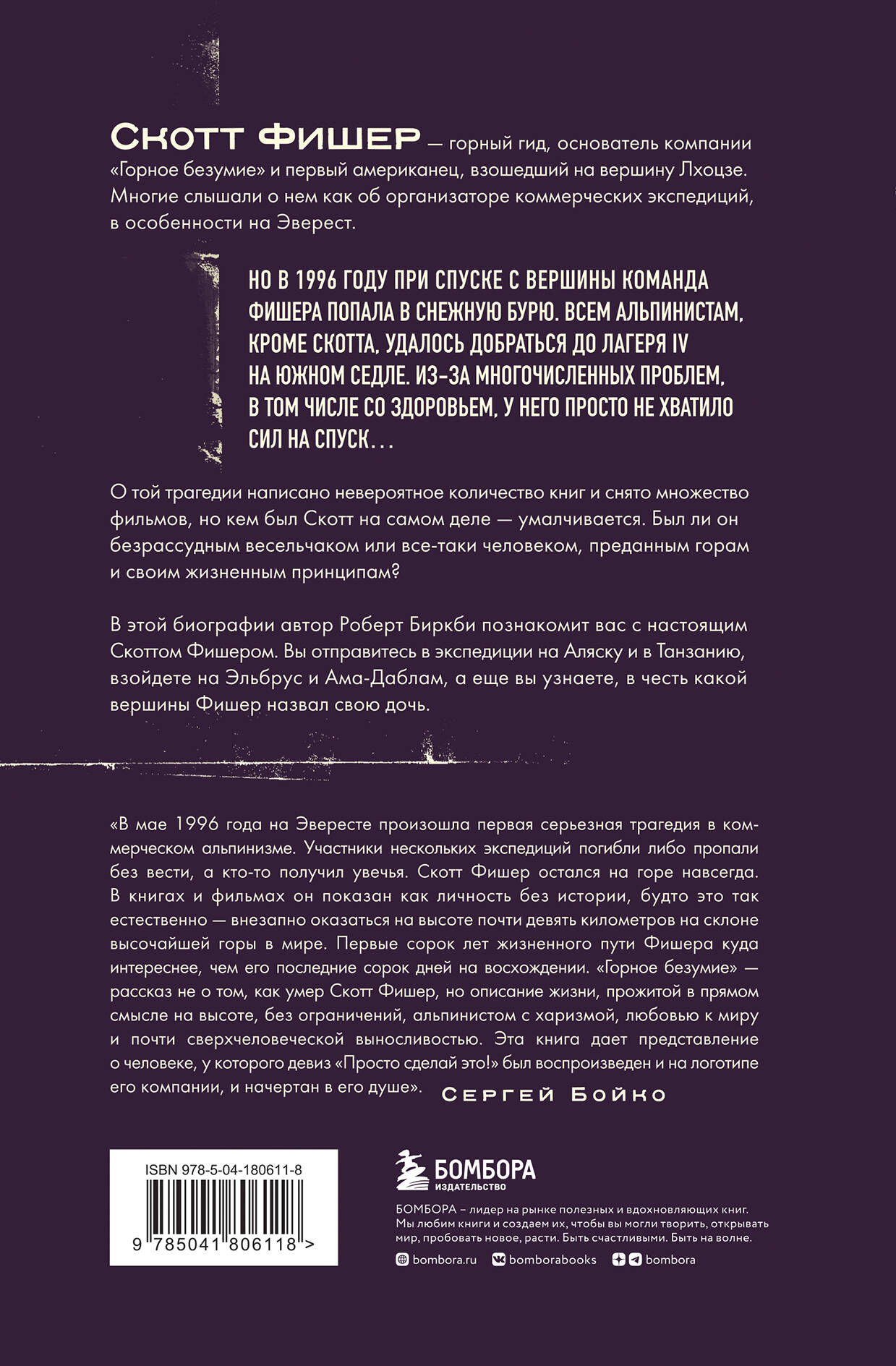 Скотт Фишер - горный гид, основатель компании «Горное безумие» и первый американец, взошедший на вершину Лхоцзе. Многие слышали о нем как об организаторе коммерческих экспедиций, в особенности на Эверест. Но в 1996 году, при спуске с вершины, команда Фишера попала в снежную бурю. Всем альпинистам, кроме Скотта, удалось добраться до Лагеря IV на Южном Седле. Из-за многочисленных проблем, в том числе со здоровьем, у него просто не хватило сил на спуск… О той трагедии написано невероятное количество книг и снято множество фильмов, но кем был Скотт на самом деле - умалчивается. Был ли он безрассудным весельчаком или все-таки человеком, преданным горам и своим жизненным принципам? В этой биографии автор Роберт Биркби познакомит вас с настоящим Скоттом Фишером. Вы отправитесь в экспедицию на Аляску и в Танзанию, взойдете на Эльбрус и Ама-Даблам, а еще вы узнаете, в честь какой вершины Фишер назвал свою дочь. «В мае 1996 года на Эвересте произошла первая серьезная трагедия в коммерческом альпинизме. Участники нескольких экспедиций погибли, либо пропали без вести, а кто-то получил увечья. Скотт Фишер остался на горе навсегда. В книгах и фильмах он показан как личность без истории, будто это так естественно - внезапно оказаться на почти девяти километрах на склоне высочайшей горы в мире. Первые сорок лет жизненного пути Фишера куда интереснее, чем его последние сорок дней на восхождении. «Горное безумие» - рассказ не о том, как умер Скотт Фишер, но описание жизни, прожитой в прямом смысле на высоте, без ограничений, альпинистом с харизмой, любовью к миру и почти сверхчеловеческой выносливостью. Эта книга дает представление о человеке, у которого девиз «Просто сделай это!» был воспроизведен и на логотипе его компании, и начертан в его душе.» - Сергей Бойко| Издательство | ООО "Издательство "Эксмо" |