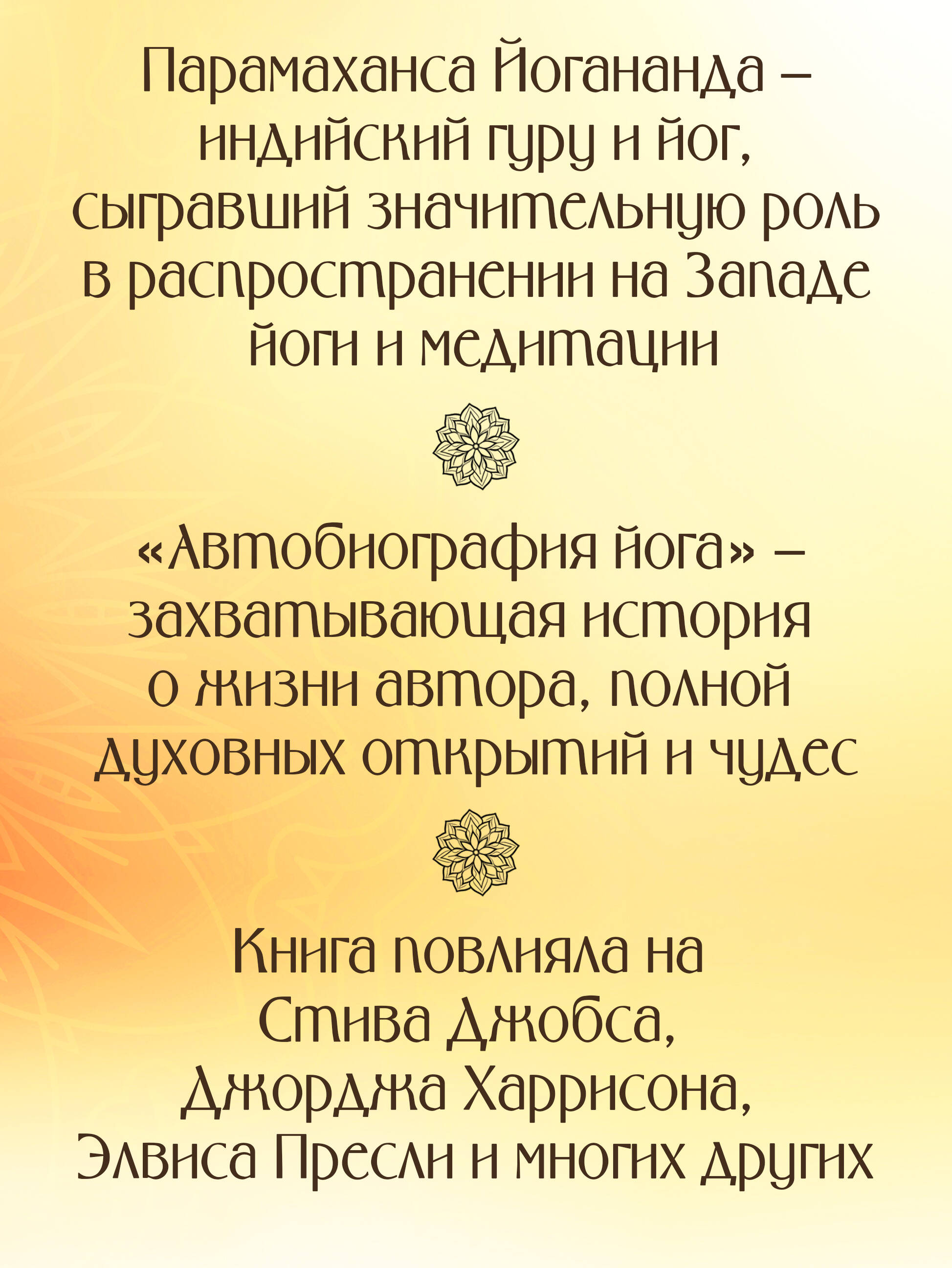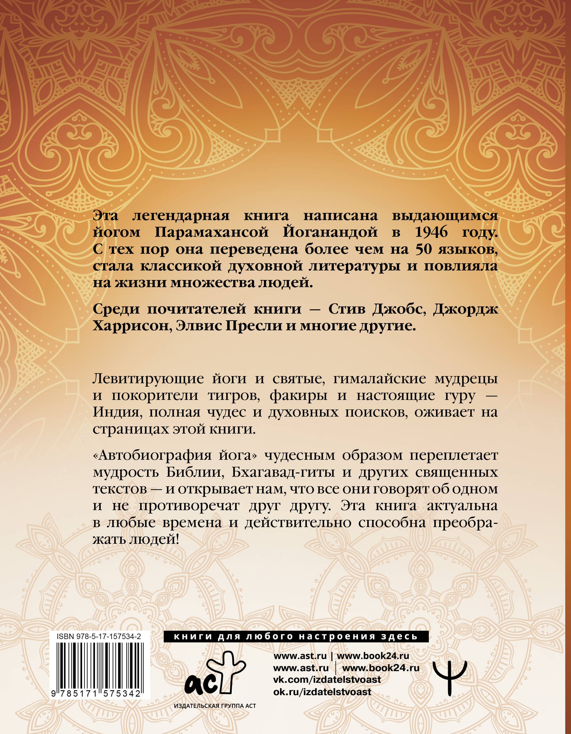 Перед вами книга, не нуждающаяся в представлении, - одна из самых легендарных книг о духовности и йоге XX века, проданная миллионными тиражами, среди ее ценителей - Стив Джобс, Джордж Харрисон, Элвис Пресли и многие другие. И самое главное - эта книга действительно способна преображать жизни людей! Вместе с Парамахансой Йоганандой в поисках высшего смысла вы совершите путешествие в Индию, полную чудес; познакомитесь с учителем, который откроет тайны жизни и смерти, даст точку опоры и приблизит к познанию истины. На этом пути вы повстречаете уникальных людей - святых, йогов, поэтов и ученых, и познакомитесь с древней техникой крийя-йоги. Отдельные главы книги посвящены объяснению чудес, а также нерушимой связи между человеческой жизнью, наукой, религией и Богом. Беседы Парамахансы Йогананды с его гуру Шри Юктешваром о библейских притчах и "Бхагавад-гите", об изречениях Иисуса Христа и йога-сутрах Патанджали не оставят равнодушными ни одного искателя истины. "Автобиография йога" открывает нам, что древние тексты всех времен говорят об одном, что религии Запада и Востока не противоречат друг другу - потому что все они ведут к свету! Книга будет полезна тем, кто интересуется философией йоги, индийской культурой и медитацией.| Издательство | ИЗДАТЕЛЬСТВО "АСТ" |
