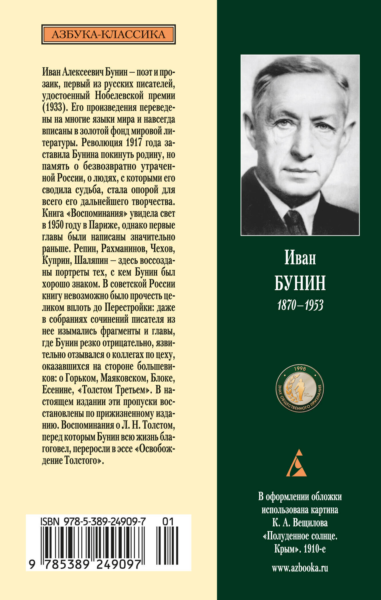 Иван Алексеевич Бунин - поэт и прозаик, первый из русских писателей, удостоенный Нобелевской премии (1933). Его произведения переведены на многие языки мира и навсегда вписаны в золотой фонд мировой литературы. Революция 1917 года заставила Бунина покинуть родину, но память о безвозвратно утраченной России, о людях, с которыми его сводила судьба, стала опорой для всего его дальнейшего творчества. Книга "Воспоминания" увидела свет в 1950 году в Париже, однако первые главы были написаны значительно раньше. Репин, Рахманинов, Чехов, Куприн, Шаляпин - здесь воссозданы портреты тех, с кем Бунин был хорошо знаком. В советской России книгу невозможно было прочесть целиком вплоть до Перестройки, даже в собраниях сочинений писателя из нее изымались фрагменты и главы, где Бунин резко отрицательно, язвительно отзывался о коллегах по цеху, оказавшихся на стороне большевиков: о Горьком, Маяковском, Блоке, Есенине, "Толстом Третьем". В настоящем издании эти пропуски восстановлены по прижизненному изданию. Воспоминания о Л. Н. Толстом, перед которым Бунин всю жизнь благоговел, переросли в эссе "Освобождение Толстого".| Издательство | Азбука-Аттикус Издат.группа ООО |