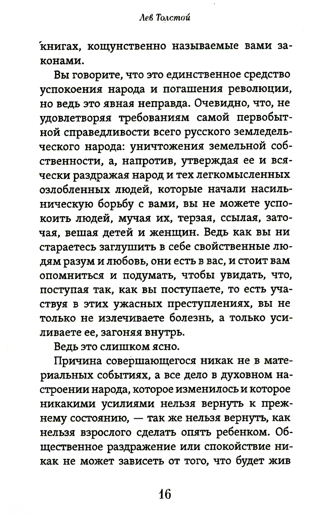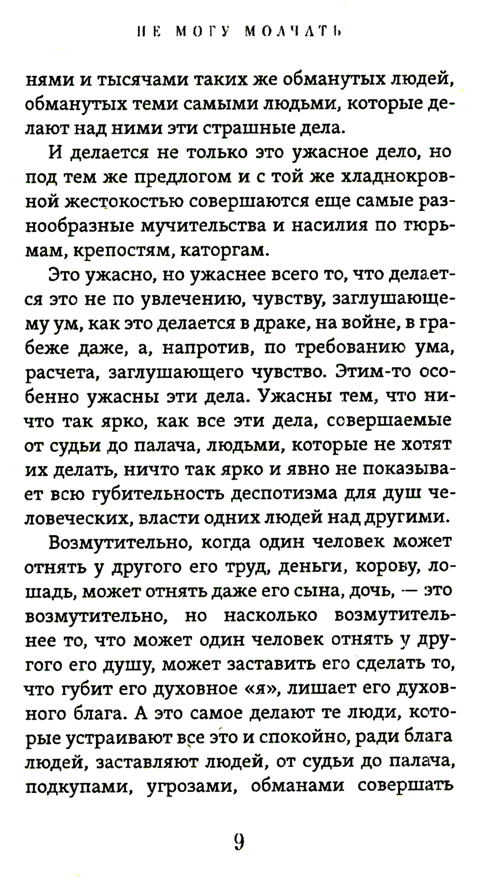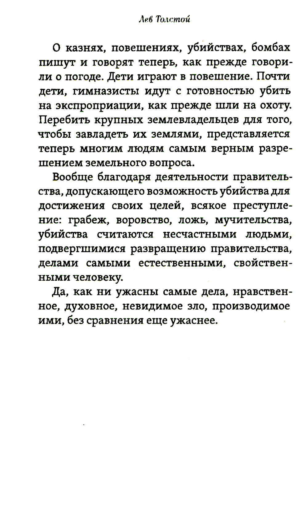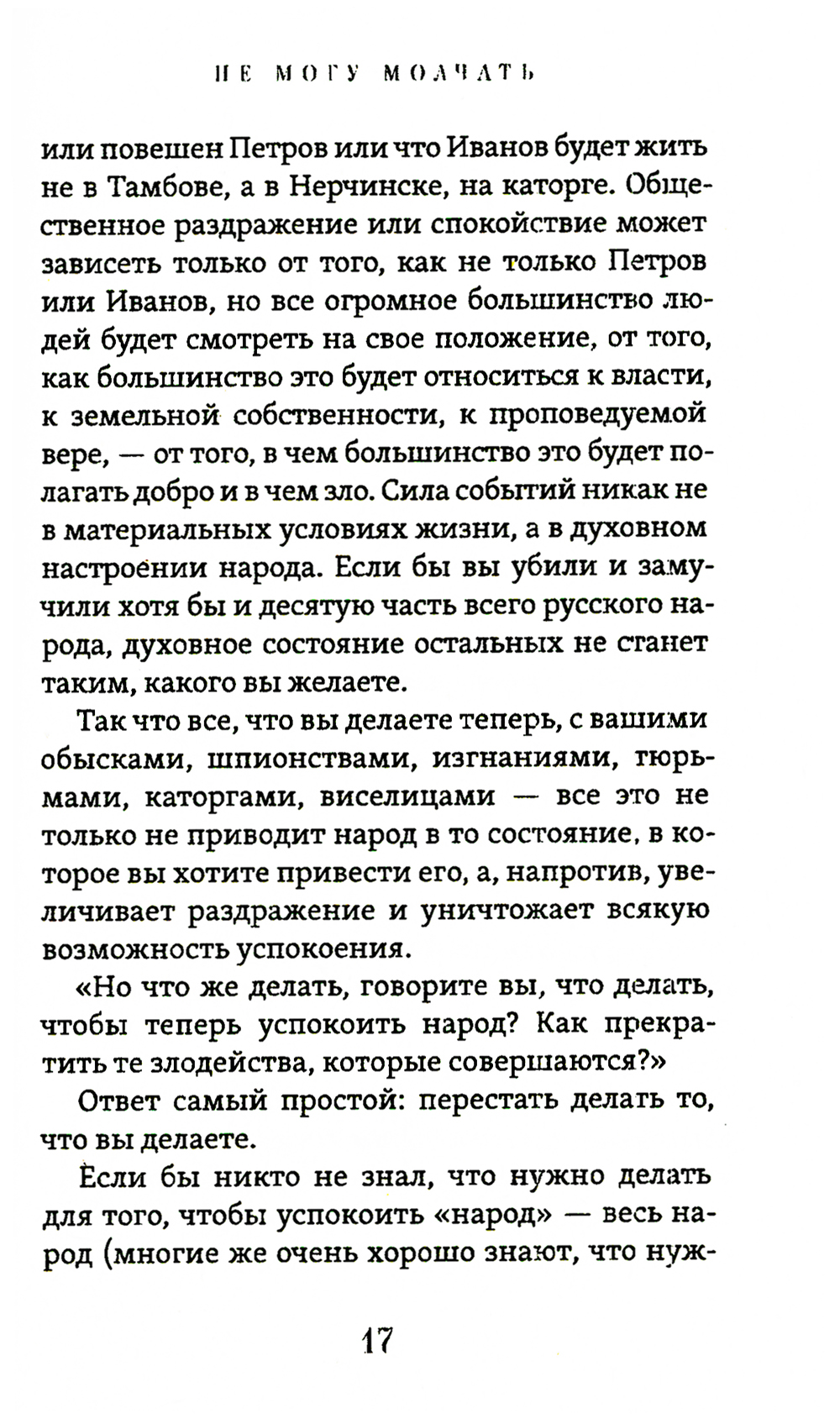 В настоящий сборник включены две статьи, написанные Л.Н. Толстым в 1908 году: 1) «Не могу молчать»; 2) «Закон ненависти и закон любви», а также небольшой рассказ А.П. Гилярова «Таинственное явление во сне Льва Николаевича Толстого железнодорожному сторожу ст. Астапово». Под впечатлением от массовых репрессий в отношении крестьян великий русский писатель и мыслитель обратился к теме насилия со стороны государства и справедливого общественного мироустройства. Критикуя официальную позицию Русской Православной церкви, Л.Н. Толстой обращается к истокам христианства, к тексту Евангелий, убедительно доказывая пагубность нарушения основных этических и религиозных норм со стороны власть предержащих в целях водворения иллюзорного «общественного спокойствия». Глубокие мысли Л.Н. Толстого, изложенные в данном сборнике, имеют непреходящую ценность. Они актуальны и в наши дни.