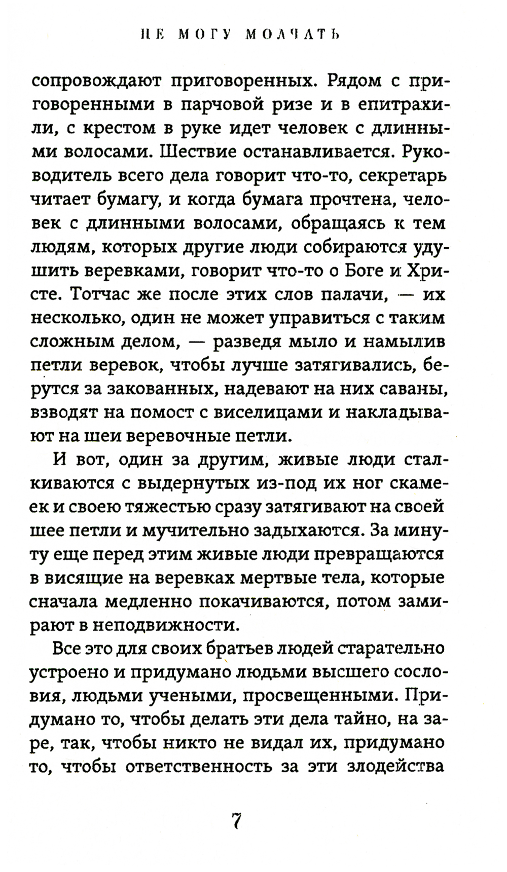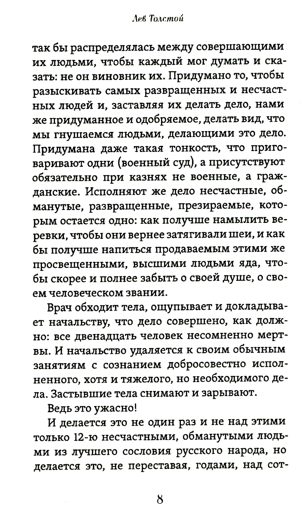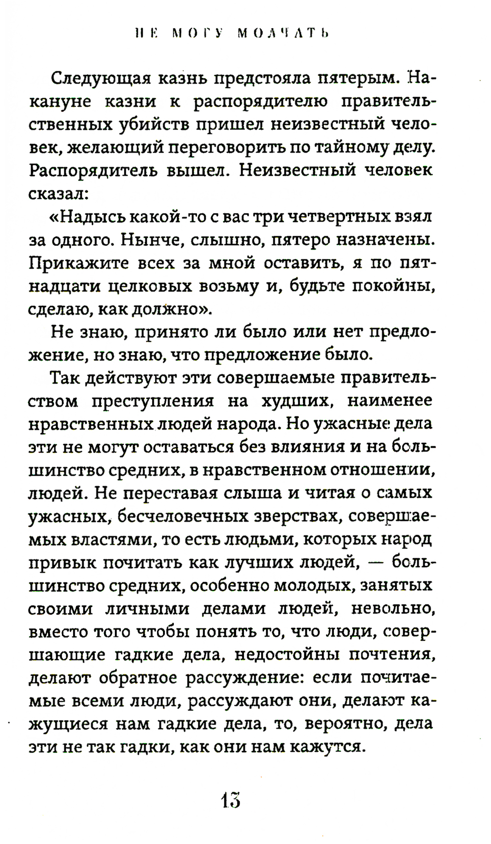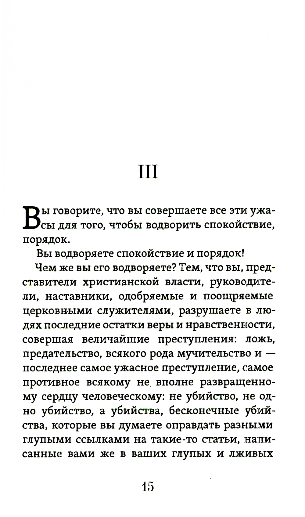 В настоящий сборник включены две статьи, написанные Л.Н. Толстым в 1908 году: 1) «Не могу молчать»; 2) «Закон ненависти и закон любви», а также небольшой рассказ А.П. Гилярова «Таинственное явление во сне Льва Николаевича Толстого железнодорожному сторожу ст. Астапово». Под впечатлением от массовых репрессий в отношении крестьян великий русский писатель и мыслитель обратился к теме насилия со стороны государства и справедливого общественного мироустройства. Критикуя официальную позицию Русской Православной церкви, Л.Н. Толстой обращается к истокам христианства, к тексту Евангелий, убедительно доказывая пагубность нарушения основных этических и религиозных норм со стороны власть предержащих в целях водворения иллюзорного «общественного спокойствия». Глубокие мысли Л.Н. Толстого, изложенные в данном сборнике, имеют непреходящую ценность. Они актуальны и в наши дни.