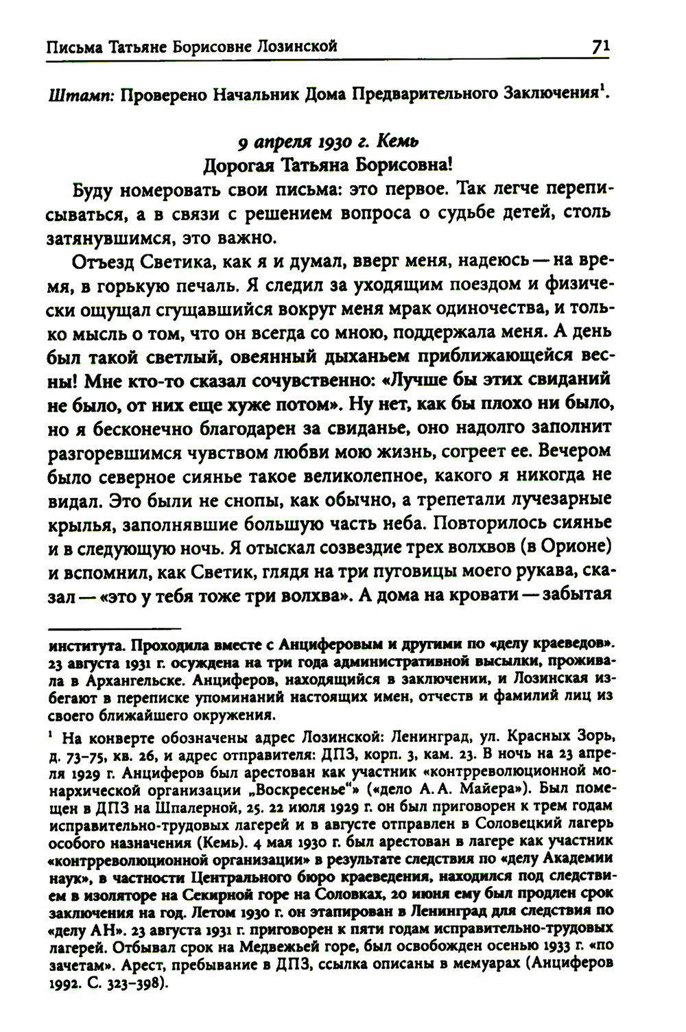 Николай Павлович Анциферов (1889-1958) - выдающийся историк и литературовед, автор классических работ по истории Петербурга. До выхода этого издания эпистолярное наследие Анциферова не публиковалось. Между тем разнообразие его адресатов и широкий круг знакомых, от Владимира Вернадского до Бориса Эйхенбаума и Марины Юдиной, делают переписку ученого ценным источником знаний о русской культуре XX века. Особый пласт в ней составляет собрание писем, посланных родным и друзьям из ГУЛ А Га (1929-1933, 1938-1939), -уникальный человеческий документ эпохи тотальной дегуманизации общества. Собранные по адресатам эпистолярные комплексы превращаются в особые стилевые и образно-сюжетные единства, а вместе они-литературный памятник, отражающий реалии времени, историю судьбы свидетеля трагических событий XX века.| Издательство | Новое литературное обозрение |