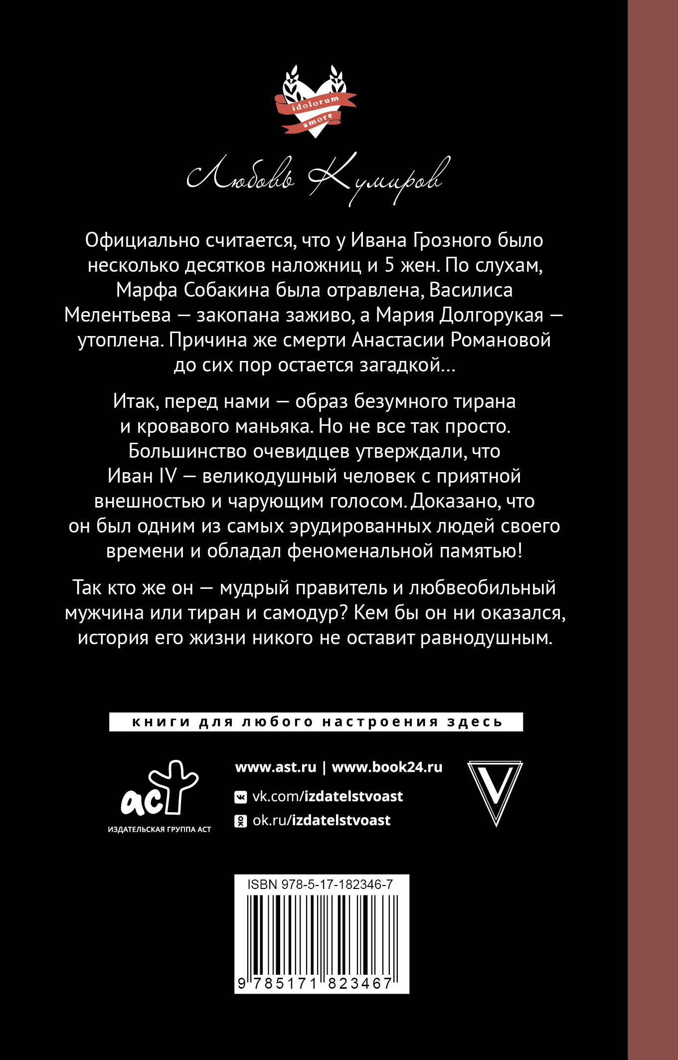 Официально считается, что у Ивана Грозного было несколько десятков наложниц и 5 жен. По слухам, Марфа Собакина была отравлена, Василиса Мелентьева - закопана заживо, а Мария Долгорукая - утоплена. Причина же смерти Анастасии Романовой до сих пор остается загадкой… Итак, перед нами - образ безумного тирана и кровавого маньяка. Но не все так просто. Большинство очевидцев утверждали, что Иван IV - великодушный человек с приятной внешностью и чарующим голосом. Доказано, что он был одним из самых эрудированных людей своего времени и обладал феноменальной памятью! Так кто же он - мудрый правитель и любвеобильный мужчина или тиран и самодур? Кем бы он ни оказался, история его жизни никого не оставит равнодушным.| Издательство | Издательство "АСТ" |