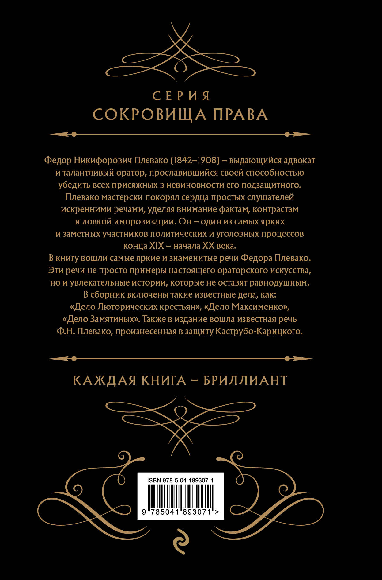Фёдор Никифорович Плевако (1842-1908) - выдающийся адвокат и талантливый оратор, прославившийся своей способностью убедить всех присяжных в невиновности его подзащитного. Плевако мастерски покорял сердца простых слушателей искренними речами, уделяя внимание фактам, контрастам и ловкой импровизации. Он - один из самых ярких и заметных участников политических и уголовных процессов конца XIX - начала XX века. В книгу вошли самые яркие и знаменитые речи Федора Плевако. Эти речи не просто примеры настоящего ораторского искусства, но и увлекательные истории, которые не оставят равнодушным. В сборнике включены такие известные дела, как: «Дело Люторических крестьян», «Дело Максименко», «Дело Замятиных». Также в издание вошла известная речь Ф.Н. Плевако, произнесенная в защиту Каструбо-Карицкого.| Издательство | ООО "Издательство "Эксмо" |