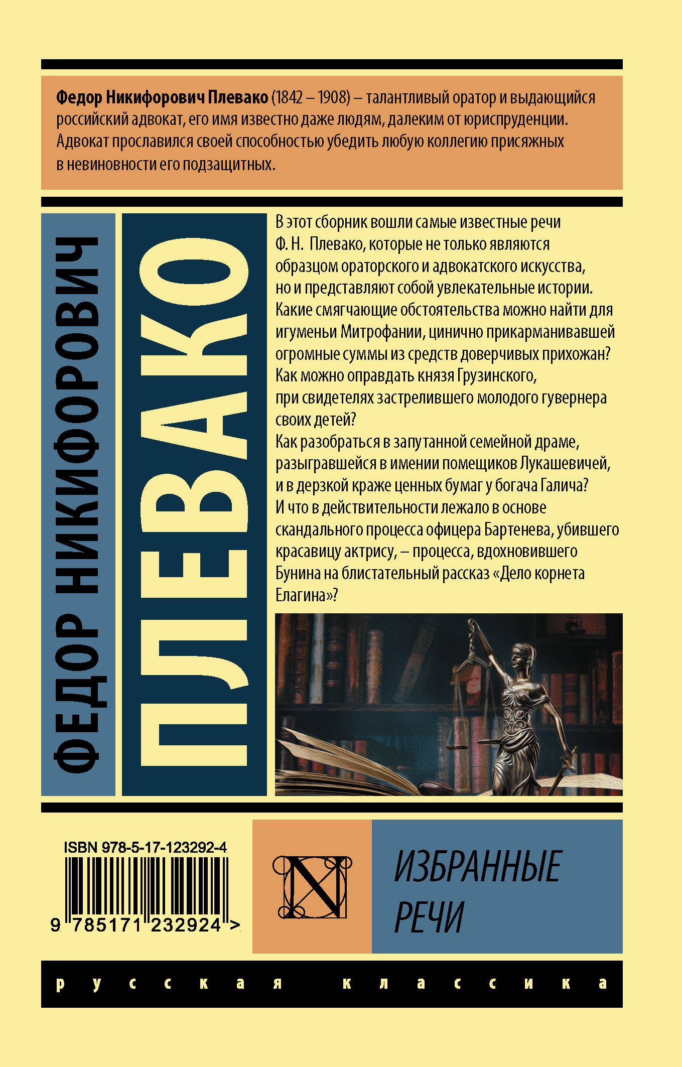 Федор Никифорович Плевако (1842 - 1908) - талантливый оратор и выдающийся российский адвокат, его имя известно даже людям, далеким от юриспруденции. Адвокат прославился своей способностью убедить любую коллегию присяжных в невиновности его подзащитных. В этот сборник вошли самые известные речи Ф. Н. Плевако, которые не только являются образцом ораторского и адвокатского искусства, но и представляют собой увлекательные истории. Какие смягчающие обстоятельства можно найти для игуменьи Митрофании, цинично прикарманивавшей огромные суммы из средств доверчивых прихожан? Как можно оправдать князя Грузинского, при свидетелях застрелившего молодого гувернера своих детей? Как разобраться в запутанной семейной драме, разыгравшейся в имении помещиков Лукашевичей, и в дерзкой краже ценных бумаг у богача Галича? И что в действительности лежало в основе скандального процесса офицера Бартенева, убившего красавицу актрису, - процесса, вдохновившего Бунина на блистательный рассказ "Дело корнета Елагина"?| Издательство | ИЗДАТЕЛЬСТВО "АСТ" |