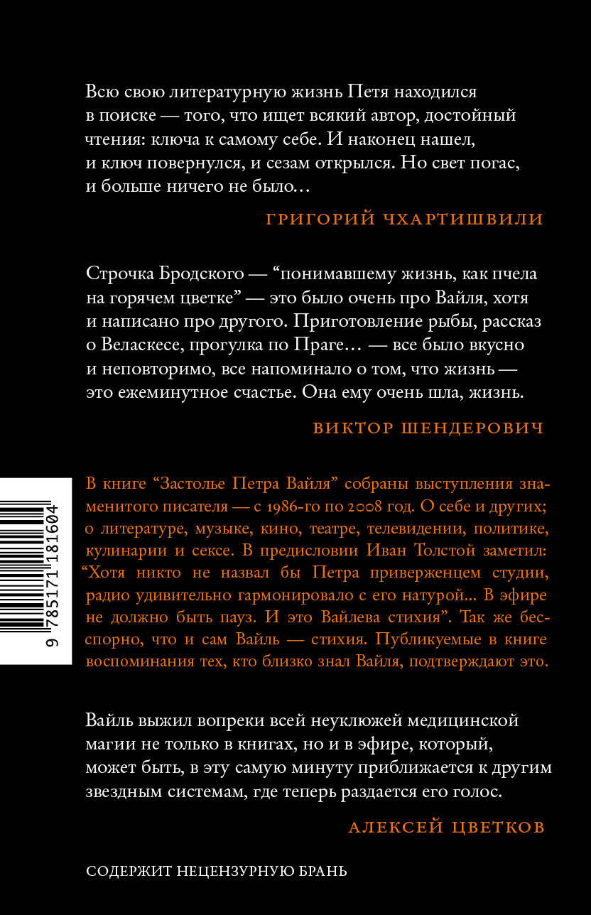 Сборник, состоящий из самых ярких выступлений Петра Вайля на Радио Свобода и воспоминаний коллег, друзей и членов семьи об этом удивительном писателе и жизнелюбивом человеке, покинувшем нас в 2009 году. Острые, глубокие и оригинальные мысли о самых разных сферах жизни, от литературы, истории и политики до кинематографа, кулинарии и секса. Для того, чтобы понять весь диапазон затрагиваемых вопросов и проблем, достаточно лишь прочитать название главок, каждая из которых - стенограмма какой-либо передачи Радио Свобода. «Владимир Уфлянд глазами Иосифа Бродского», «Вино в кулинарии», «Советский театр сегодня», «Памяти Александра Башлачева», «Вдова командира "Курска"», «О русском языке», «Чарли Чаплин в "Огнях большого города"», «Японские впечатления», «О любимой книге Розанова», «Алкоголь у классиков»… И для каждой из этих тем Вайль находит не только оригинальную трактовку, но и свою интонацию, свой ритм и тон. Невероятное количество совершенно поразительных историй, превосходный юмор, море увлекательных фактов: кажется, нет такого вопроса, на который Вайль ответил бы скучно. Отдельного внимания заслуживает последняя часть книги, где воспоминаниями о писателе делятся его друзья, коллеги и родственники: Элла Вайль, Сергей Гандлевский, Виктор Шендерович, Игорь Померанцев, Александр Генис, Григорий Чхартишвили, Елена Петрушанская, Макс Вайль и многие другие.| Издательство | ИЗДАТЕЛЬСТВО "АСТ" |