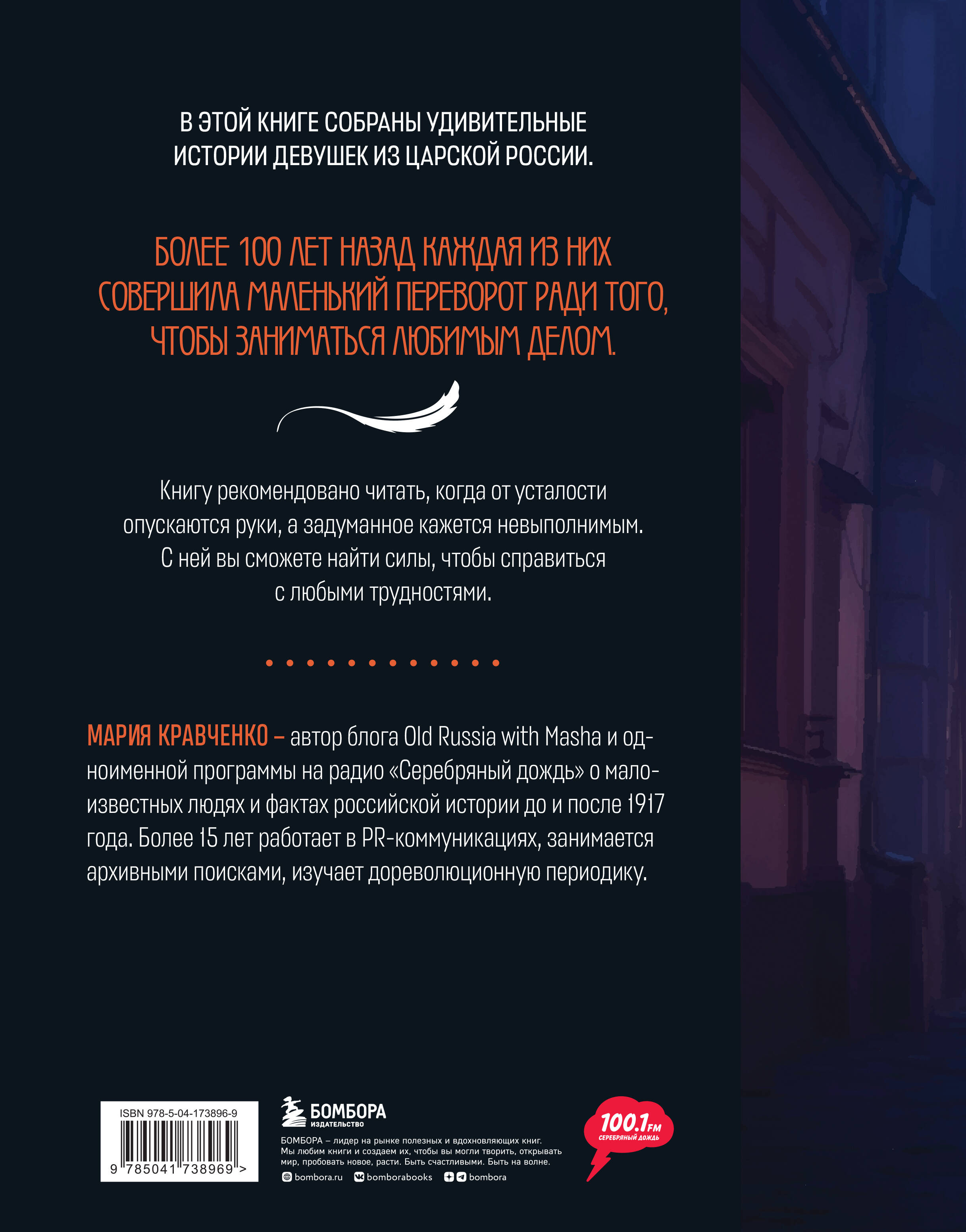 В этой книге собраны удивительные истории девушек из Царской России. Более 100 лет назад каждая из них совершила маленький переворот ради того, чтобы заниматься любимым делом. Книгу рекомендовано читать, когда от усталости опускаются руки, а задуманное кажется невыполнимым. С ней вы сможете найти силы, чтобы справиться с любыми трудностями. МАРИЯ КРАВЧЕНКО - автор блога Old Russia with Masha и одноименной программы на радио «Серебряный дождь» о малоизвестных людях и фактах российской истории до и после 1917 года. Более 15 лет работает в PR-коммуникациях, занимается архивными поисками, изучает дореволюционную периодику.| Издательство | ООО "Издательство "Эксмо" |