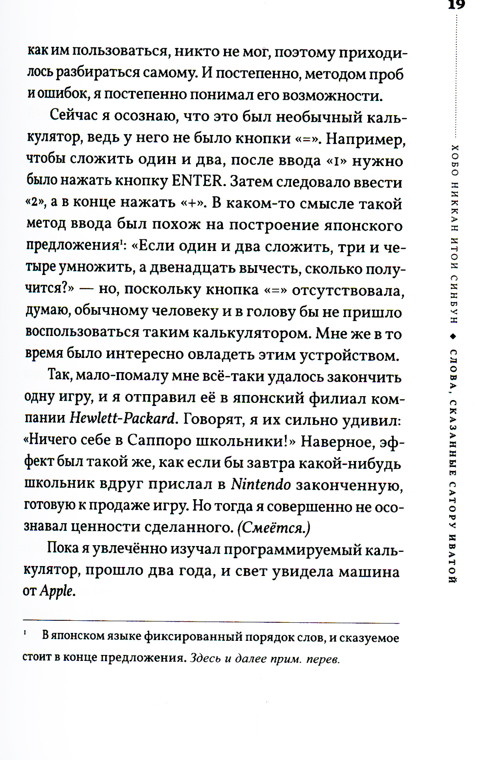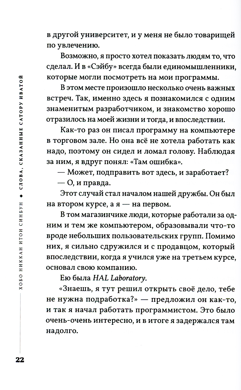 Эта книга - сборник слов Сатору Иваты, бывшего президента компании Nintendo. Она представляет собой скомпонованные вырезки значимых высказываний из множества интервью, опубликованных в интернет-издании «Хобо Никкан Итои Синбун», а также из статей раздела «Ивата спрашивает» официального сайта компании Nintendo. Сатору Ивата - гениальный программист, подаривший миру множество известных игр, а также человек, который на посту главы Nintendo руководил разработкой таких революционных игровых устройств, как консоли Nintendo DS и Wii. И данная книга является квинтэссенцией его творческих идей, методов управлений, системы ценностей, принципов поведения и философии. Кроме того, это издание включает уникальные интервью с людьми, которые знали Сатору Ивату лучше, чем кто-либо ещё: его друзьями - Сигэру Миямото из Nintendo и Сигэсато Итои из «Хобо Никкан Итои Синбун».| Издательство | ИД Истари Комикс |