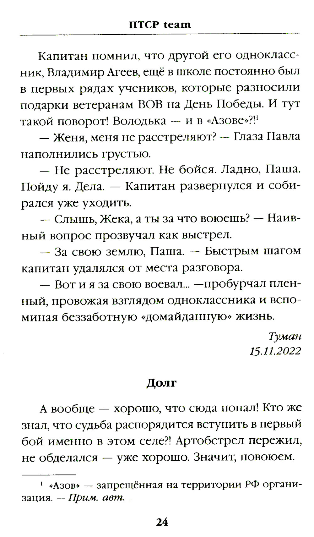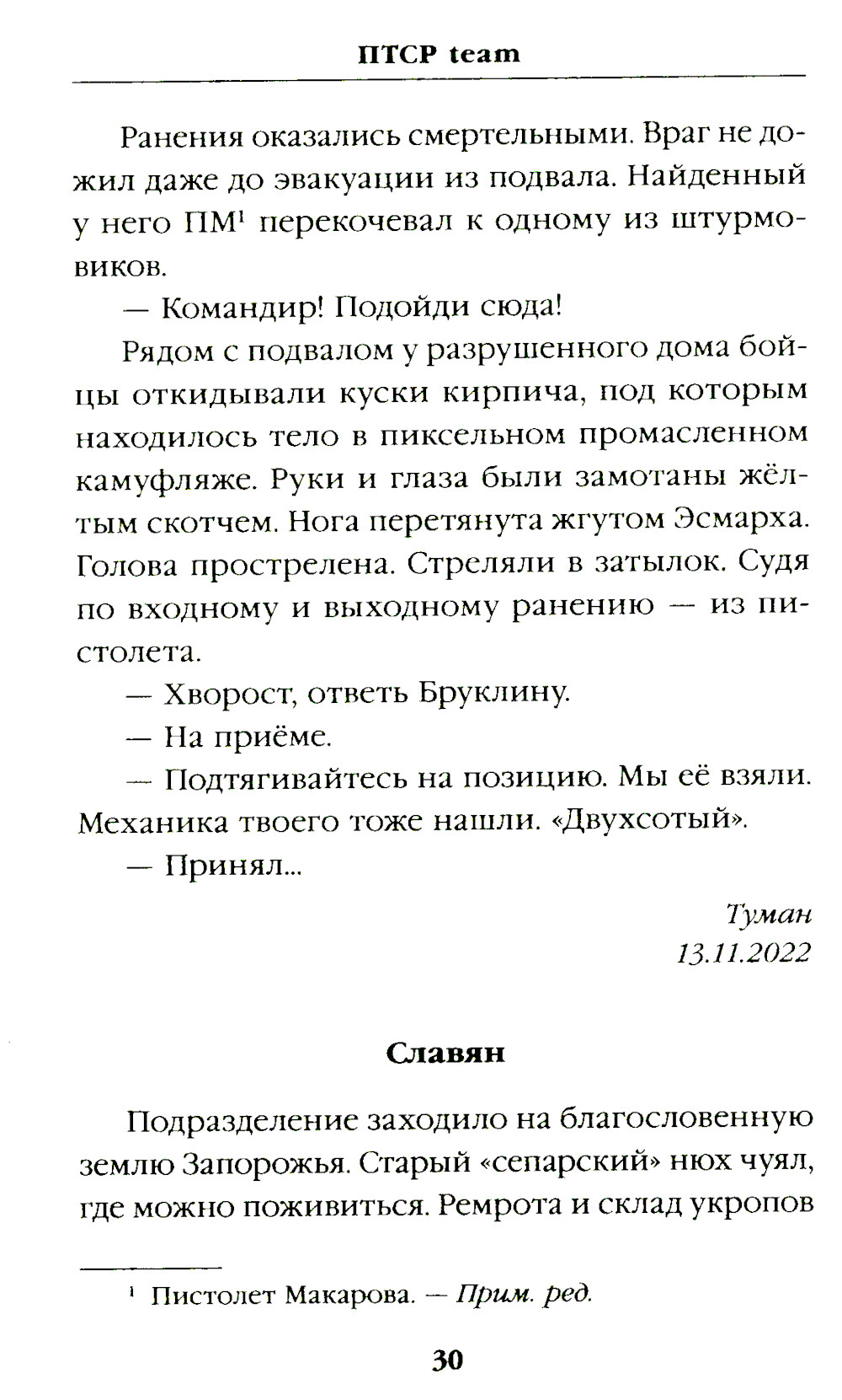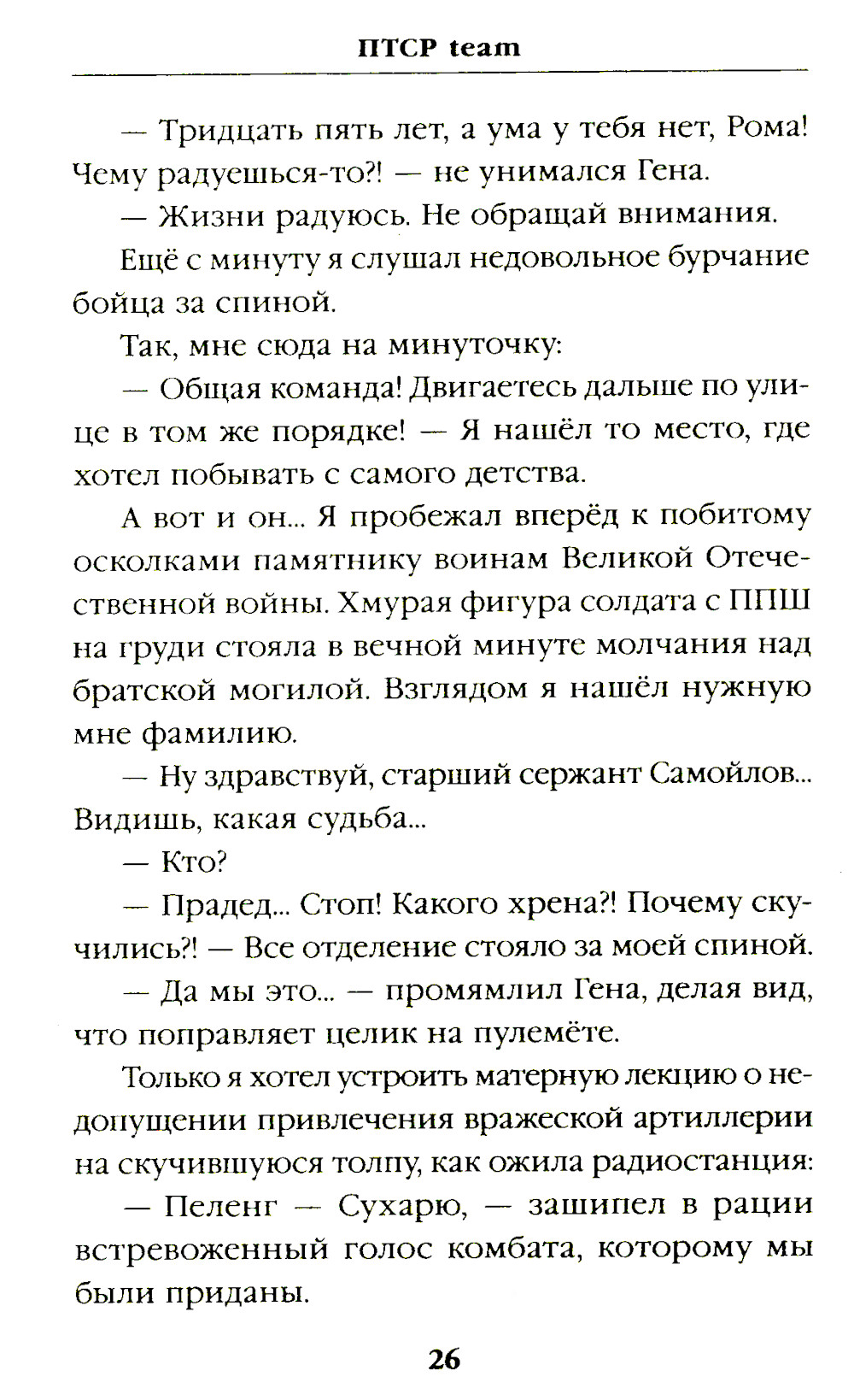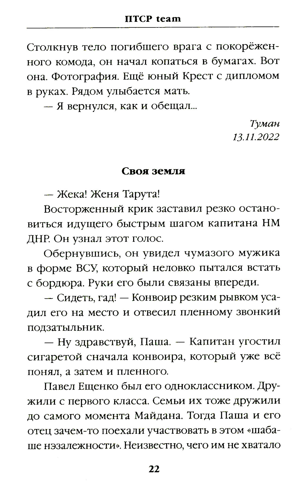 Сообщество ПТСР TEAM - это небольшая группа людей со схожими интересами, которая образовалось за пару лет до СВО на небезызвестной медийной платформе RSOTM. В него вошли бывшие и действующие военнослужащие, сотрудники силовых структур, частных военных компаний, ветераны боевых действий, ополченцы ЛДНР, гражданские, которым интересна военная тематика. Оно стало неким закрытым сообществом, объединенным общими интересами и дружбой. В мае 2022 года, уже после начала СВО, появилась и медийная составляющая. Открылся канал в Telegram и группа в VK под названиями «ПТСР TEAM». Особенностью этих ресурсов стали рассказы участников сообщества, которые не могли не тронуть сердца подписчиков. Активные участники ПТСР TEAM принимали и принимают участие в боевых действиях. Удостоены высоких государственных, ведомственных наград и наград частных добровольческих формирований. Горечь утраты товарищей так же не прошла стороной, но коллектив продолжает делать всё возможное для процветания и Победы своей Отчизны!