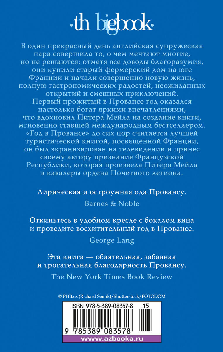 В один прекрасный день английская супружеская пара совершила то, о чем мечтают многие, но не решаются: отметя все доводы благоразумия, они купили старый фермерский дом на юге Франции и начали совершенно новую жизнь, полную гастрономических радостей, неожиданных открытий и смешных приключений. Первый прожитый в Провансе год оказался настолько богат яркими впечатлениями, что вдохновил Питера Мейла на создание книги, мгновенно ставшей международным бестселлером. "Год в Провансе" до сих пор считается лучшей туристической книгой, посвященной Франции, он был экранизирован на телевидении и принес своему автору признание Французской Республики, которая произвела Питера Мейла в кавалеры ордена Почетного легиона.| Издательство | Азбука-Аттикус Издат.группа ООО |