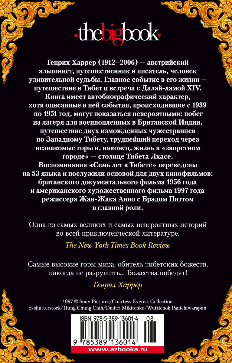 Генрих Харрер (1912-2006) - австрийский альпинист, путешественник и писатель. Его книга "Семь лет в Тибете (Моя жизнь при дворе Далай-ламы)", впервые опубликованная на немецком языке в 1952 году, была переведена на 53 языка и послужила основой для двух кинофильмов: британского документального фильма 1956 года и знаменитого американского художественного фильма 1997 года с Брэдом Питтом в главной роли. Благодаря настоящему изданию российский читатель впервые ознакомится с полным текстом книги Генриха Харрера в переводе с немецкого. Авторская интонация и структура текста бережно сохранены. Впервые публикуются фотографии, сделанные во время этого путешествия.| Издательство | Азбука-Аттикус Издат.группа ООО |
