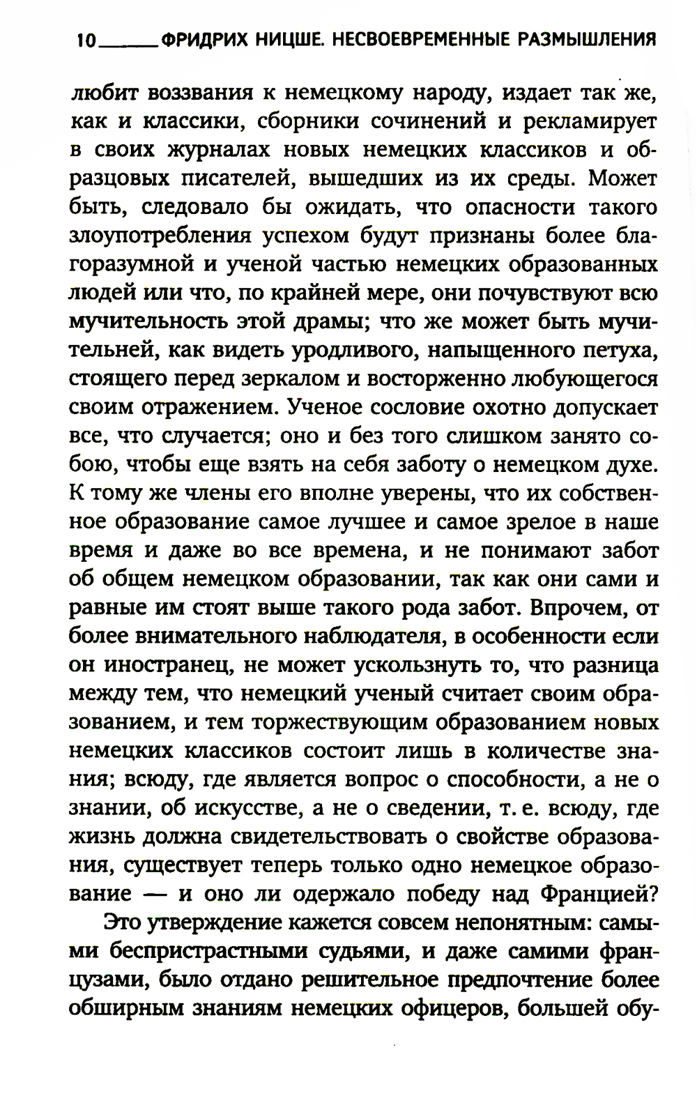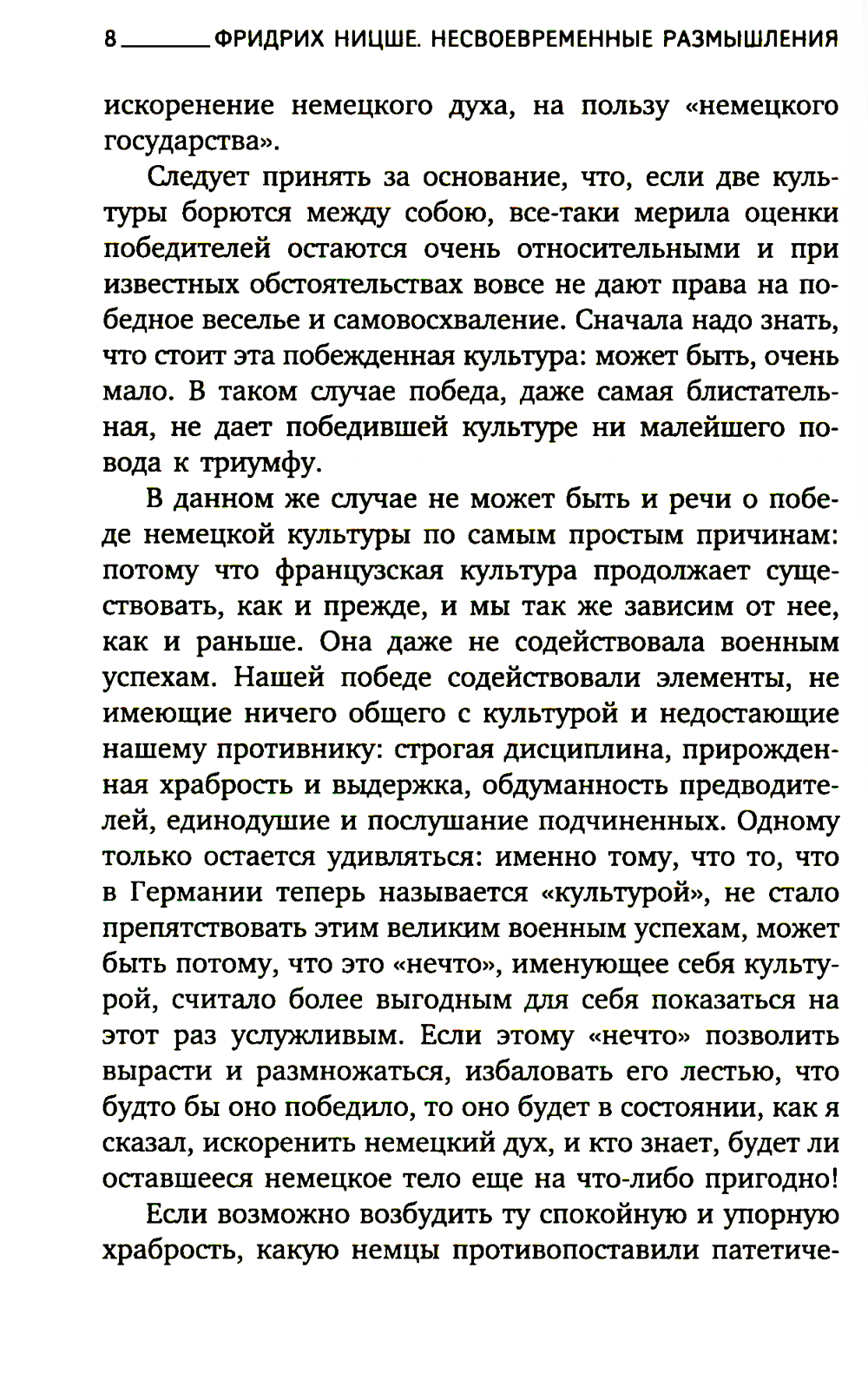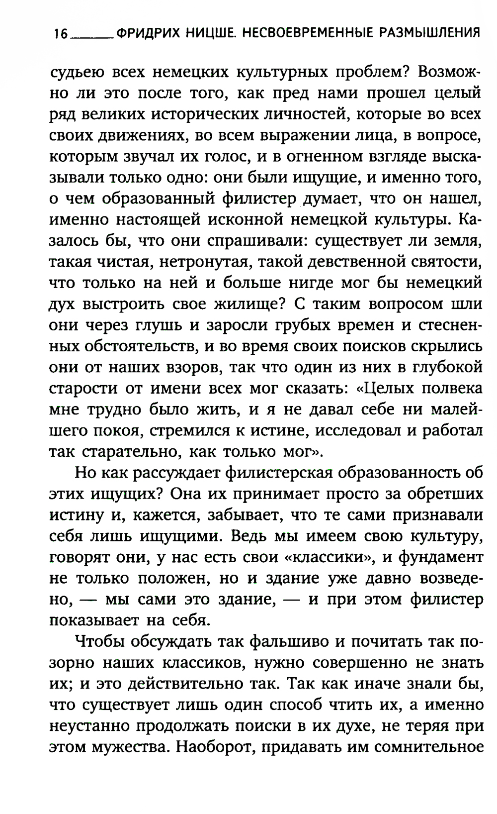 Немецкий мыслитель Фридрих Ницше (1844-1900), автор выдающихся сочинений «Веселая наука», «Так говорил Заратустра», «Генеалогия морали», «По ту сторону добра и зла», «Воля к власти» и многих других, прославился как создатель самобытного учения, оказавшего огромное влияние на философию XX века в целом. Сборник «Несвоевременные размышления», одна из первых работ Ницше, задумывался как серия из двадцати эссе, затрагивающих важнейшие вопросы истории и культуры. В итоге были написаны только четыре очерка, однако они во многом определили дальнейшее развитие творчества великого философа. Размышляя об общей ситуации в исторической науке, рассматривая проблемы религии, изучая наследие Вагнера и Шопенгауэра, Ницше выстраивает оригинальные критерии оценки действительности, ставящие под сомнение общепринятые истины.| Издательство | Лениздат |