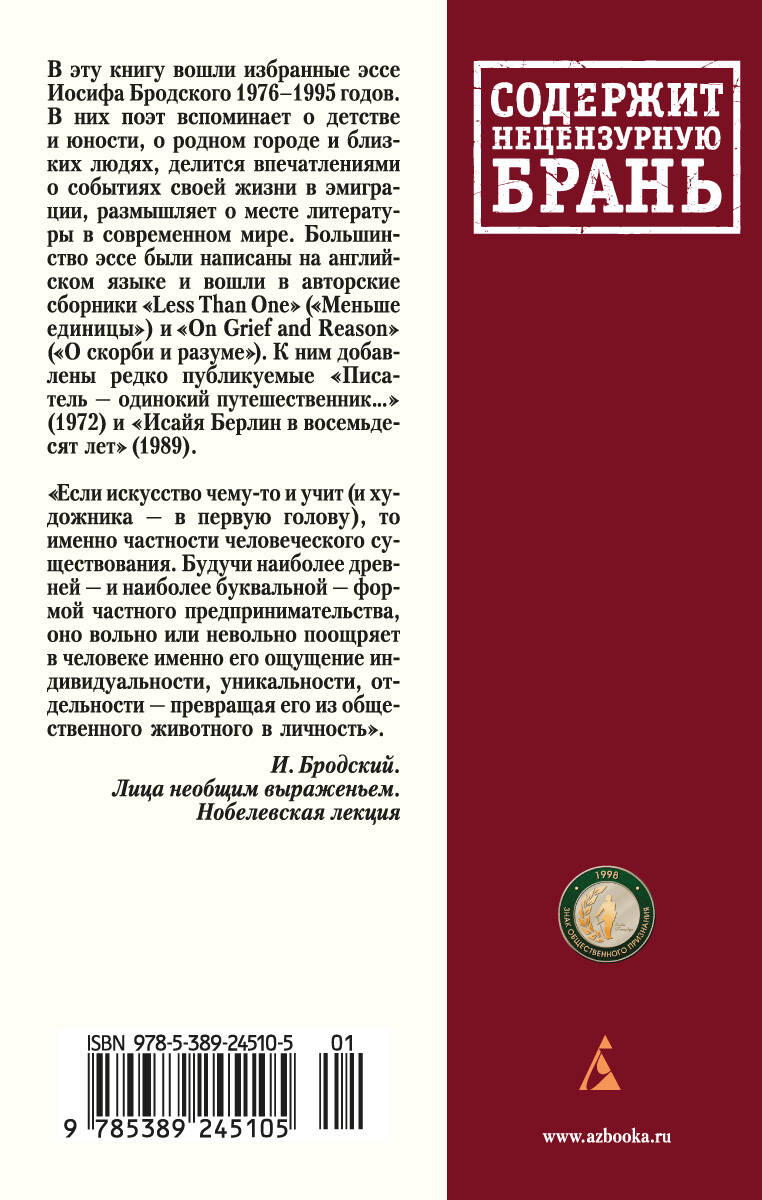 В книгу вошли избранные эссе Иосифа Бродского 1976-1995 годов. В них поэт вспоминает о детстве и юности, о родном городе и близких людях, делится впечатлениями о событиях своей жизни в эмиграции, размышляет о месте литературы в современном мире. Большинство эссе были написаны на английском языке и вошли в авторские сборники "Less Than One" ("Меньше единицы") и "On Grief and Reason" ("О скорби и разуме"). К ним добавлены редко публикуемые "Писатель - одинокий путешественник..." (1972) и "Исайя Берлин в восемьдесят лет" (1989).| Издательство | Азбука-Аттикус Издат.группа ООО |