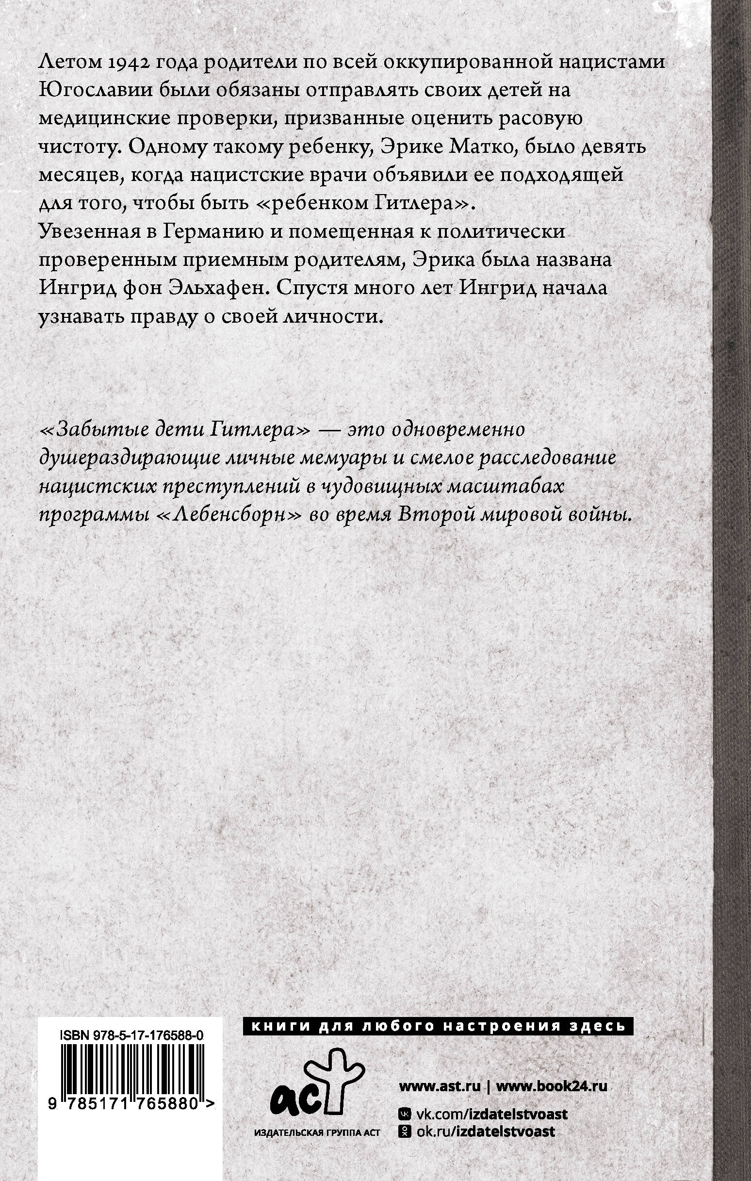 Летом 1942 года родители по всей оккупированной нацистами Югославии были обязаны отправлять своих детей на медицинские проверки, призванные оценить расовую чистоту. Одному такому ребенку, Эрике Матко, было девять месяцев, когда нацистские врачи объявили ее подходящей для того, чтобы быть "ребенком Гитлера". Увезенная в Германию и помещенная к политически проверенным приемным родителям, Эрика была названа Ингрид фон Эльхафен. Спустя много лет Ингрид начала узнавать правду о своей личности. "Забытые дети Гитлера" - это одновременно душераздирающие личные мемуары и смелое расследование нацистских преступлений в чудовищных масштабах программы "Лебенсборн" во время Второй мировой войны.| Издательство | Издательство "АСТ" |