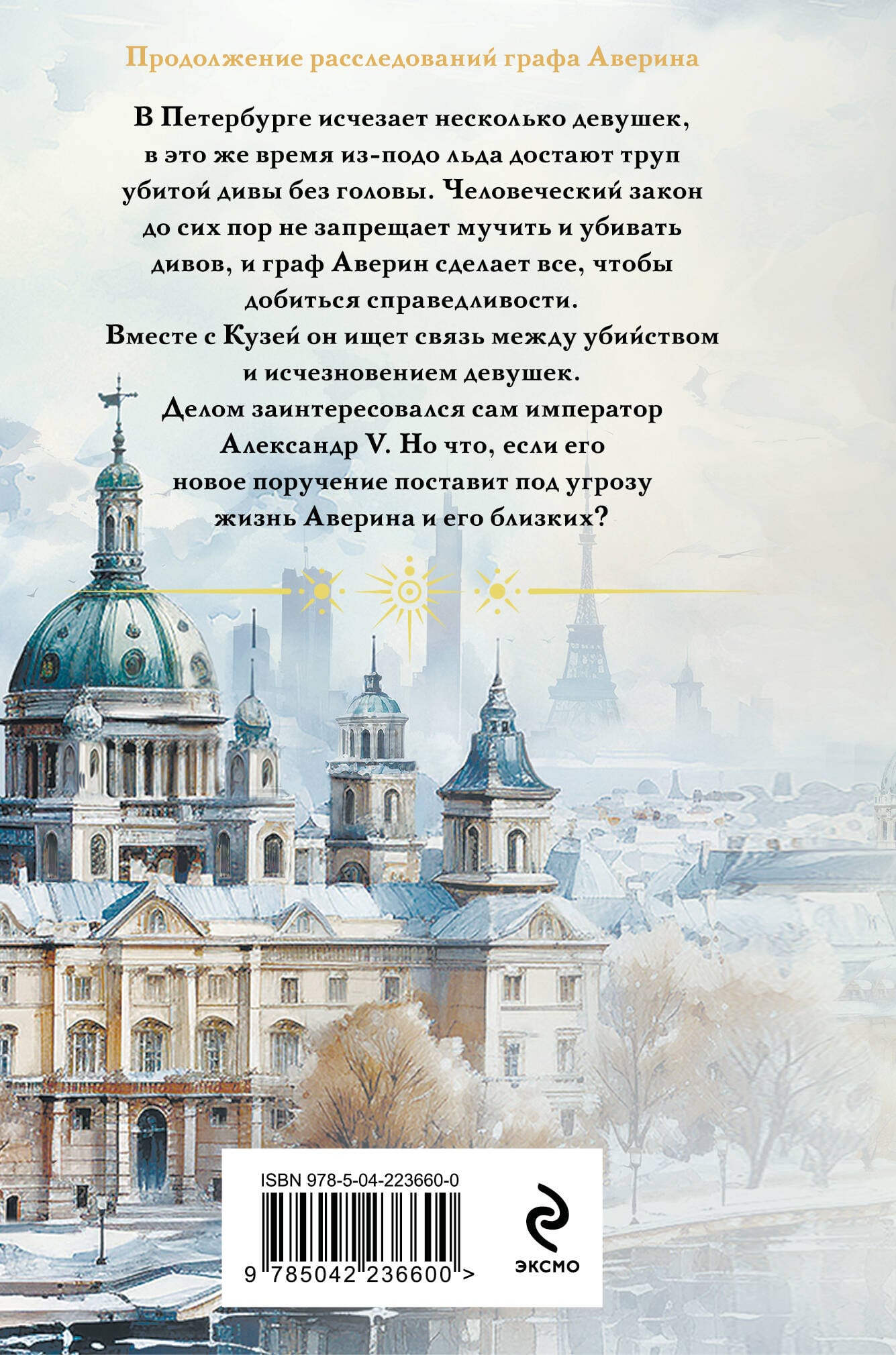 Продолжение расследований графа Аверина В Петербурге исчезает несколько девушек, в это же время из-подо льда достают труп убитой дивы без головы. Человеческий закон до сих пор не запрещает мучить и убивать дивов, и граф Аверин сделает все, чтобы добиться справедливости. Вместе с Кузей он ищет связь между убийством и исчезновением девушек. Делом заинтересовался сам император Александр V. Но что если его новое поручение поставит под угрозу жизнь Аверина и его близких?| Издательство | ООО "Издательство "Эксмо" |