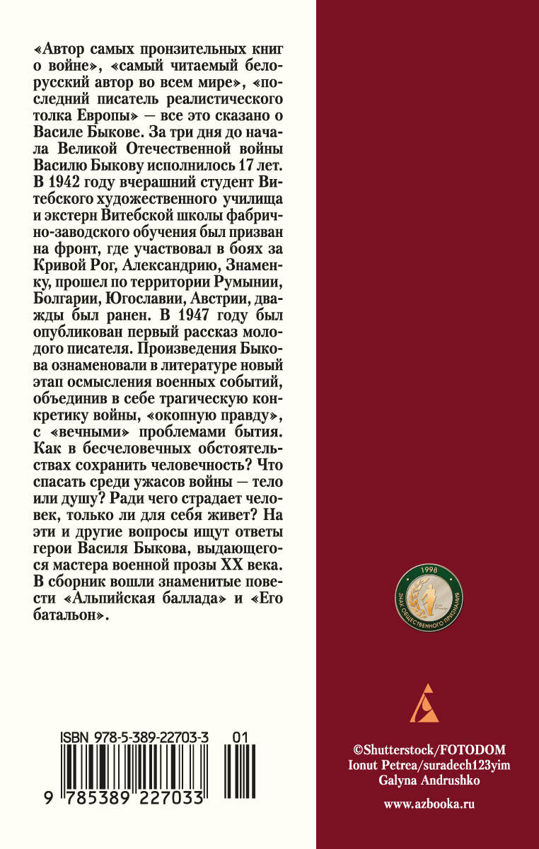 "Автор самых пронзительных книг о войне", "самый читаемый белорусский автор во всем мире", "последний писатель реалистического толка Европы" - все это сказано о Василе Быкове. За три дня до начала Великой Отечественной войны Василю Быкову исполнилось 17 лет. В 1942 году вчерашний студент Витебского художественного училища и экстерн Витебской школы фабрично-заводского обучения был призван на фронт, где участвовал в боях за Кривой Рог, Александрию, Знаменку, прошел по территории Румынии, Болгарии, Югославии, Австрии, дважды был ранен. В 1947 году был опубликован первый рассказ молодого писателя. Произведения Быкова ознаменовали в литературе новый этап осмысления военных событий, объединив в себе трагическую конкретику войны, "окопную правду", с "вечными" проблемами бытия. Как в бесчеловечных обстоятельствах сохранить человечность? Что спасать среди ужасов войны - тело или душу? Ради чего страдает человек, только ли для себя живет? На эти и другие вопросы ищут ответы герои Василя Быкова, выдающегося мастера военной прозы ХХ века. В сборник вошли знаменитые повести "Альпийская баллада" и "Его батальон".| Издательство | Азбука-Аттикус Издат.группа ООО |