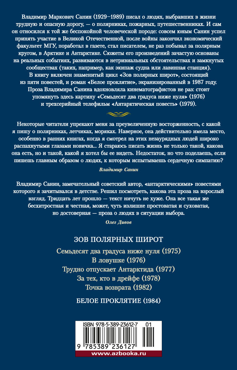 Владимир Маркович Санин (1929-1989) писал о людях, выбравших в жизни трудную и опасную дорогу, - о полярниках, пожарных, путешественниках. И сам он относился к той же беспокойной человеческой породе: совсем юным Санин успел принять участие в Великой Отечественной, после войны закончил экономический факультет МГУ, поработал в газете, стал писателем, не раз побывал за полярным кругом, в Арктике и Антарктике. Сюжеты его произведений зачастую основаны на реальных событиях, развиваются в нетривиальных обстоятельствах и замкнутых сообществах (таких, например, как экипаж судна или лавинная станция). В книгу включен знаменитый цикл "Зов полярных широт", состоящий из пяти повестей, и роман "Белое проклятие", экранизированный в 1987 году. Проза Владимира Санина вдохновляла кинематографистов не раз: стоит упомянуть здесь картину "Семьдесят два градуса ниже нуля" (1976) и трехсерийный телефильм "Антарктическая повесть" (1979).| Издательство | Азбука-Аттикус Издат.группа ООО |