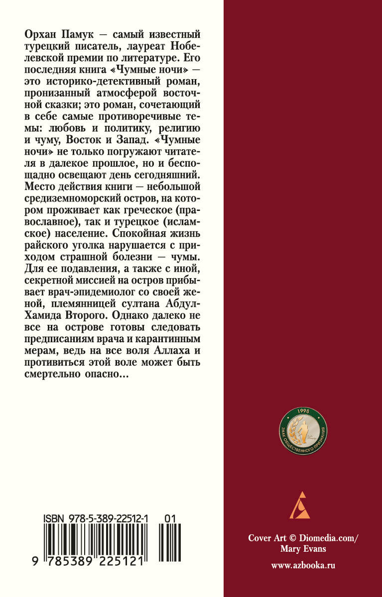Орхан Памук - самый известный турецкий писатель, лауреат Нобелевской премии по литературе. Его последняя книга "Чумные ночи" - это историко-детективный роман, пронизанный атмосферой восточной сказки; это роман, сочетающий в себе самые противоречивые темы: любовь и политику, религию и чуму, Восток и Запад. "Чумные ночи" не только погружают читателя в далекое прошлое, но и беспощадно освещают день сегодняшний. Место действия книги - небольшой средиземноморский остров, на котором проживает как греческое (православное), так и турецкое (исламское) население. Спокойная жизнь райского уголка нарушается с приходом страшной болезни - чумы. Для ее подавления, а также с иной, секретной миссией на остров прибывает врач-эпидемиолог со своей женой, племянницей султана Абдул-Хамида Второго. Однако далеко не все на острове готовы следовать предписаниям врача и карантинным мерам, ведь на все воля Аллаха и противиться этой воле может быть смертельно опасно…| Издательство | Азбука-Аттикус Издат.группа ООО |