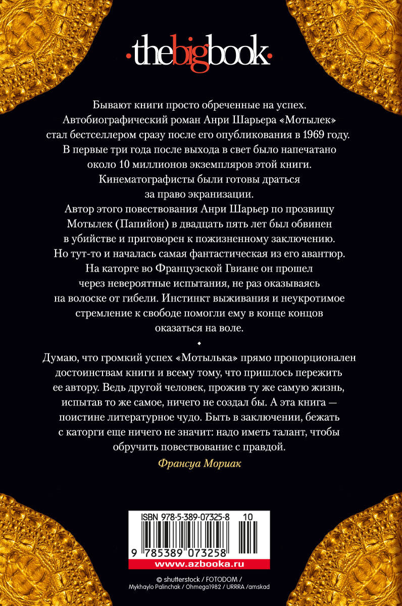 Бывают книги просто обреченные на успех. Автобиографический роман Анри Шарьера "Мотылек" стал бестселлером сразу после его опубликования в 1969 году. В первые три года после выхода в свет было напечатано около 10 миллионов экземпляров этой книги. Кинематографисты были готовы драться за право экранизации. В 1973 году состоялась премьера фильма Франклина Шеффнера, снятого по книге Шарьера (в главных ролях Стив Маккуин и Дастин Хоффман), ныне по праву причисленного к классике кинематографа. Автор этого повествования Анри Шарьер по прозвищу Мотылек (Папийон) в двадцать пять лет был обвинен в убийстве и приговорен к пожизненному заключению. Но тут-то и началась самая фантастическая из его авантюр. На каторге во Французской Гвиане он прошел через невероятные испытания, не раз оказываясь на волоске от гибели. Инстинкт выживания и неукротимое стремление к свободе помогли ему в конце концов оказаться на воле.| Издательство | Азбука-Аттикус Издат.группа ООО |