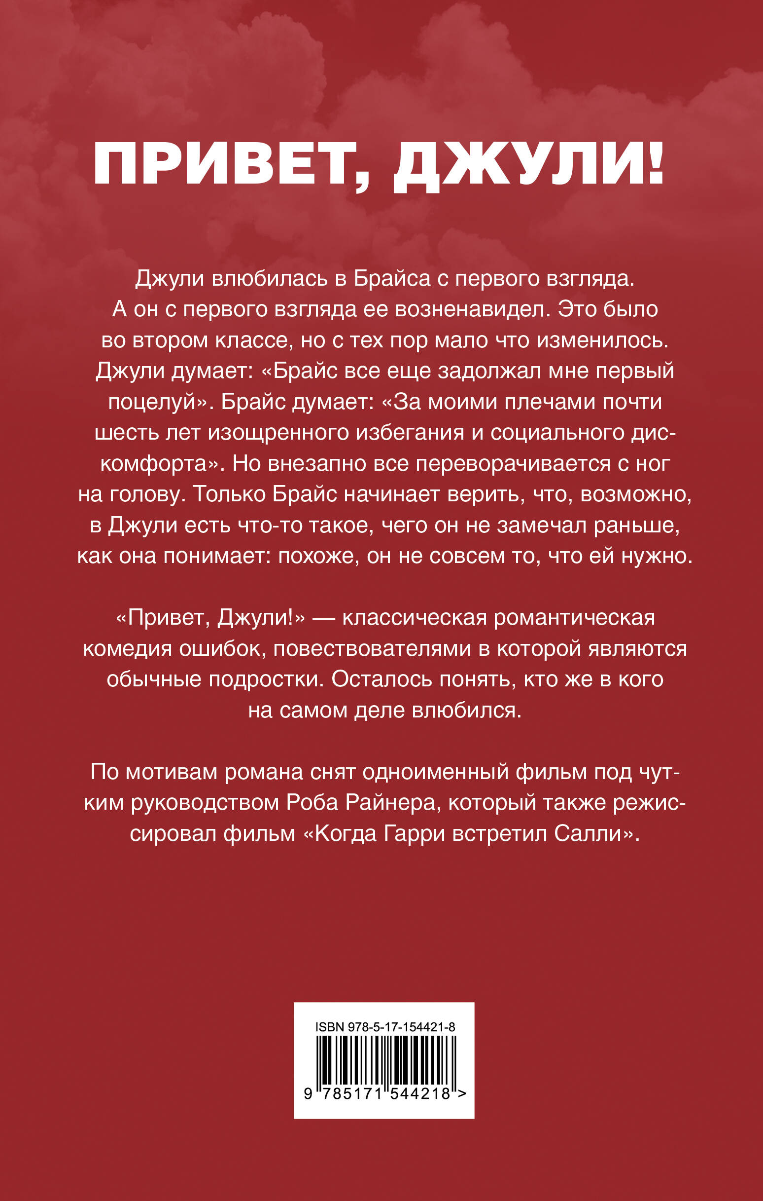 Джули влюбилась в Брайса с первого взгляда. А он с первого взгляда ее возненавидел. Это было во втором классе, но с тех пор мало что изменилось. Джули думает: "Брайс все еще задолжал мне первый поцелуй". Брайс думает: "За моими плечами почти шесть лет изощренного избегания и социального дискомфорта". Но внезапно все переворачивается с ног на голову. Только Брайс начинает думать, что, возможно, в Джули есть что-то такое, чего он не замечал раньше, как она понимает: похоже, он - не совсем то, что ей нужно. "Привет, Джули!" - классическая романтическая комедия ошибок, повествователями которой являются обычные подростки. Осталось понять, кто же в кого на самом деле влюбился. По мотивам романа снят одноименный фильм. Режиссером выступил Роб Райнер, который также режиссировал такие фильмы, как "Волк с Уолл-стрит" и "Когда Гарри встретил Салли".| Издательство | ИЗДАТЕЛЬСТВО "АСТ" |