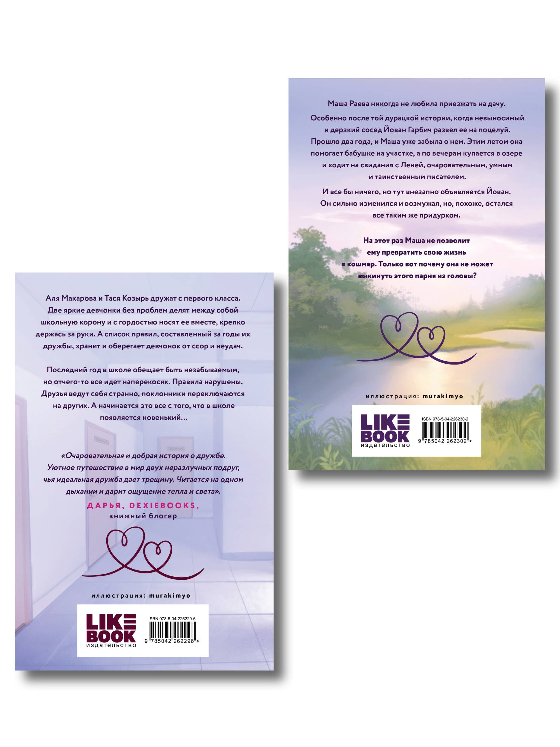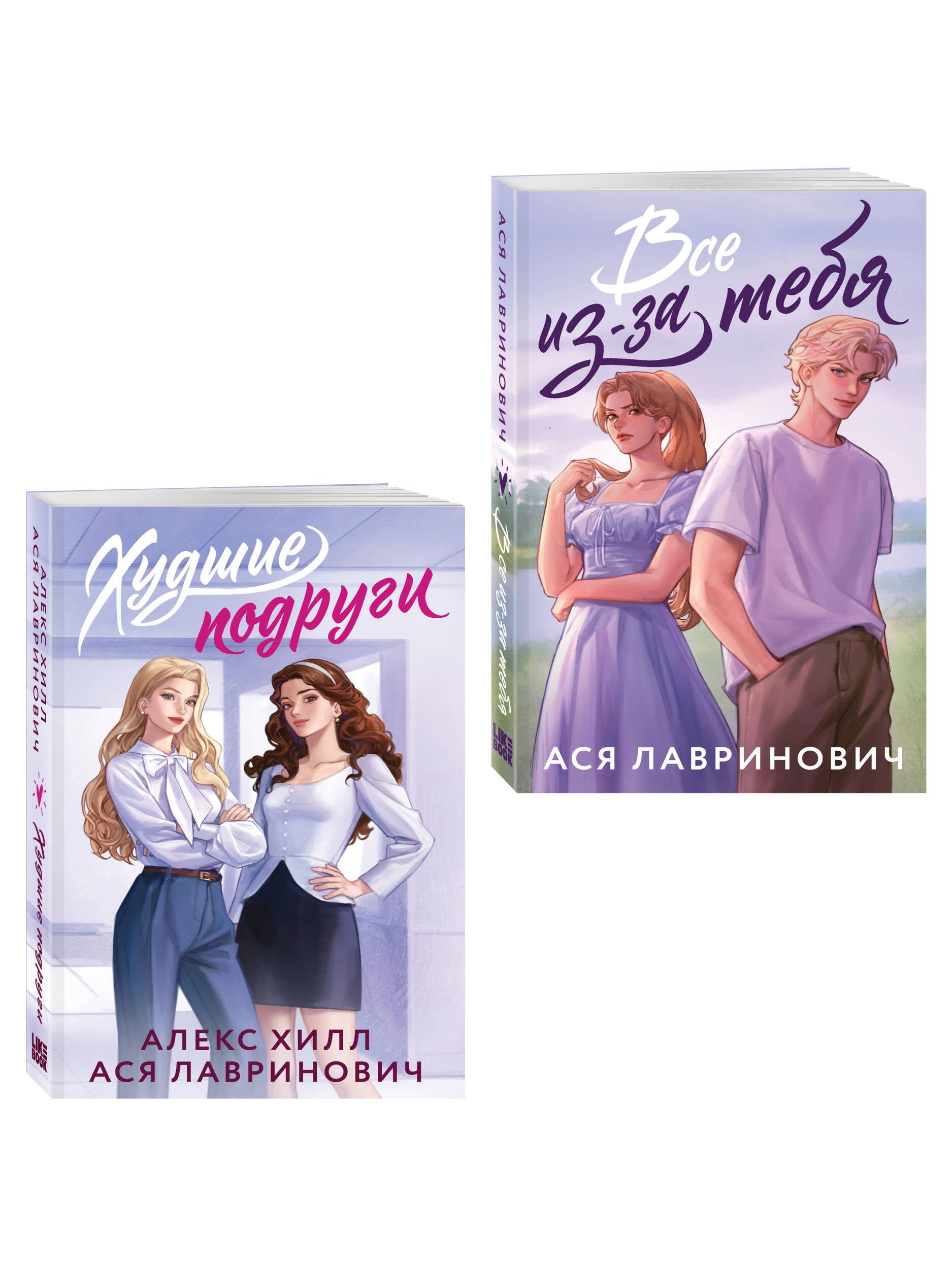 КОМПЛЕКТ ИЗ 2-Х КНИГ ЗВЕЗД РОССИЙСКОГО ЯНГ АДАЛТА В МЯГКОЙ ОБЛОЖКЕ С КЛАПАНАМИ! Стильные удобные покеты большого формата. Яркий дизайн с красочной иллюстрацией на обложке от популярной художницы murakimyo. «Худшие подруги» Аля Макарова и Тася Козырь дружат с первого класса. Две яркие девчонки без проблем делят между собой школьную корону и с гордостью носят ее вместе, крепко держась за руки. А список правил, составленный за годы их дружбы, хранит и оберегает девчонок от ссор и неудач. Последний год в школе обещает быть незабываемым, но отчего-то все идет наперекосяк. Правила нарушены. Друзья ведут себя странно, поклонники переключаются на других. А начинается это все с того, что в школе появляется новенький… «Все из-за тебя» Маша Раева никогда не любила приезжать на дачу. Особенно после той дурацкой истории, когда невыносимый и дерзкий сосед Йован Гарбич развел ее на поцелуй. Прошло два года, и Маша уже забыла о нем. Этим летом она помогает бабушке на участке, а по вечерам купается в озере и ходит на свидания с Леней, очаровательным, умным и таинственным писателем. И все бы ничего, но тут внезапно объявляется Йован. Он сильно изменился и возмужал, но, похоже, остался все таким же придурком. На этот раз Маша не позволит ему превратить свою жизнь в кошмар. Только вот почему она не может выкинуть этого парня из головы? «Светлая и добрая история о том, что чудо может быть совсем рядом». - Анна, books_holy_anna ОБ АВТОРАХ Ася Лавринович - один из самых популярных авторов российского янг эдалта в жанре современной сентиментальной прозы. Суммарный тираж ее проданных книг составляет более 1,6 млн экземпляров. Победитель премии «Выбор читателей 2023» на Livelib в номинации «Young Adult. Лучшая книга о подростках и для подростков». На две книги Аси - «Загадай любовь» и «Нелюбовь сероглазого короля» - куплены права на экранизацию от ОККО. Алекс Хилл - восходящая звезда сентиментальной Young Adult прозы. Совокупный тираж книг Алекс перевалил за отметку в 350 000 экземпляров.