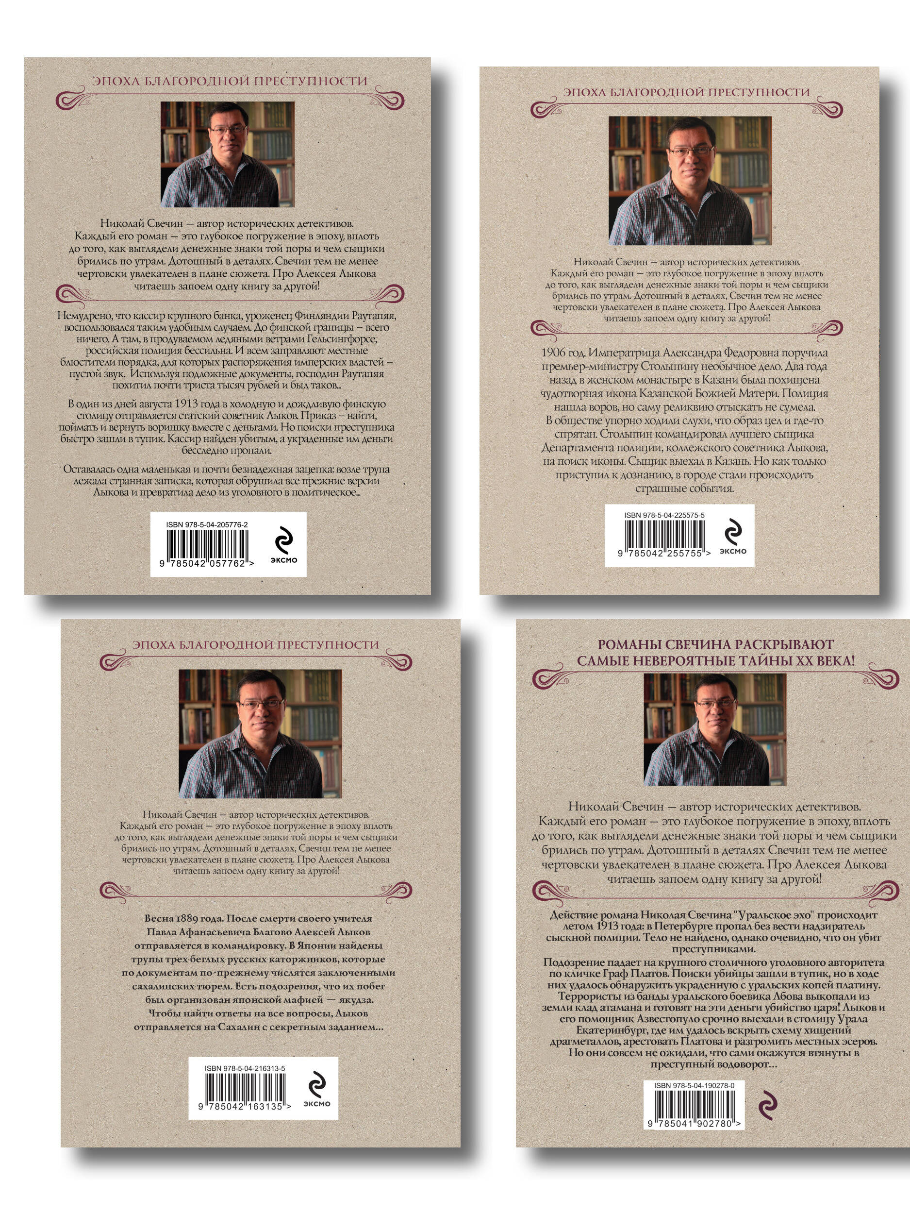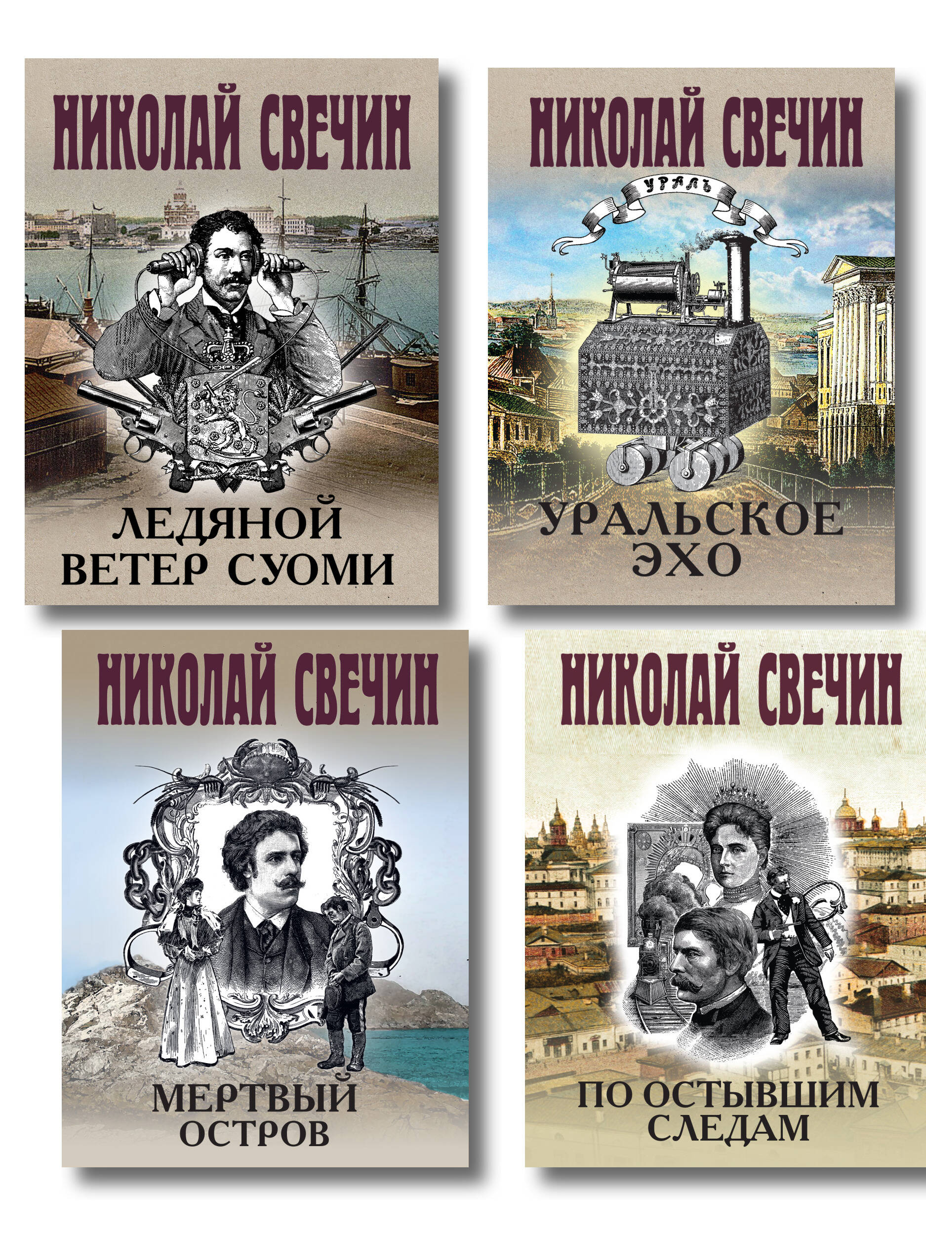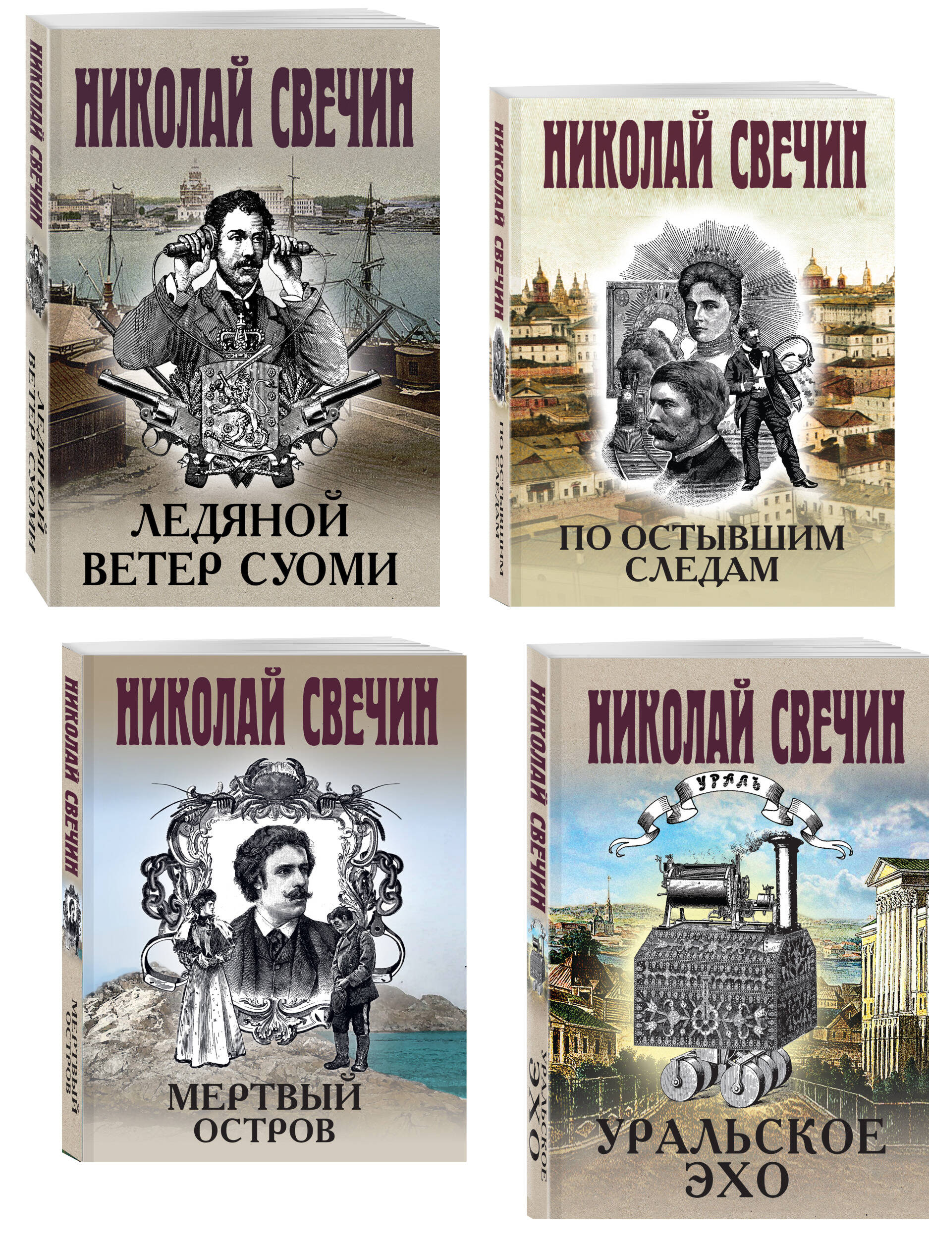 Комплект из 4-х книг («По остывшим следам», «Мертвый остров», «Уральское эхо», «Ледяной ветер Суоми»). «По остывшим следам» Стильная серия модного автора ретро-детективов Николая Свечина. Книга станет подарком для всех ценителей остросюжетного жанра! Николай Свечин - один из самых известных авторов исторических детективов, номинант премии «Русский детектив» и лидер в своей нише. Самая знаменитая серия Свечина - серия про расследования Алексея Лыкова. Она насчитывает уже более 30 романов и сборников, в каждом из которых - отдельная история преступлений, но узнаваемые герои. Эффект остросюжетного сериала. 1906 год. Императрица Александра Федоровна поручила премьер-министру Столыпину необычное дело. Два года назад в женском монастыре в Казани была похищена чудотворная икона Казанской Божией Матери. Полиция нашла воров, но саму реликвию отыскать не сумела. В обществе упорно ходили слухи, что образ цел и где-то спрятан. Столыпин командировал лучшего сыщика Департамента полиции, коллежского советника Лыкова, на поиск иконы. Сыщик выехал в Казань. Но как только приступил к дознанию, в городе стали происходить страшные события. «Мертвый остров» Николай Свечин - один из самых известных авторов исторических детективов, номинант премии «Русский детектив» и лидер в своей нише. Самая знаменитая серия Свечина - серия про расследования Алексея Лыкова. Она насчитывает уже более 20 романов и сборников, в каждом из которых - отдельная история преступлений, но узнаваемые герои. Эффект остросюжетного сериала. Весна 1889 года. После смерти своего учителя Павла Афанасьевича Благово Алексей Лыков отправляется в командировку. В Японии найдены трупы трех беглых русских каторжников, которые по документам по-прежнему числятся заключенными сахалинских тюрем. Есть подозрения, что их побег был организован японской мафией - якудза. Чтобы найти ответы на все вопросы, Лыков отправляется на Сахалин с секретным заданием… Удобное легкое издание малого формата, которое не претендует на место в вашем доме и не захламит книжную полку, но может быть прочитано и передано другому. «Уральское эхо» Захватывающий исторический детектив от победителя премии «Русский детектив» Николая Свечина. Действие романа Николая Свечина «Уральское эхо» происходит летом 1913 года: в Петербурге пропал без вести надзиратель сыскной полиции. Тело не найдено, однако очевидно, что он убит преступниками. Подозрение падает на крупного столичного уголовного авторитета по кличке Граф Платов. Поиски убийцы зашли в тупик, но в ходе них удалось обнаружить украденную с уральских копей платину. Террористы из банды уральского боевика Лбова выкопали из земли клад атамана и готовят на эти деньги убийство царя! Лыков и его помощник Азвестопуло срочно выехали в столицу Урала Екатеринбург, где им удалось вскрыть схему хищений драгметаллов, арестовать Платова и разгромить местных эсеров. Но они совсем не ожидали, что сами окажутся втянуты в преступный водоворот… «Ледяной ветер Суоми» Немудрено, что кассир крупного банка, уроженец Финляндии Раутапяя, воспользовался таким удобным случаем. До финской границы - всего ничего. А там, в продуваемом ледяными ветрами Гелсингфорсе, российская полиция бессильна. И всем заправляют местные блюстители порядка, для которых распоряжения имперских властей - пуст