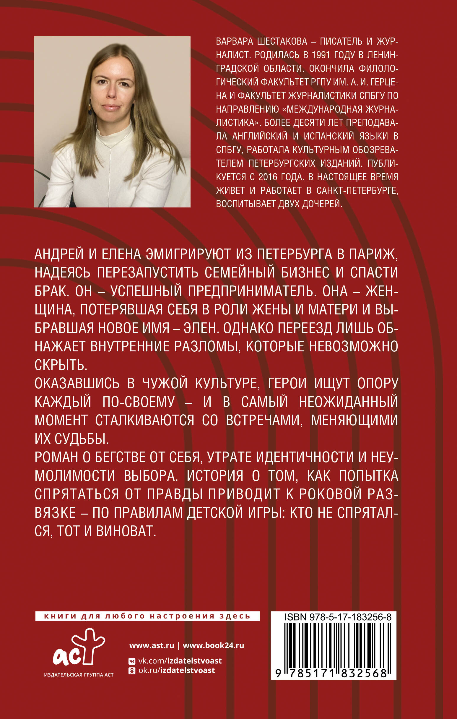 Андрей и Елена эмигрируют из Петербурга в Париж, надеясь перезапустить семейный бизнес и спасти брак. Он - успешный предприниматель. Она - женщина, потерявшая себя в роли жены и матери и выбравшая новое имя - Элен. Однако переезд лишь обнажает внутренние разломы, которые невозможно скрыть. Оказавшись в чужой культуре, герои ищут опору каждый по-своему - и в самый неожиданный момент сталкиваются со встречами, меняющими их судьбы. Роман о бегстве от себя, утрате идентичности и неумолимости выбора. История о том, как попытка спрятаться от правды приводит к роковой развязке - по правилам детской игры: кто не спрятался, тот и виноват.| Издательство | Издательство "АСТ" |