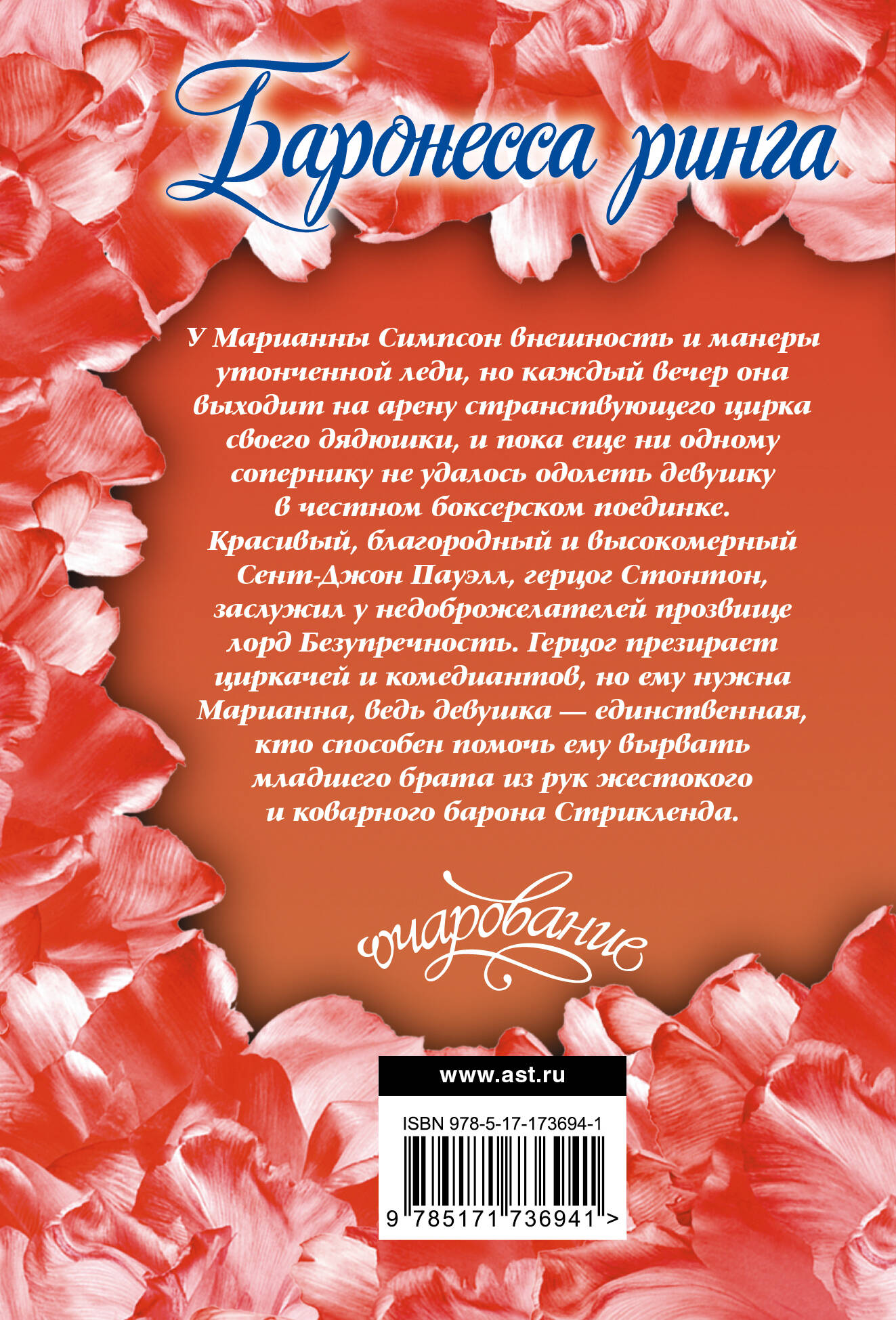 У Марианны Симпсон внешность и манеры утонченной леди, но каждый вечер она выходит на арену странствующего цирка своего дядюшки, и пока еще ни одному сопернику не удалось одолеть девушку в честном боксерском поединке. Красивый, благородный и высокомерный Сент-Джон Пауэлл, герцог Стонтон, заслужил у недоброжелателей прозвище лорд Безупречность. Герцог презирает циркачей и комедиантов, но ему нужна Марианна, ведь девушка - единственная, кто способен помочь ему вырвать младшего брата из рук жестокого и коварного барона Стрикленда.| Издательство | Издательство "АСТ" |