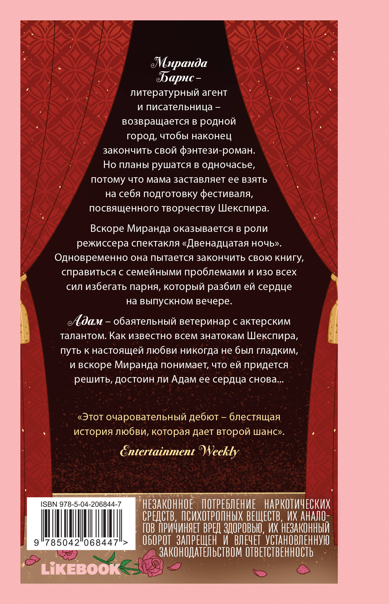 НЕЗАКОННОЕ ПОТРЕБЛЕНИЕ НАРКОТИЧЕСКИХ СРЕДСТВ, ПСИХОТРОПНЫХ ВЕЩЕСТВ, ИХ АНАЛОГОВ ПРИЧИНЯЕТ ВРЕД ЗДОРОВЬЮ, ИХ НЕЗАКОННЫЙ ОБОРОТ ЗАПРЕЩЕН И ВЛЕЧЕТ УСТАНОВЛЕННУЮ ЗАКОНОДАТЕЛЬСТВОМ ОТВЕТСТВЕННОСТЬ. ШЕКСПИРОМАНИЯ, ЛЮБОВЬ И ГРИН ФЛАГ! Поверь, осознание, что кто-то на твоей стороне, очень помогает. Миранда Барнс - литературный агент и писательница возвращается в родной город, чтобы наконец закончить свой фэнтези-роман. Но планы рушатся в одночасье, потому что мама заставляет ее взять на себя подготовку фестиваля, посвященного творчеству Шекспира. Вскоре Миранда оказывается в роли режиссера спектакля «Двенадцатая ночь». Одновременно она пытается закончить свою книгу, справиться с семейными проблемами и изо всех сил избегать парня, который разбил ей сердце на выпускном вечере. Адам - обаятельный ветеринар с актерским талантом. Как известно всем знатокам Шекспира, путь к настоящей любви никогда не был гладким, и вскоре Миранда понимает, что ей придется решить, достоин ли Адам ее сердца снова... Она писательница, он ветеринар; второй шанс; здоровые отношения; исцеляющая любовь; маленький городок с гиперфиксацией на Шекспире; юмор и очень смешные шутки. «Из любви к Барду» - история о том, что настоящая любовь от тебя никогда не уйдет. «Этот очаровательный дебют - блестящая история любви, которая дает второй шанс». - Entertainment Weekly. Перевод с английского Олеси Норицыной. Джессика Мартин - автор сентиментальных романов, в которых сочетаются юмор, драма, приключения и самая настоящая любовь. Понравится поклонникам творчества Эми Эйворд, Елены Армас и Тессы Бейли. Приятная на ощупь бумага, красивая верстка, обложка от известного молодежного художника Caitllin, форзацы от Сати.